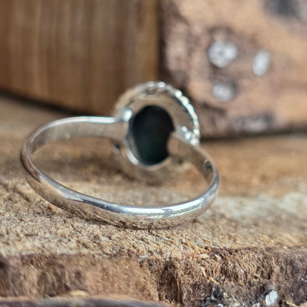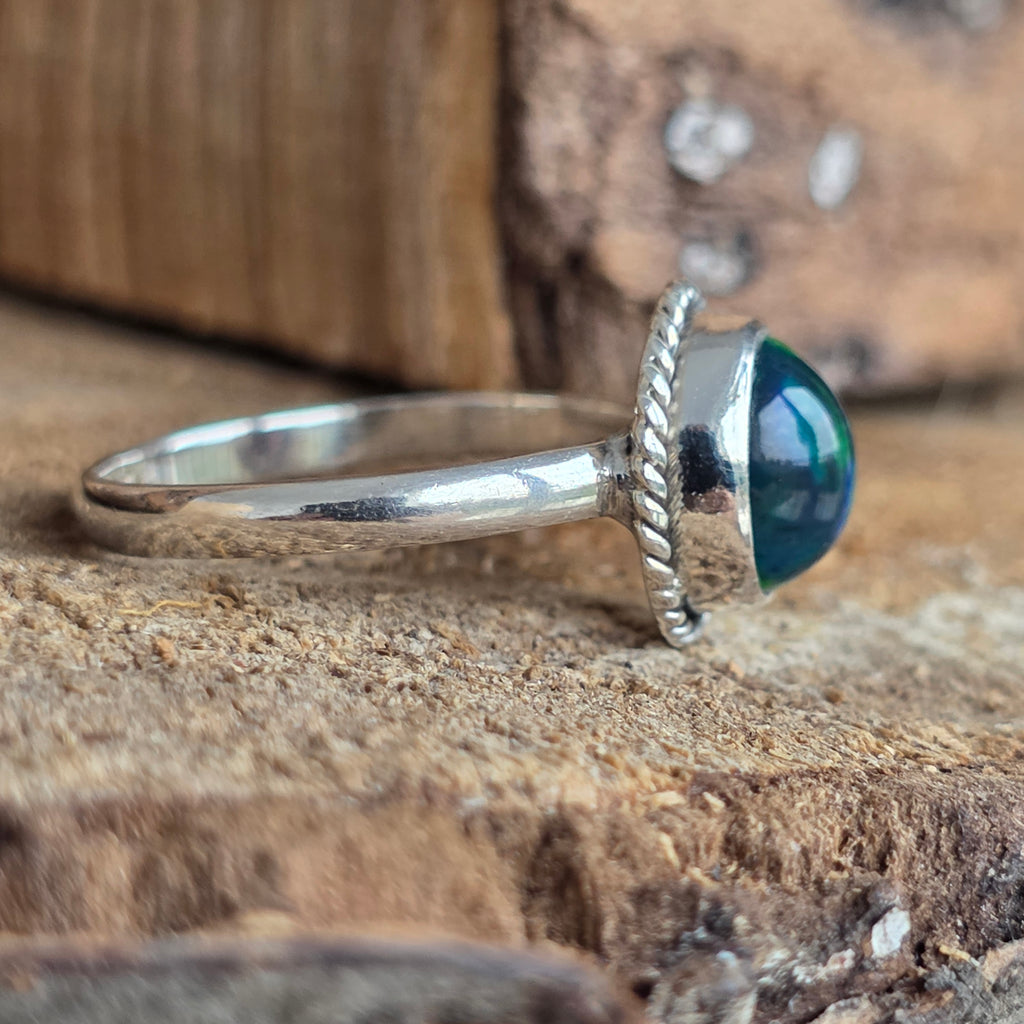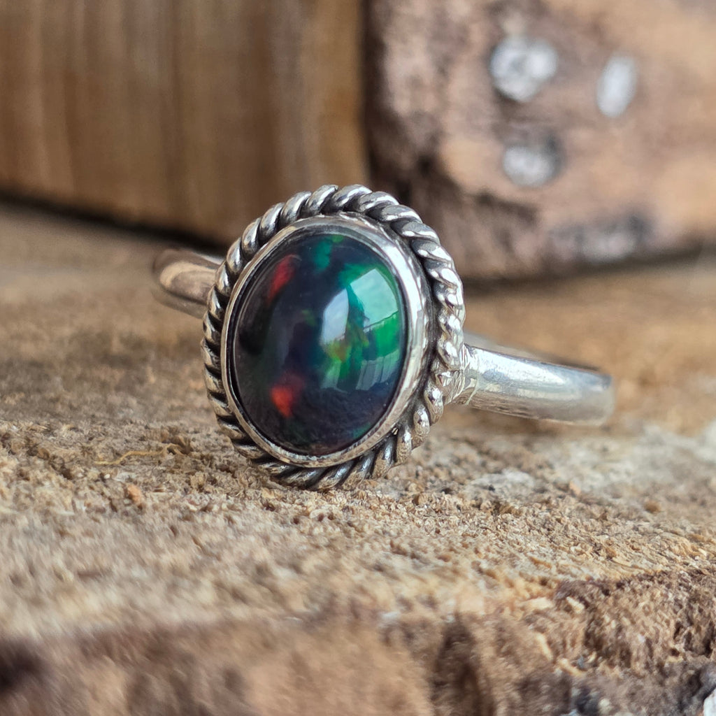 Un inel elegant și rafinat, realizat din argint 925, cu o piatră naturală de opal etiopian, cunoscută pentru reflexele sale irizante în nuanțe de verde, roșu și albastru. Designul minimalist plain wire setting permite pietrei să fie în centrul atenției, captând lumina din orice unghi.