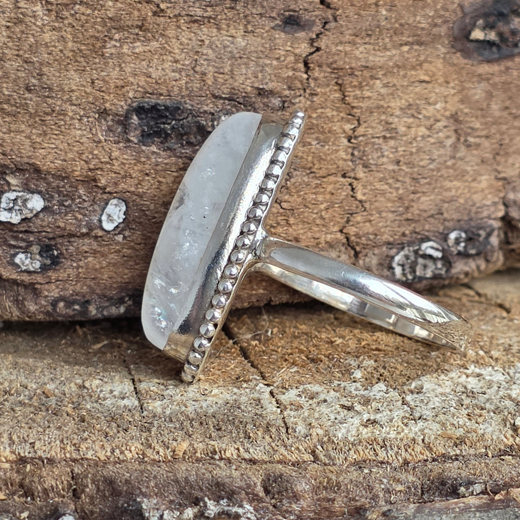 Un inel elegant și luminos din argint 925, cu piatră lunii curcubeu naturală, recunoscută pentru reflexele sale albastre, argintii și sidefii. Designul rawa work lucrat manual pune în evidență forma alungită a pietrei, creând o bijuterie sofisticată și delicată în același timp.