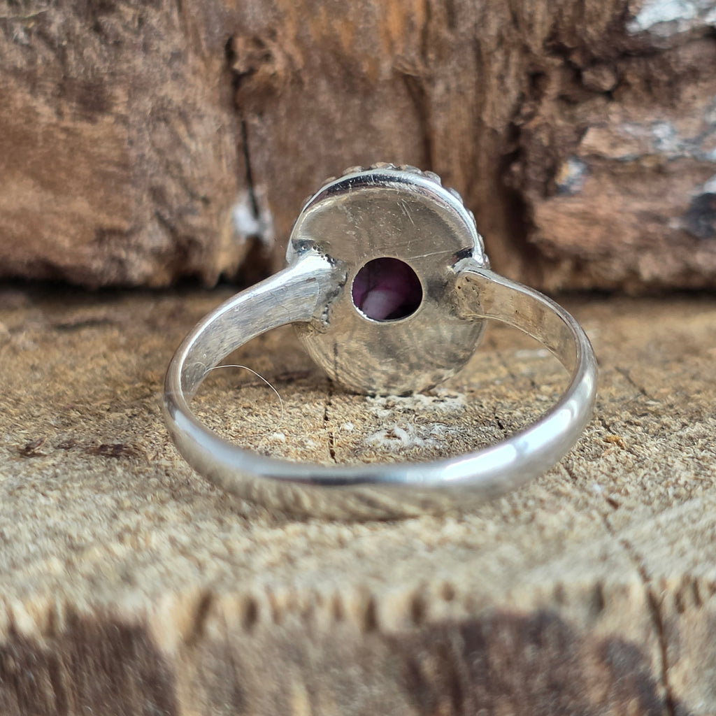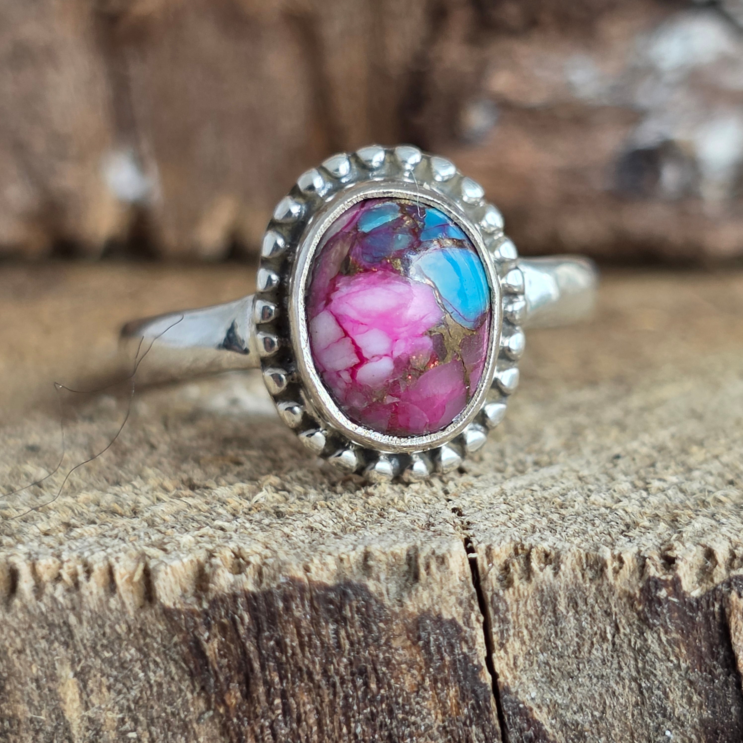 Un inel delicat, dar cu o prezență vibrantă – lucrat manual din argint 925 și înnobilat cu o piatră Pink Dahlia Copper Turquoise, ce îmbină nuanțe vii de fucsia, roz intens, albastru turcoaz și reflexe calde de cupru.