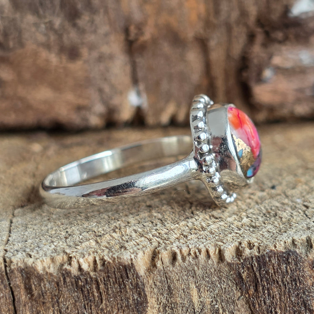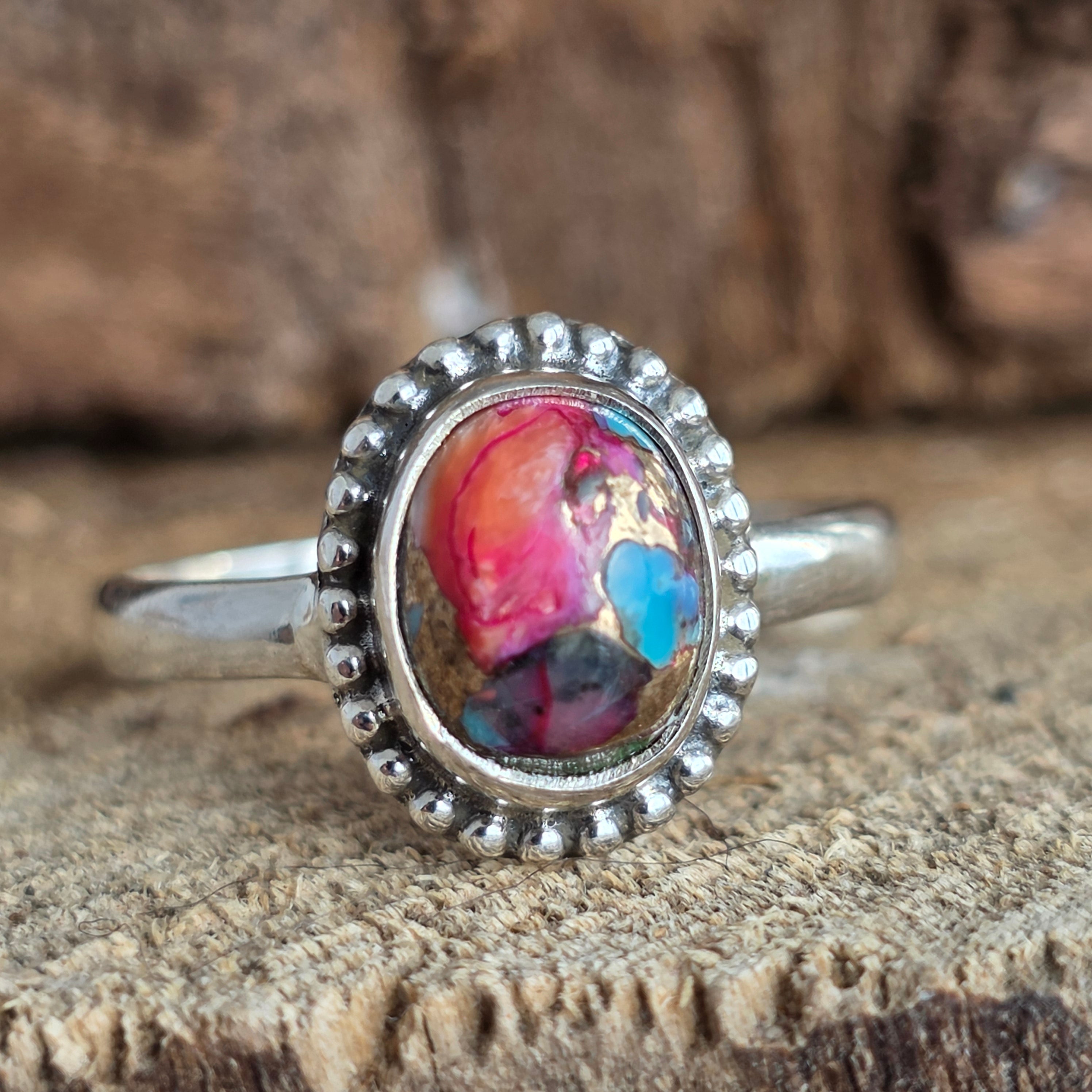 Un inel delicat, dar cu o prezență vibrantă – lucrat manual din argint 925 și înnobilat cu o piatră Pink Dahlia Copper Turquoise, ce îmbină nuanțe vii de fucsia, roz intens, albastru turcoaz și reflexe calde de cupru.