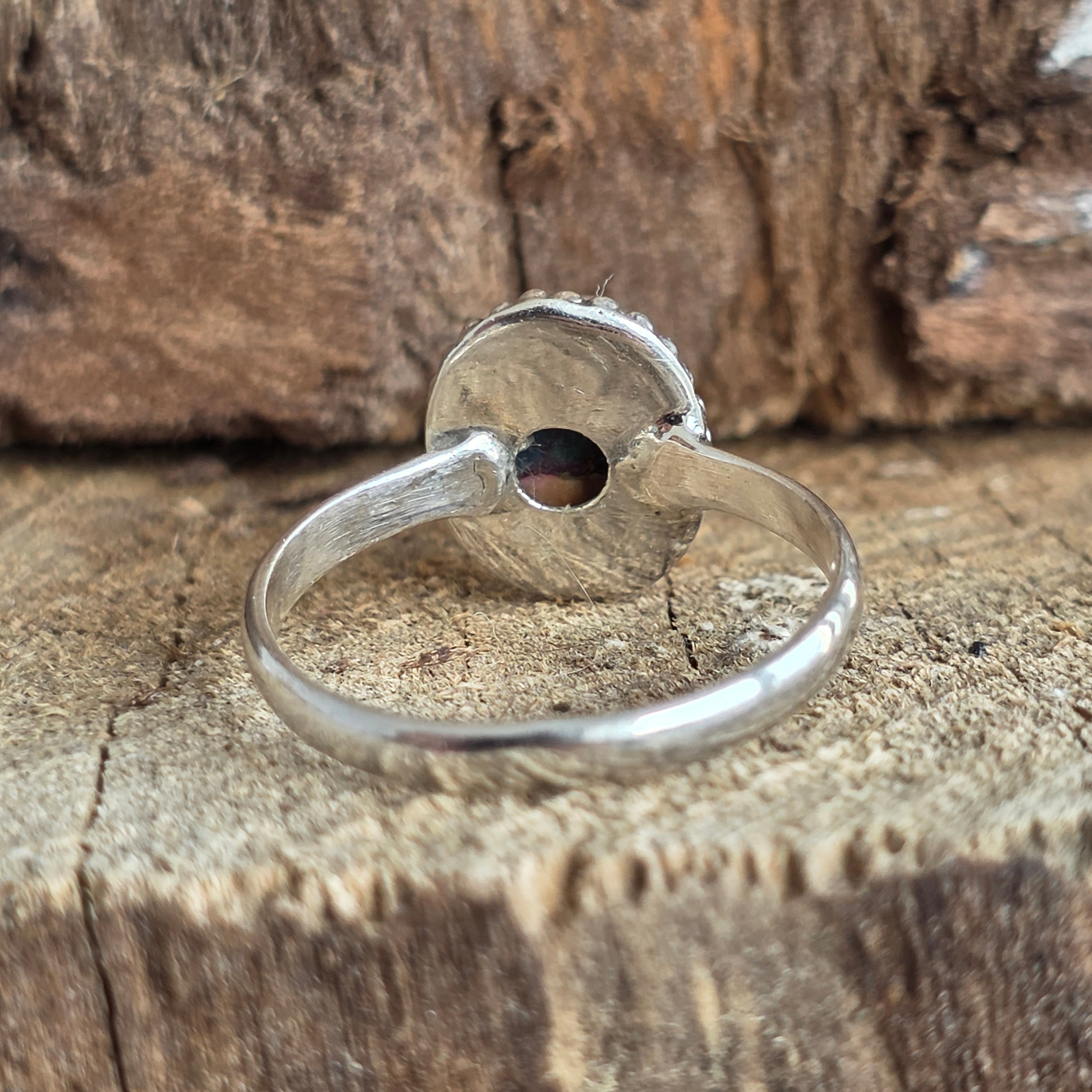 Modelul oval al pietrei este pus în valoare de montura elegantă cu margine granulată, un detaliu inspirat din tehnica tradițională indiană rawa work, care adaugă profunzime și un aer artizanal rafinat.
