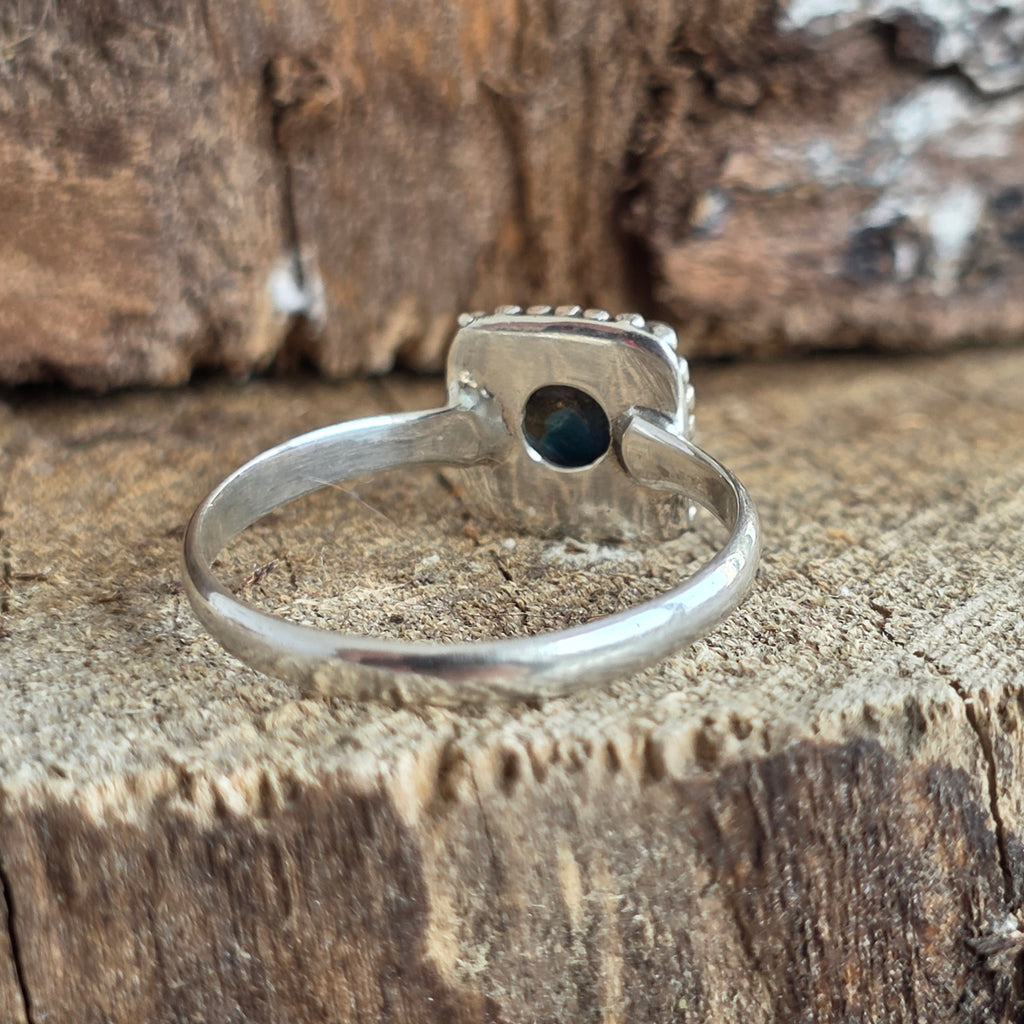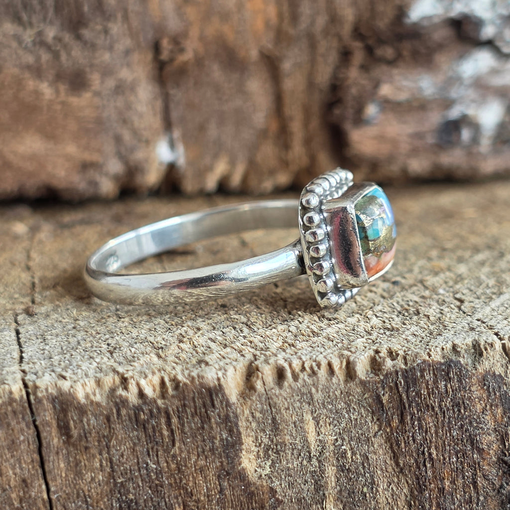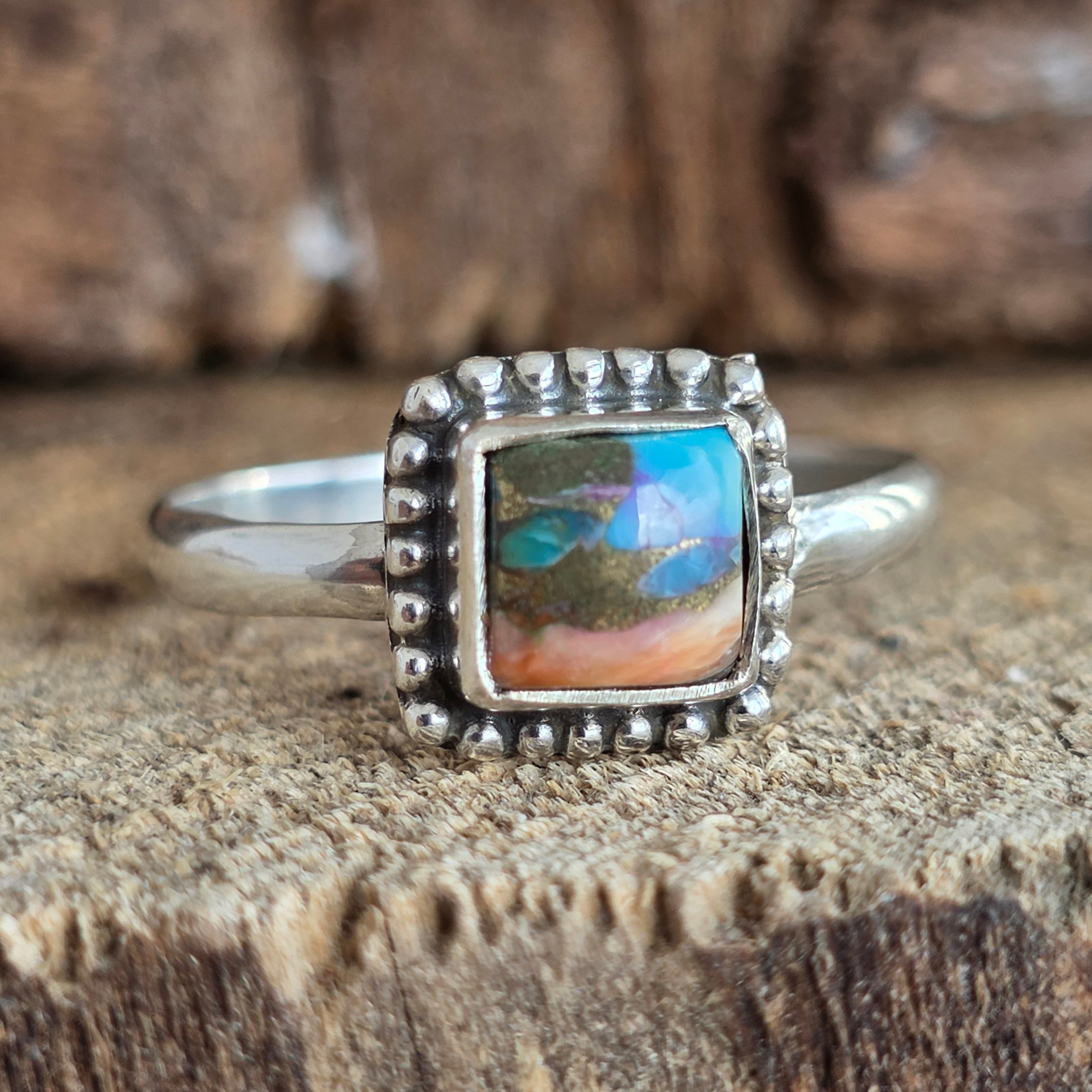 Acest inel din argint 925 aduce în prim-plan o piatră fascinantă – Oyster Copper Turquoise, o combinație naturală de turcoaz, scoică și inserții fine de cupru, ce creează un mozaic viu de culori: albastru cer, portocaliu coral, alb sidefat și reflexe metalice aurii.