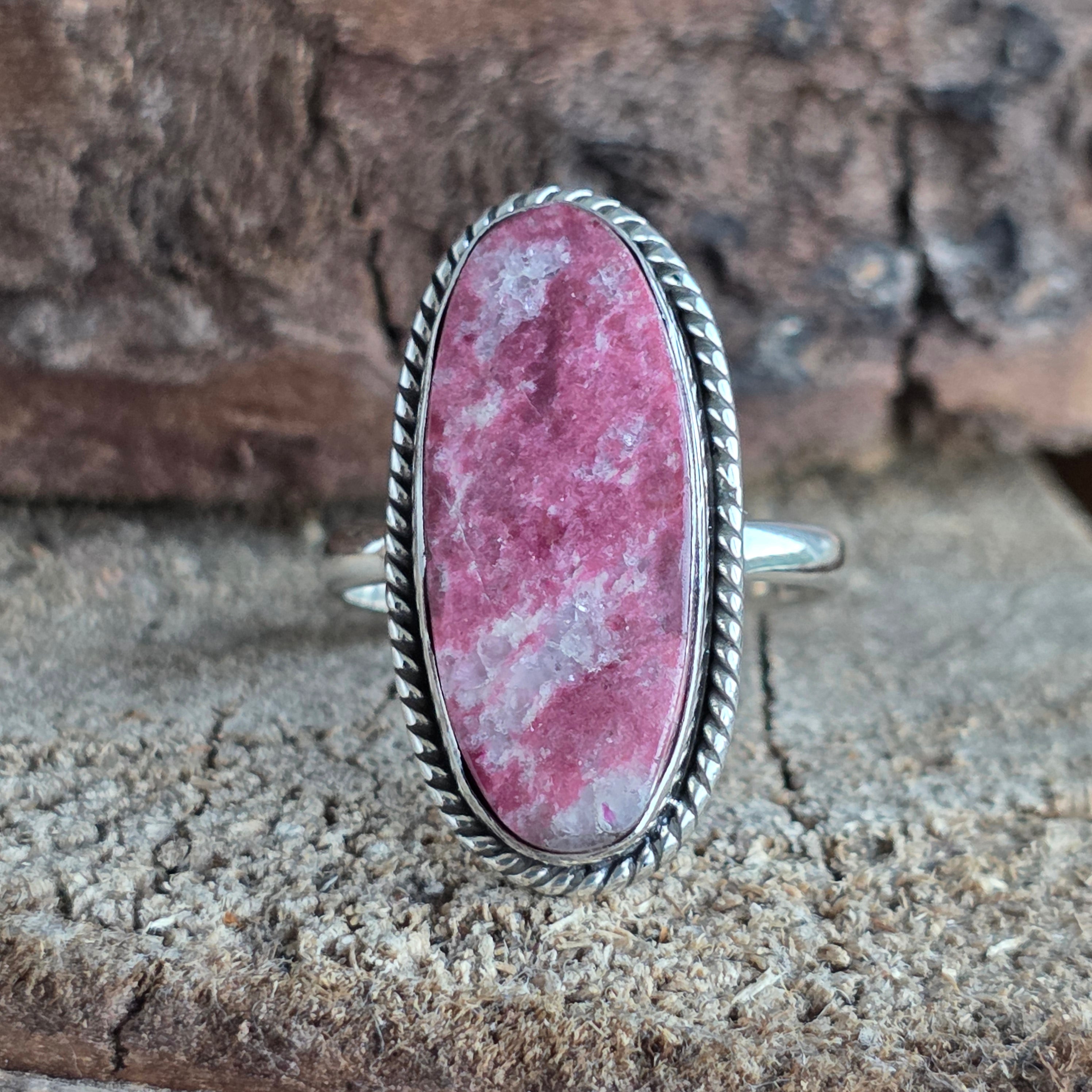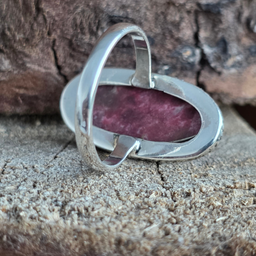 Un inel din argint 925 ce poartă în sine energia pământului nordic – Tulitul, o varietate roz de zoisit, cu textură naturală și variații fine de culoare între roz somon, fucsia și alb calcaros.