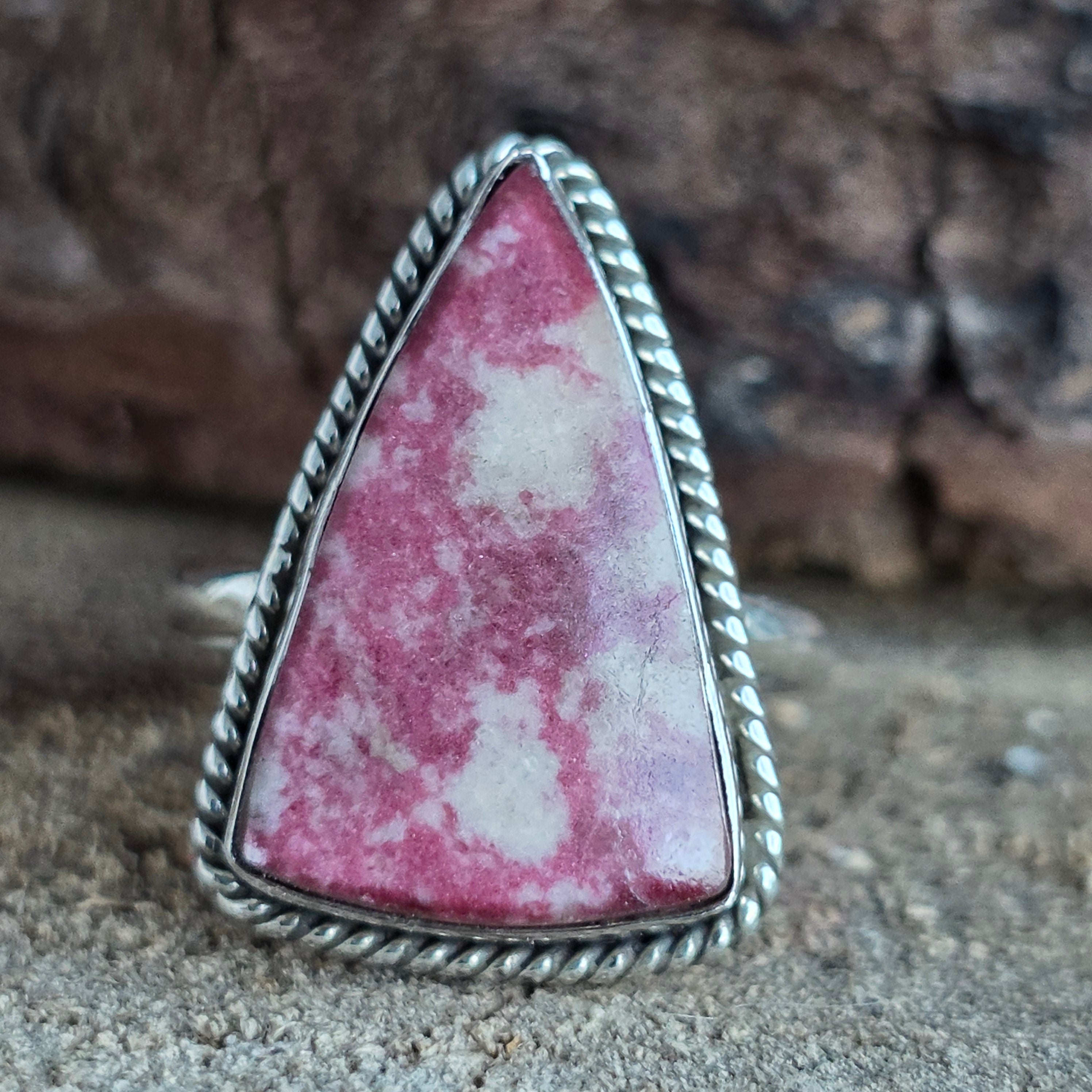 Un inel din argint 925 ce poartă în sine energia pământului nordic – Tulitul, o varietate roz de zoisit, cu textură naturală și variații fine de culoare între roz somon, fucsia și alb calcaros.