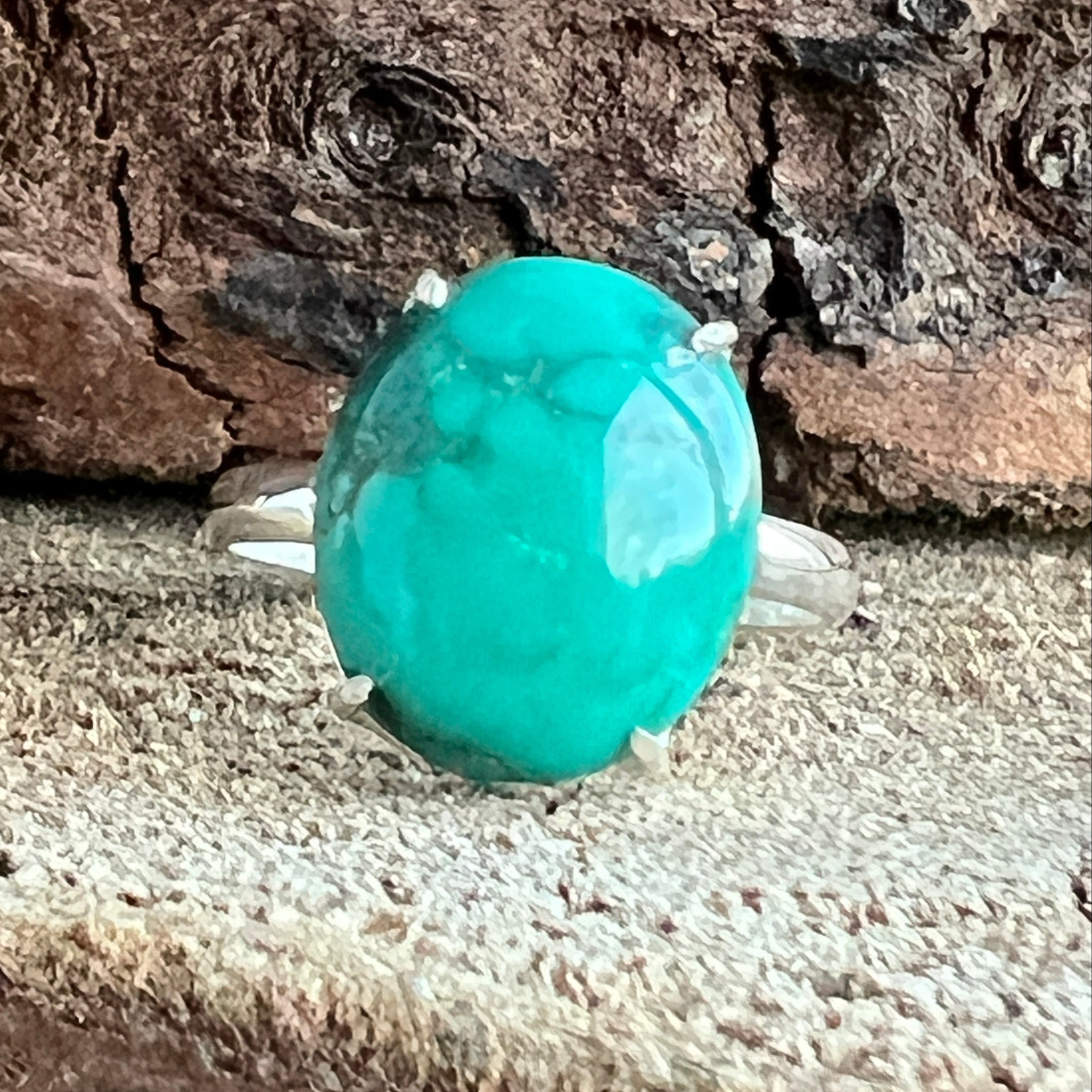 Un inel elegant din argint 925, cu o piatră naturală de turcoaz cu nuanțe variind între albastru cer și verde acvatic, străbătută de vene fine maronii și gri. Designul minimalist tip plain collet lasă întreaga atenție pietrei, punând în valoare frumusețea ei organică și textura autentică.