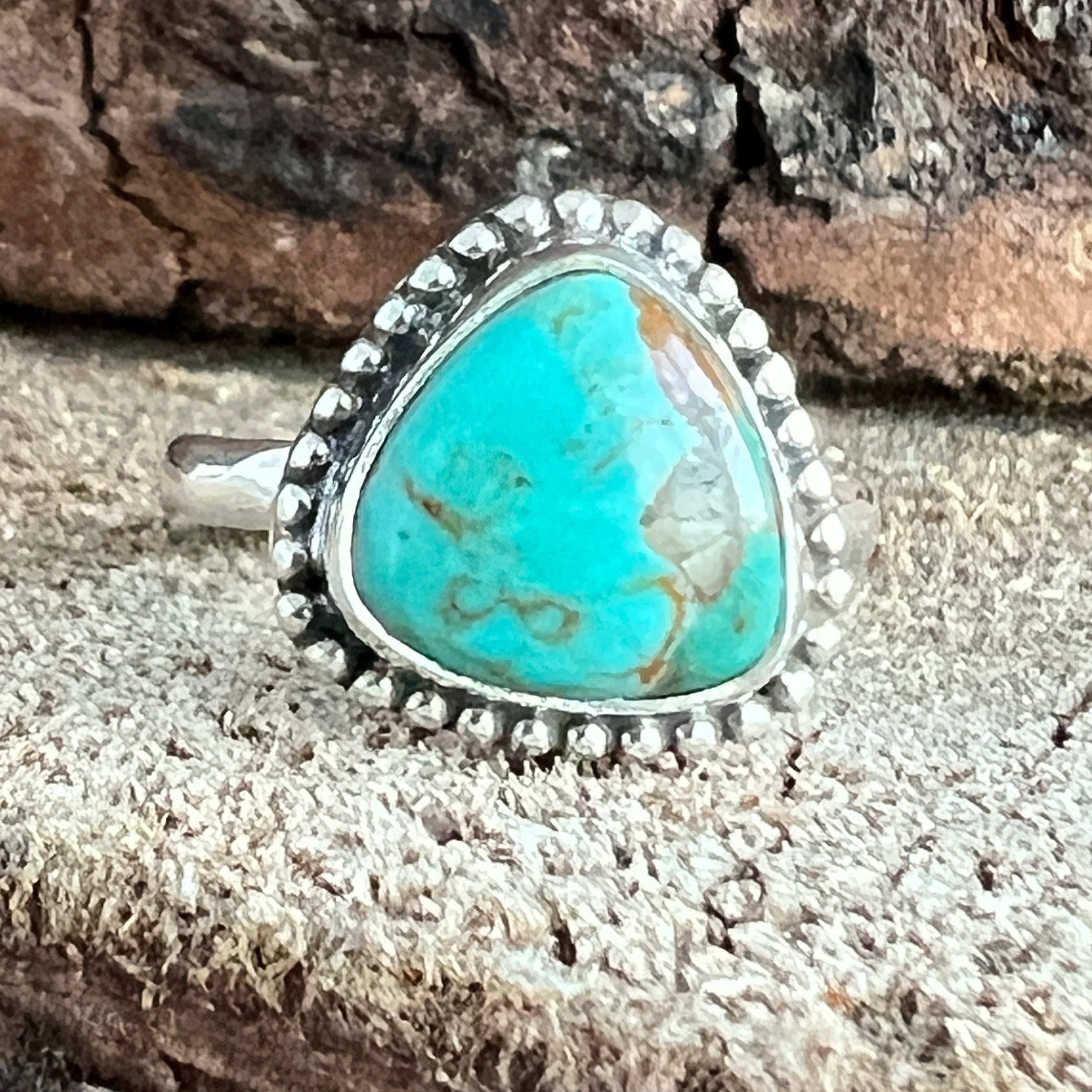 Un inel elegant din argint 925, cu o piatră naturală de turcoaz cu nuanțe variind între albastru cer și verde acvatic, străbătută de vene fine maronii și gri. Designul minimalist tip plain collet lasă întreaga atenție pietrei, punând în valoare frumusețea ei organică și textura autentică.