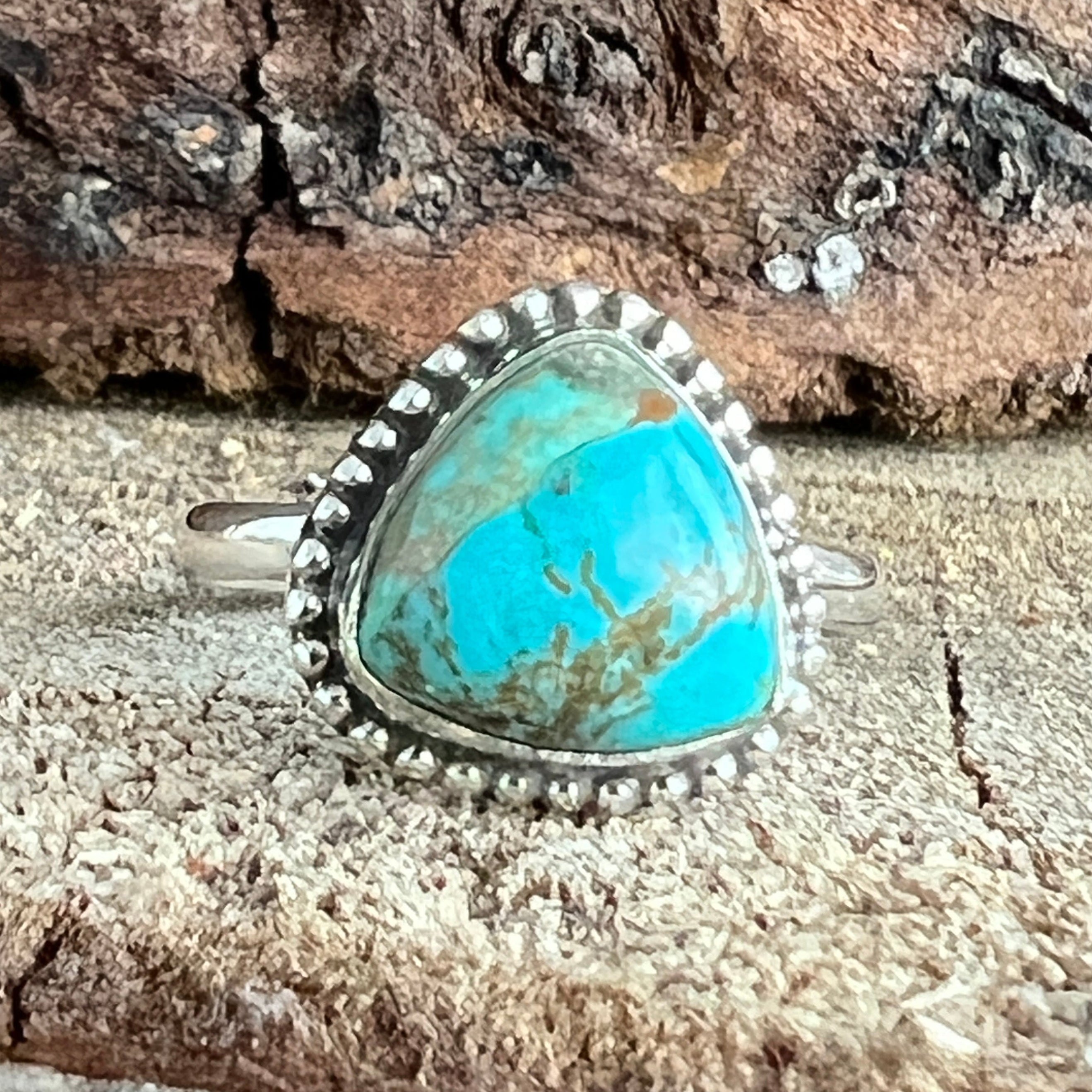 Un inel elegant din argint 925, cu o piatră naturală de turcoaz cu nuanțe variind între albastru cer și verde acvatic, străbătută de vene fine maronii și gri. Designul minimalist tip plain collet lasă întreaga atenție pietrei, punând în valoare frumusețea ei organică și textura autentică.