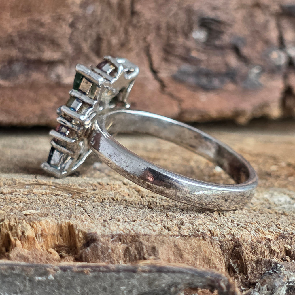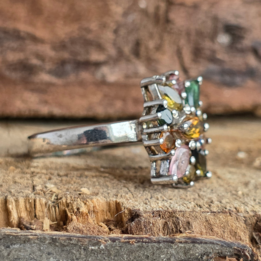 O explozie de culoare și rafinament – acest inel din argint 925 placat cu rodiu aduce la viață spectrul vibrant al turmalinelor naturale, dispuse într-un design floral elegant.
