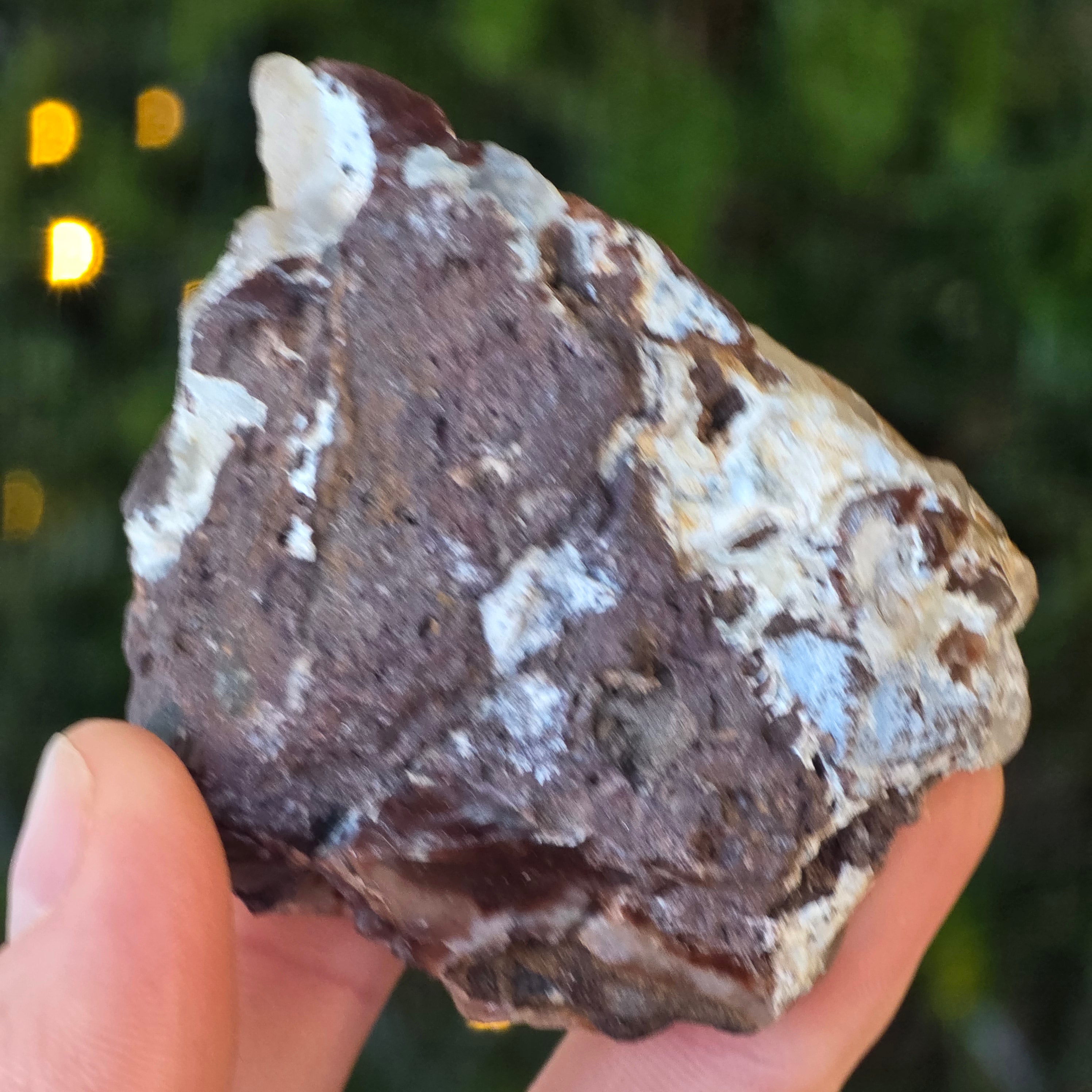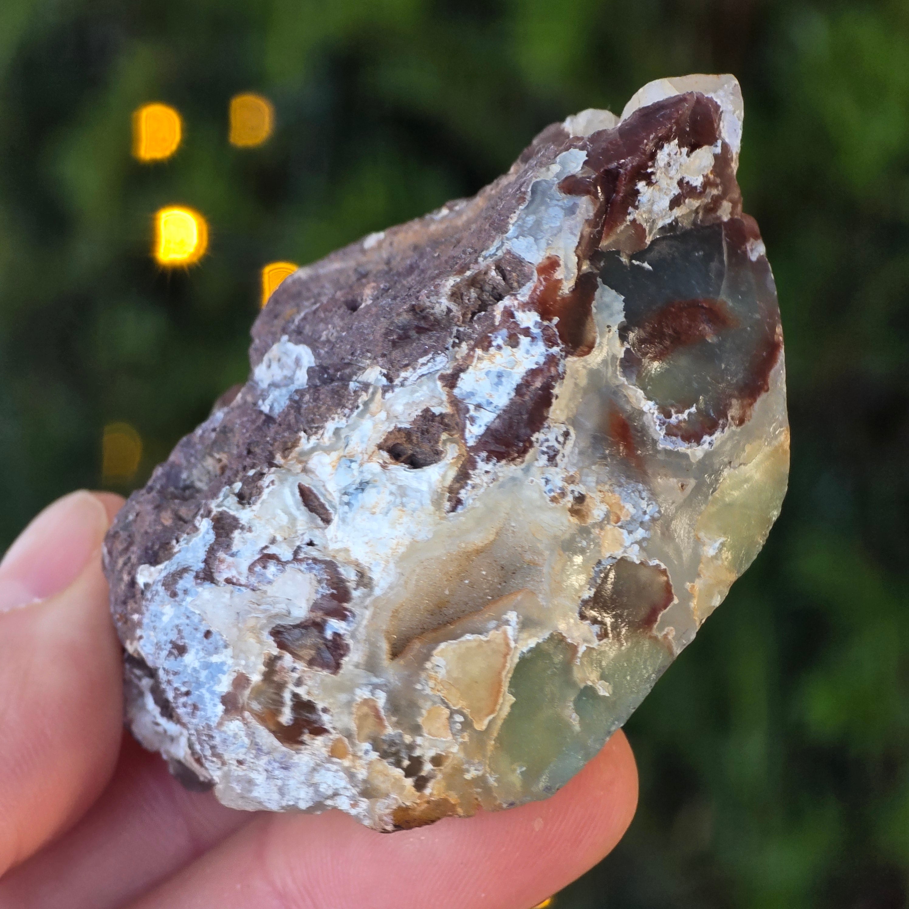 Sa texture est vivante avec des veines de calcedon laiteuses, des tiges discrètes et des taches de rouille matricielles - tous des témoignages d'une formation lente, dans un environnement géologique complexe et plein de tensions.