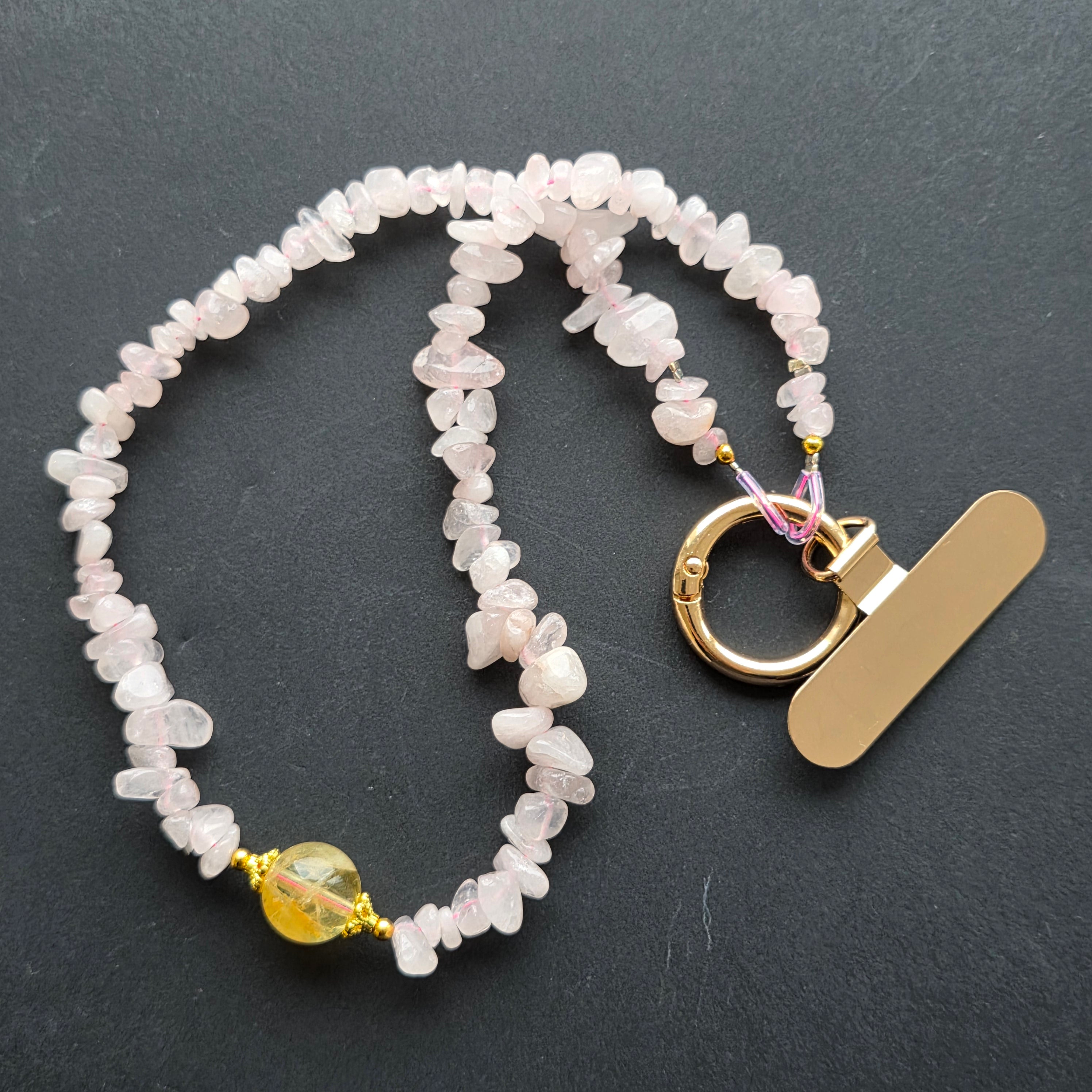 Cuartul roz este piatra blândeții și a echilibrului emoțional, cunoscută pentru energia ei delicată, calmantă și pentru capacitatea de a aduce un plus de armonie în viața de zi cu zi. Chipsurile naturale au o nuanță pastel, luminoasă, care adaugă telefonului un detaliu feminin, cald și elegant.