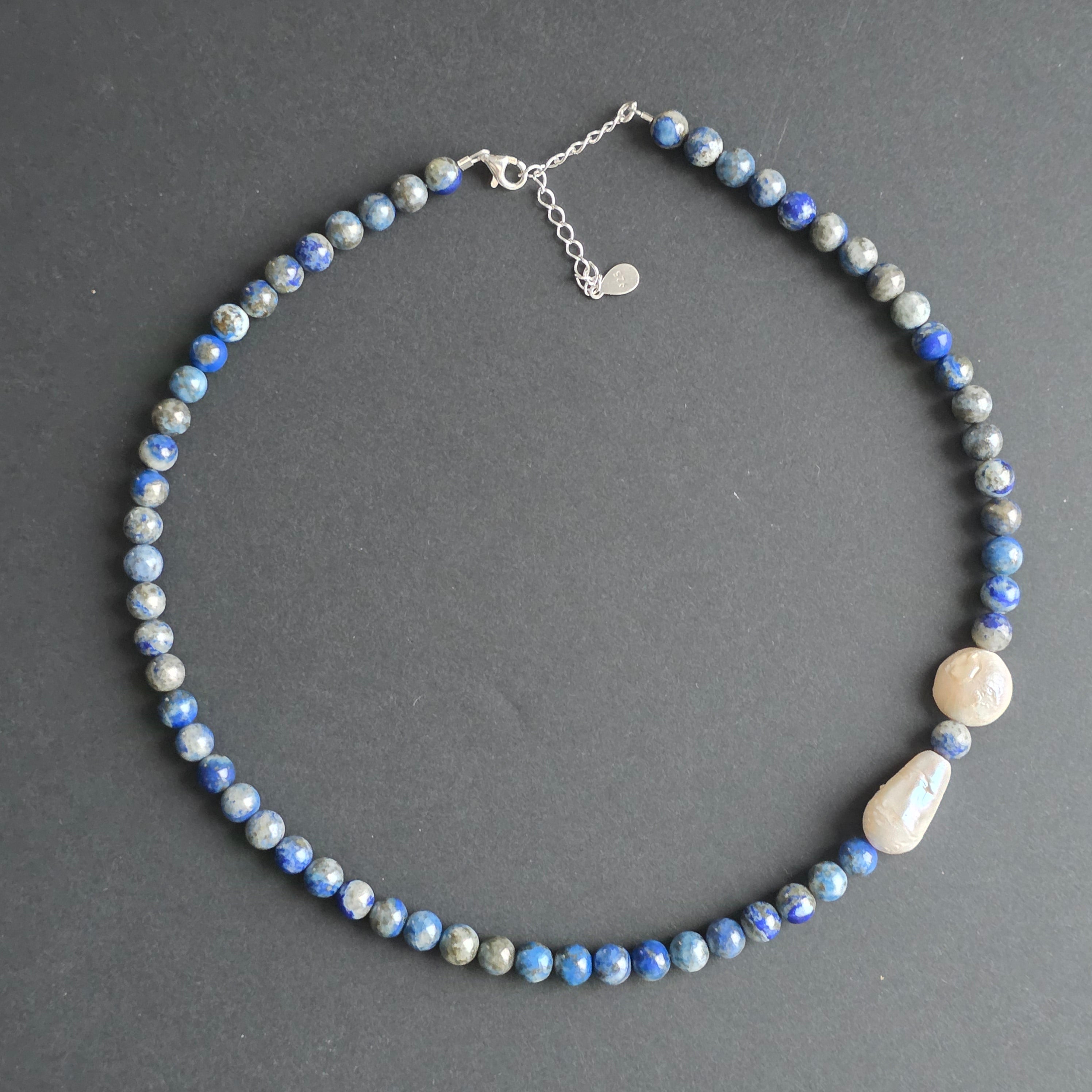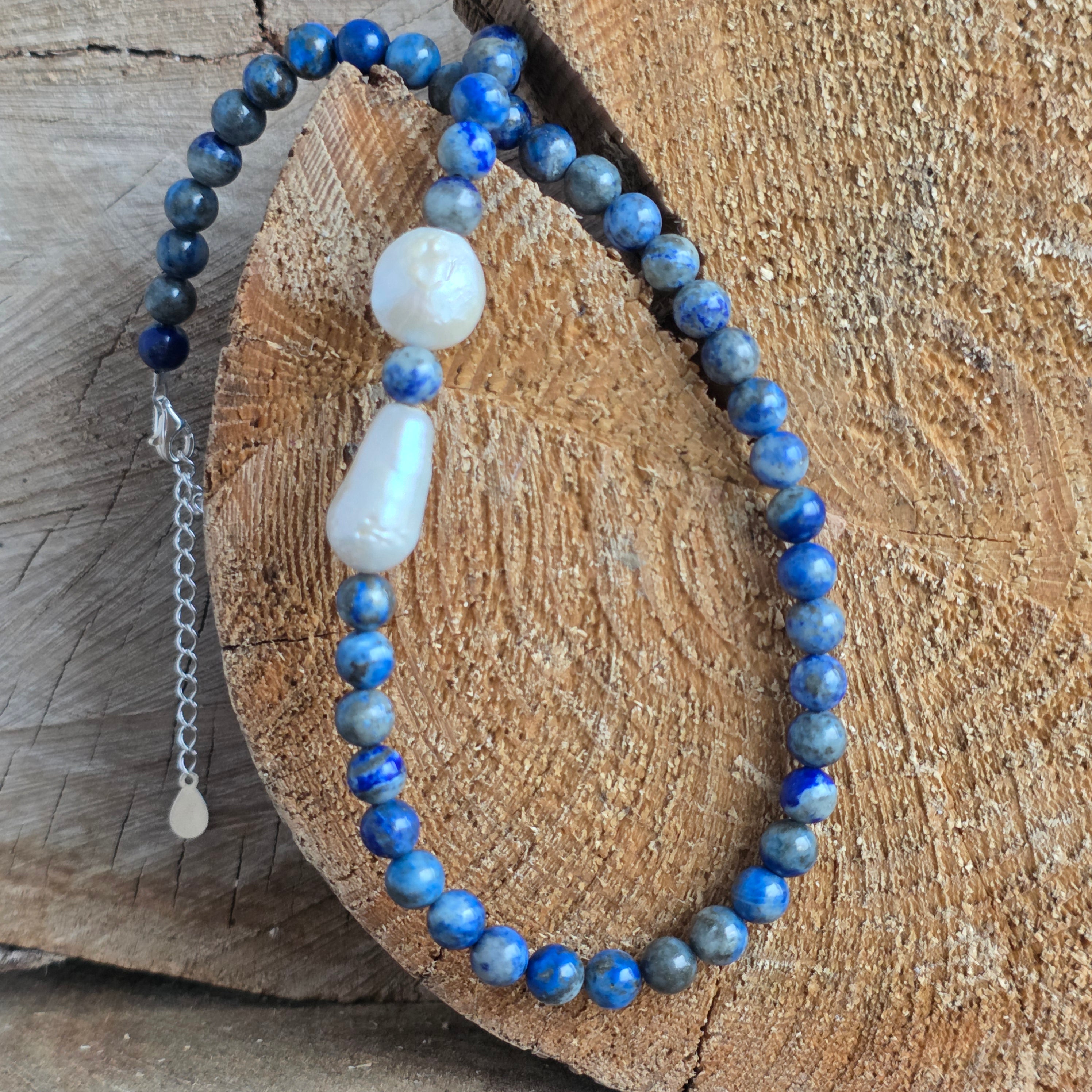 À partir de Lapis lazuli naturel 6 mm, avec ses nuances profondes de bleu et les réflexions en or subtiles de la pyrite, le collier est complété par deux perles naturelles Ce qui ajoute une note de finesse et d'équilibre. Les perles sont soigneusement placées pour mettre en évidence la beauté naturelle des genoux et ajouter un contraste raffiné.
