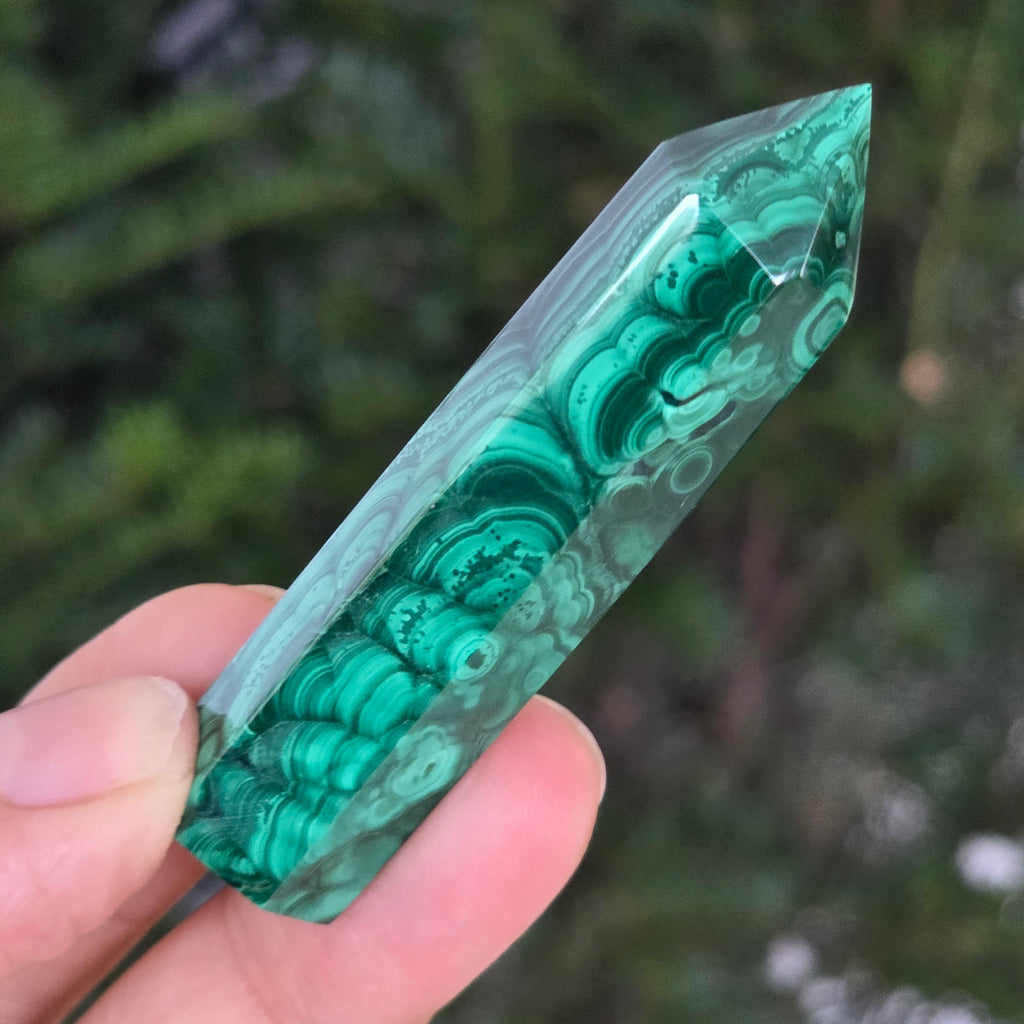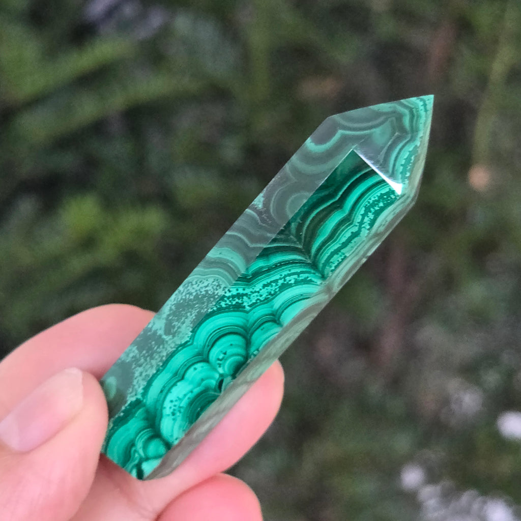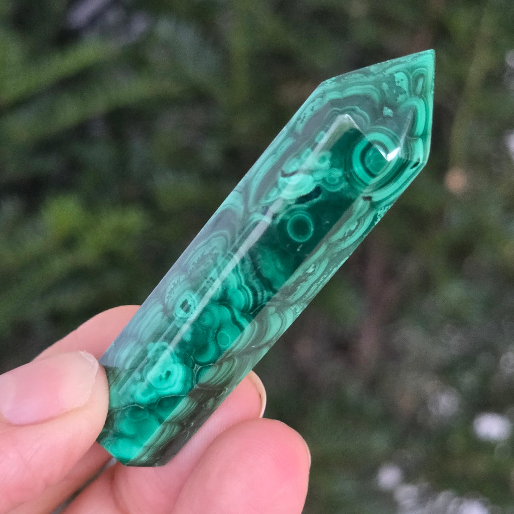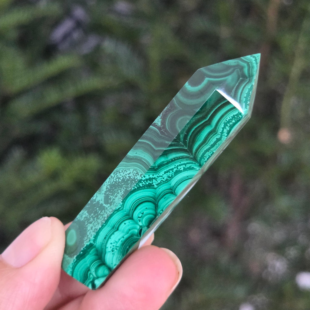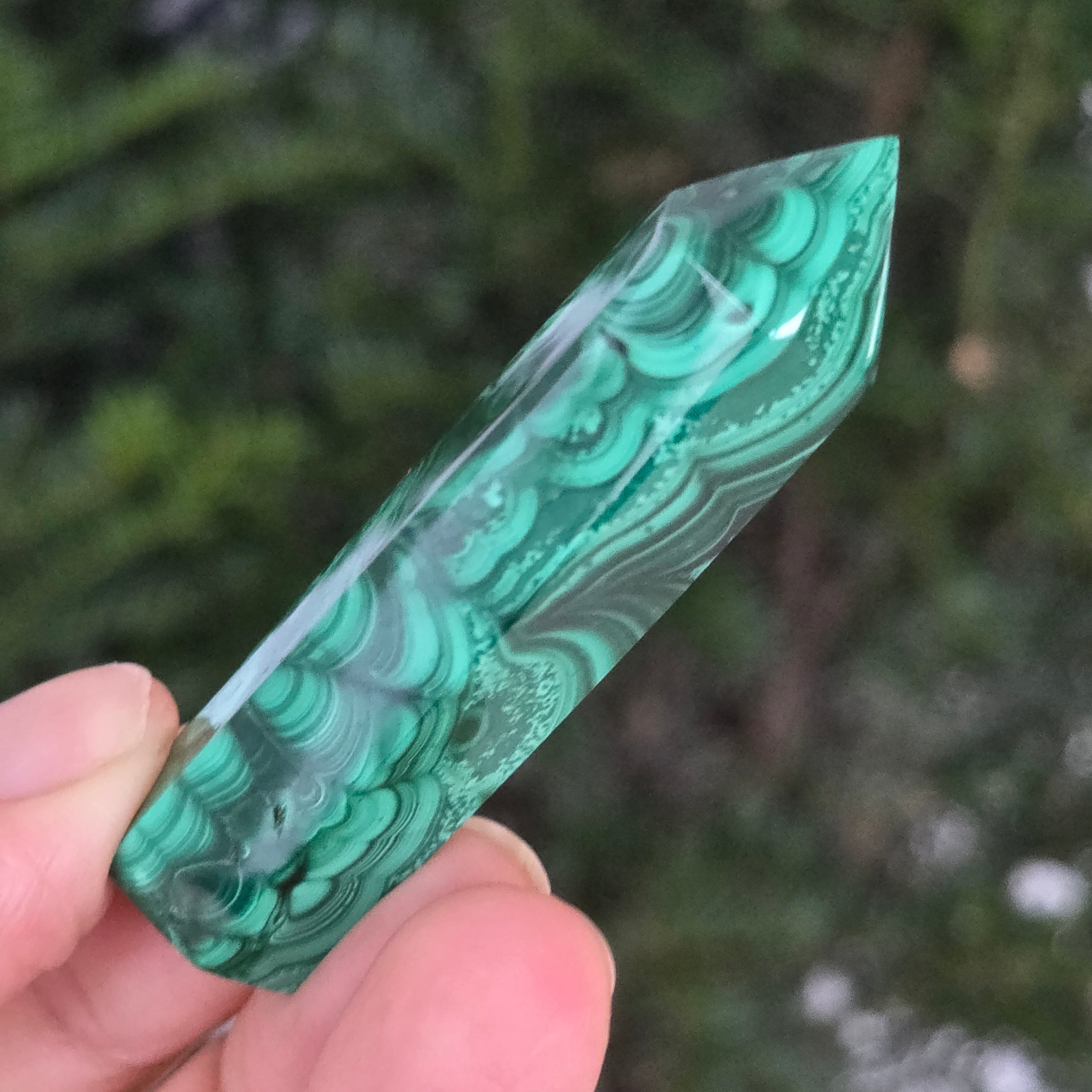 Un obelisc ce pare să fi prins viață din adâncurile verzi ale planetei. Această piesă unicat din malachit natural, dezvăluie straturi fascinante de verde smarald, verde închis și nuanțe mătăsoase de jad, dispuse în modele concentrice unice, ca niște hărți ale energiilor interioare. Polişat manual până la o strălucire catifelată, obeliscul emană o eleganță minerală profundă.
