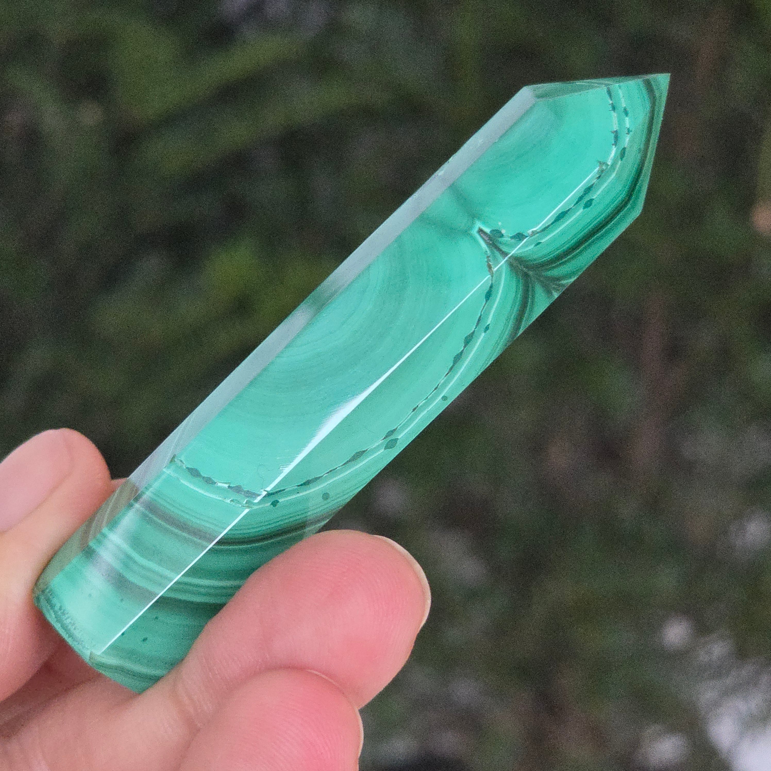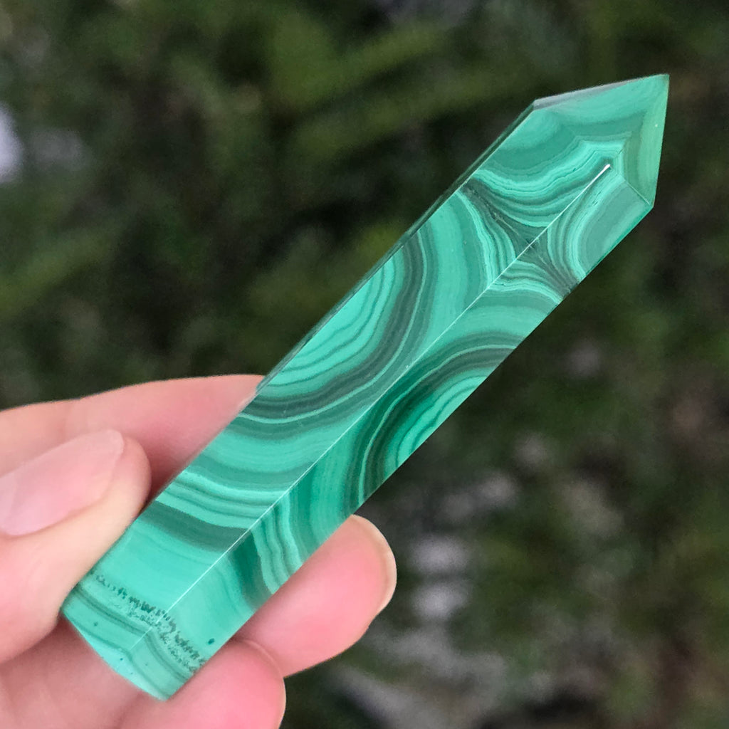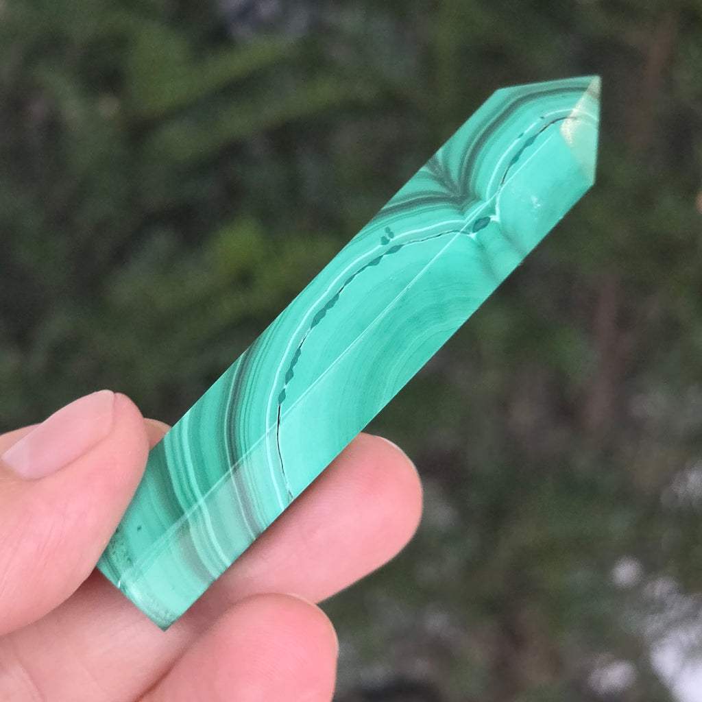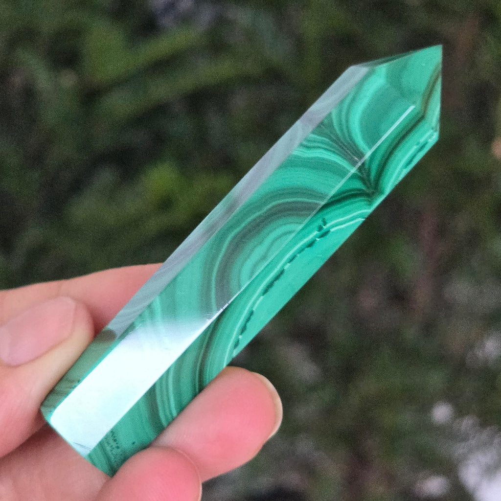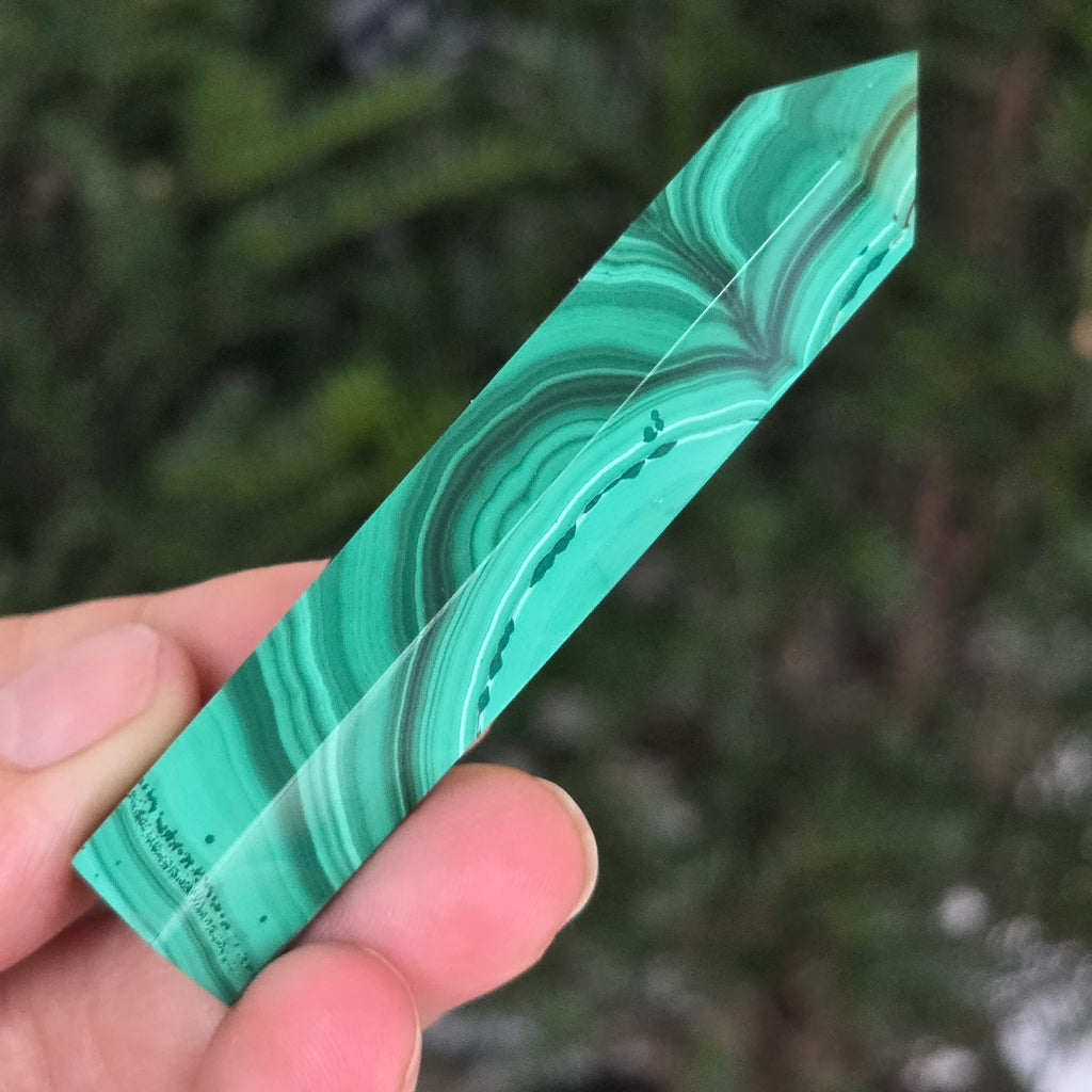 Un obelisc ce pare să fi prins viață din adâncurile verzi ale planetei. Această piesă unicat din malachit natural, dezvăluie straturi fascinante de verde smarald, verde închis și nuanțe mătăsoase de jad, dispuse în modele concentrice unice, ca niște hărți ale energiilor interioare. Polişat manual până la o strălucire catifelată, obeliscul emană o eleganță minerală profundă.