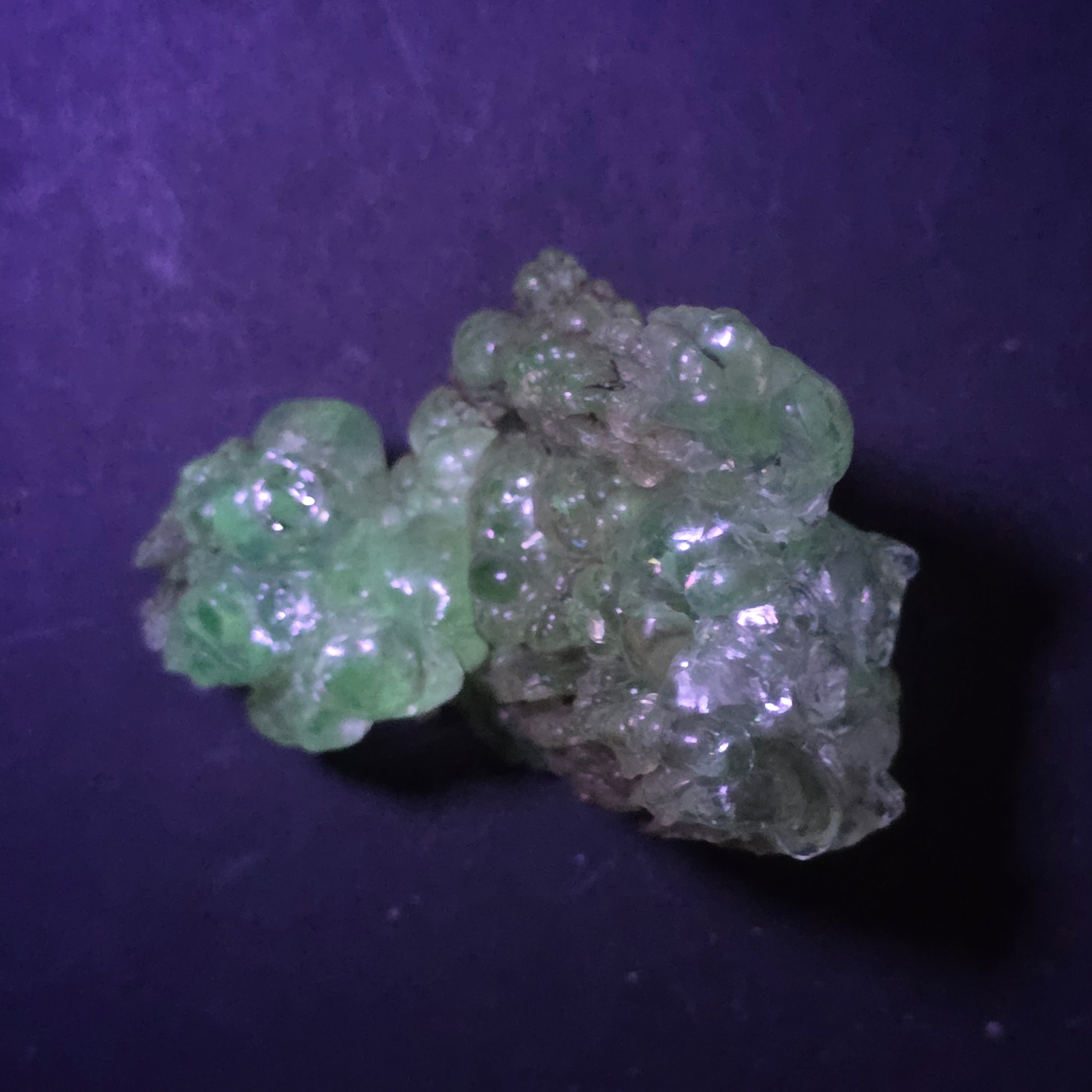 În lumină naturală, opalul hialit apare incolor până la alb-translucid, cu un aspect discret și elegant. Sub lumină ultravioletă însă, mineralul se transformă complet, emițând o strălucire verde neon, puternică și uniformă, efect care îl face extrem de căutat de colecționari. Această fluorescență se datorează urmelor naturale de uraniu din structura sa, prezente în cantități foarte mici și stabile.