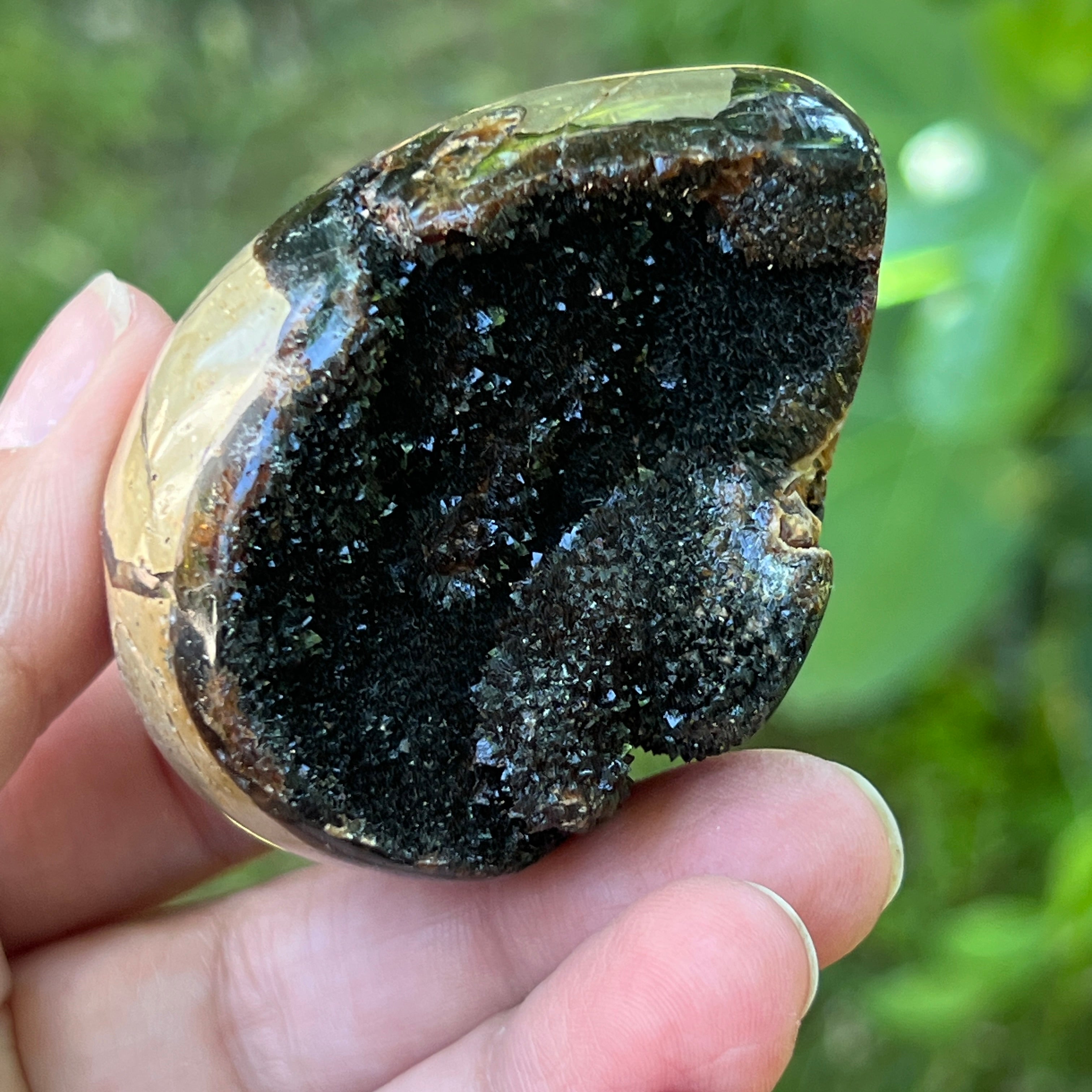 Septaria est composée de calcite, de limonite, de gypse et de barititine, minéraux qui forment un jeu unique dans cette pierre et lui donnent un look spécial.