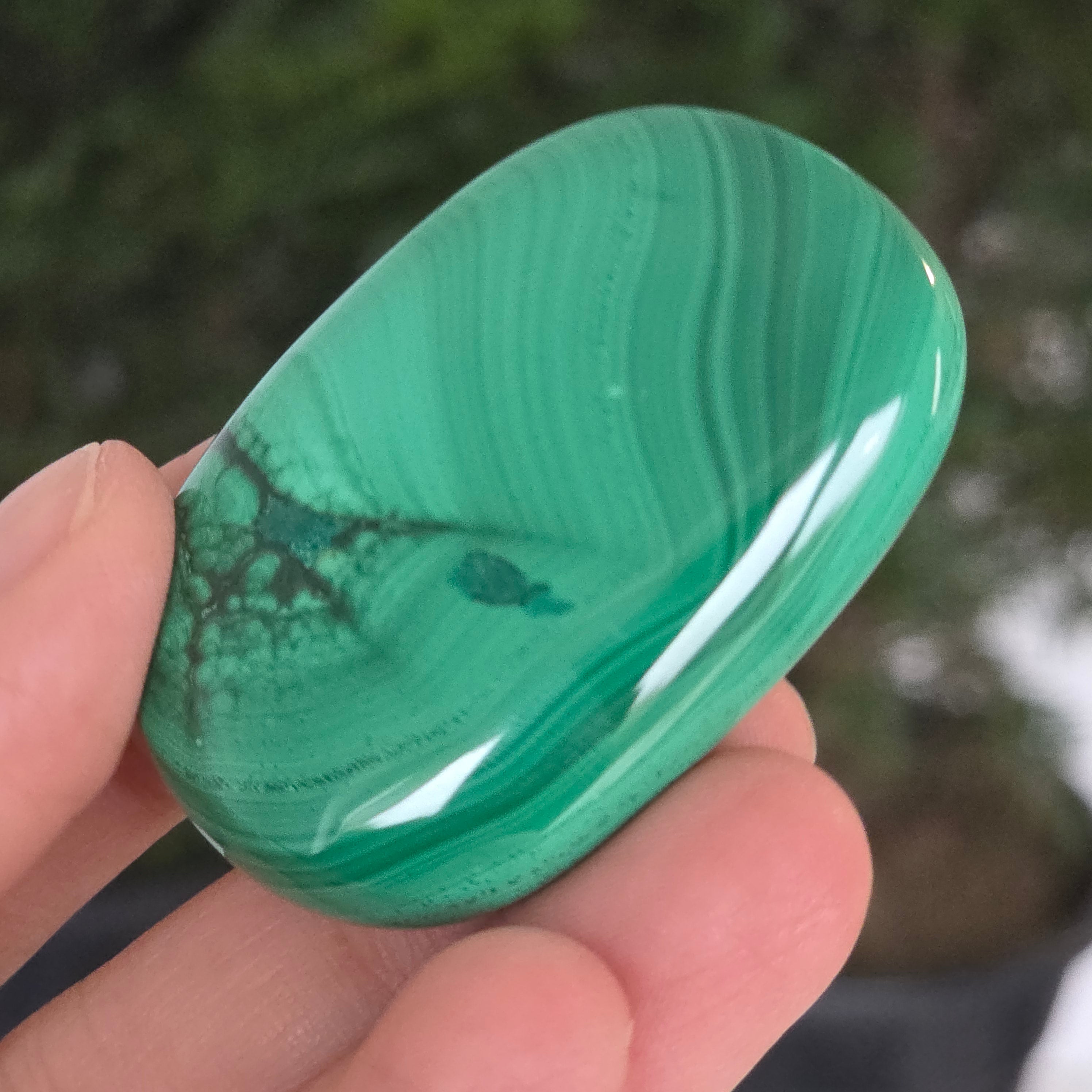 Un palmstone care pare să respire cu energia Pământului viu. Această piesă unicat din malachit natural, dezvăluie ondulații hipnotice de verde intens și smarald, traversate de inele și benzi concentrice ce par sculptate de însăși natura. Textura netedă, perfect șlefuită, face ca piatra să se așeze plăcut în palmă, emanând o vibrație caldă și protectoare.