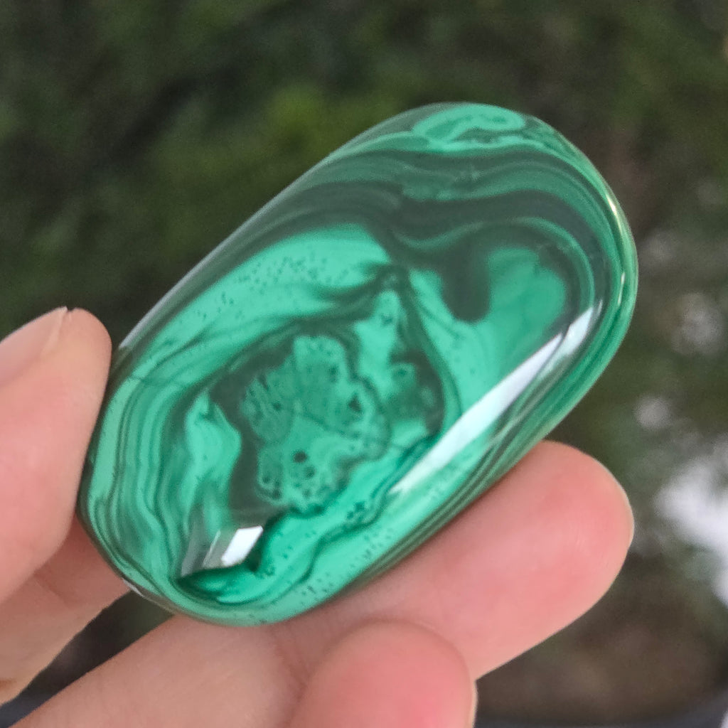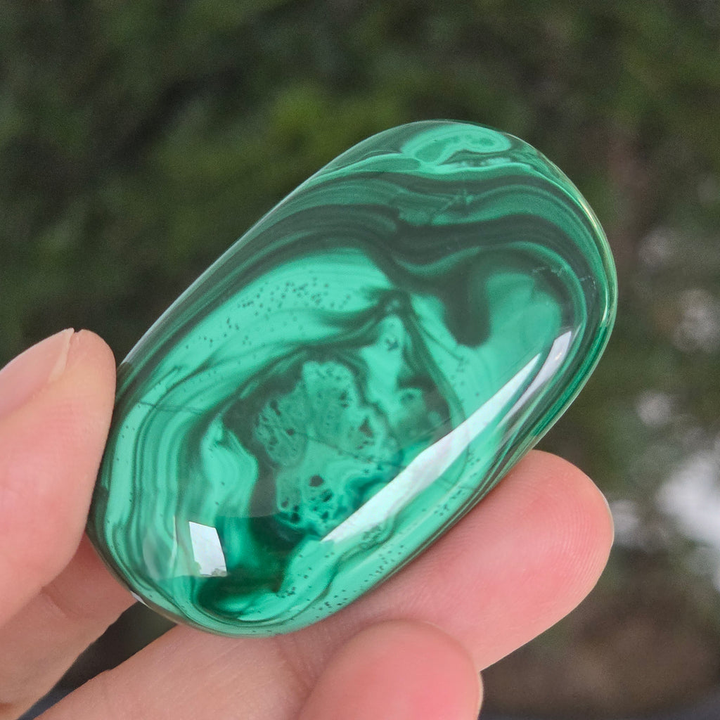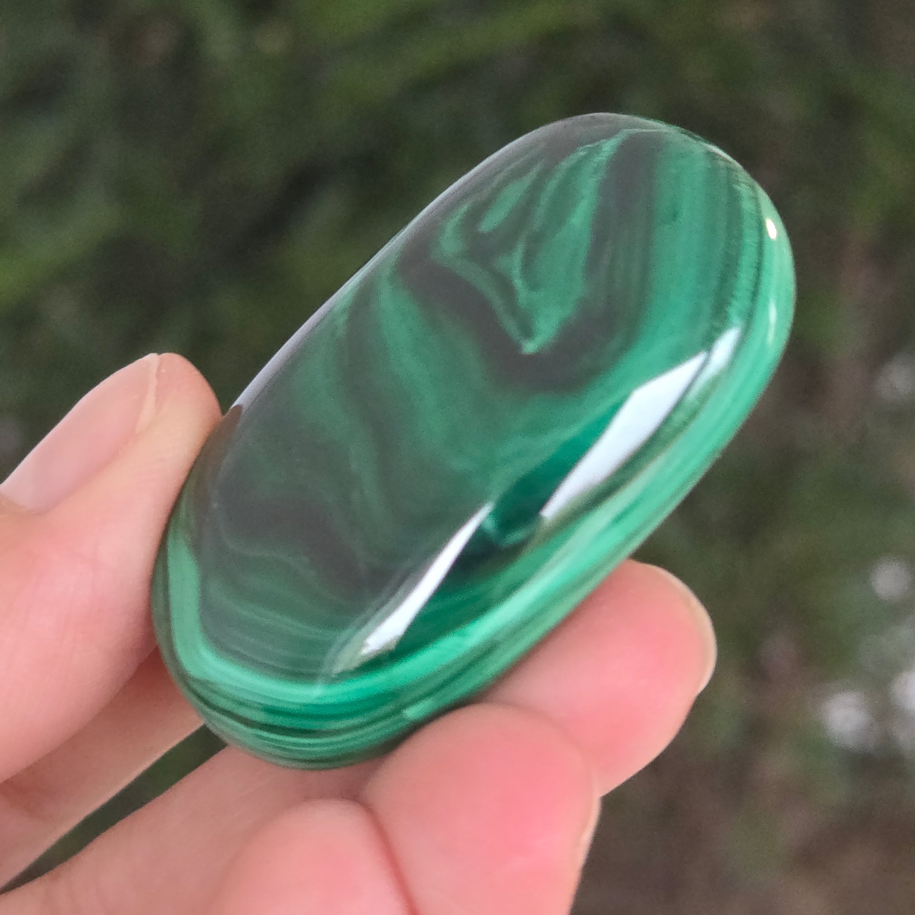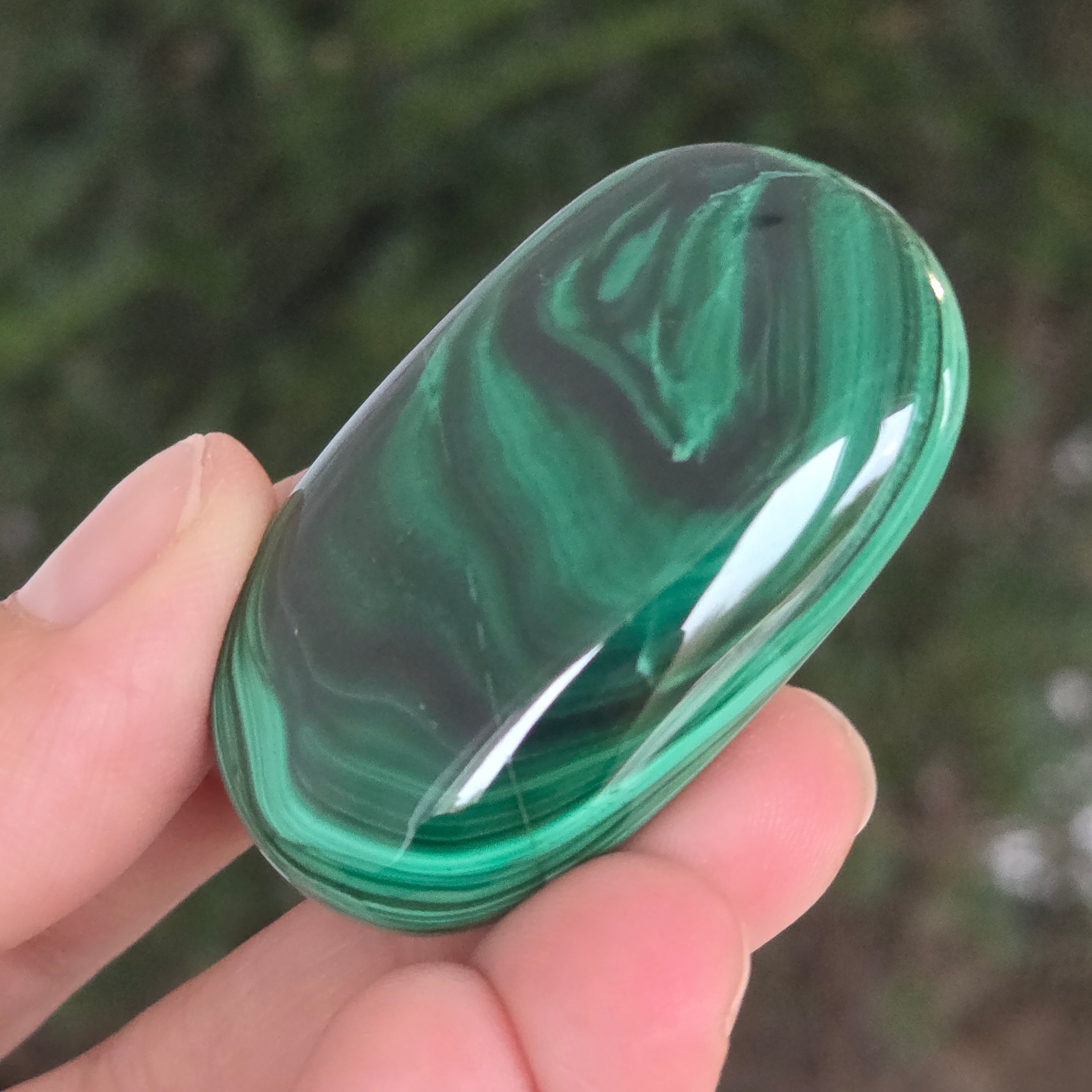 Un palmstone care pare să respire cu energia Pământului viu. Această piesă unicat din malachit natural, dezvăluie ondulații hipnotice de verde intens și smarald, traversate de inele și benzi concentrice ce par sculptate de însăși natura. Textura netedă, perfect șlefuită, face ca piatra să se așeze plăcut în palmă, emanând o vibrație caldă și protectoare.