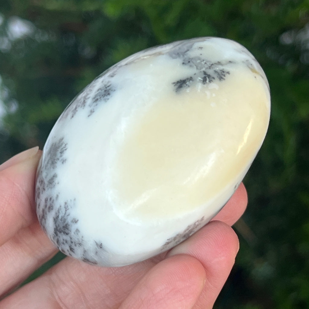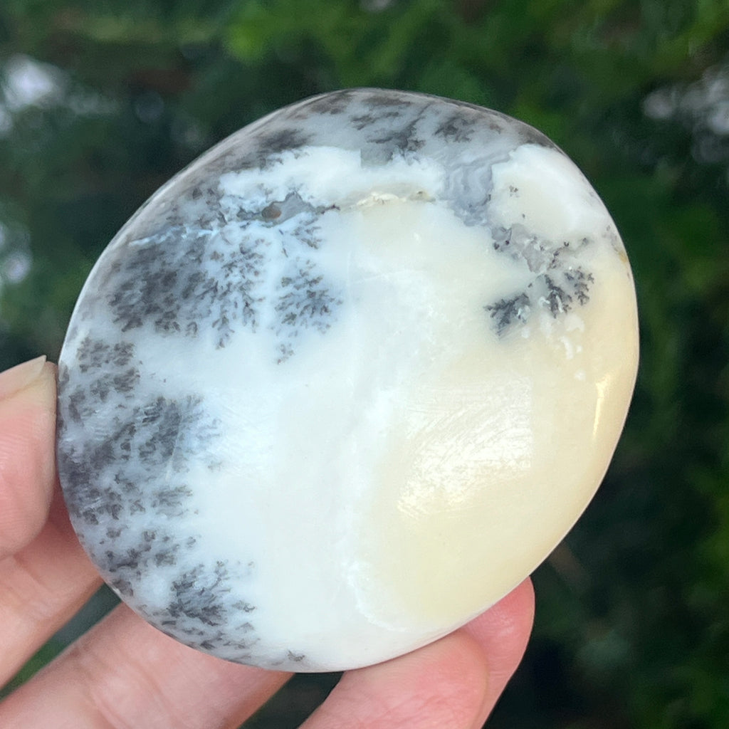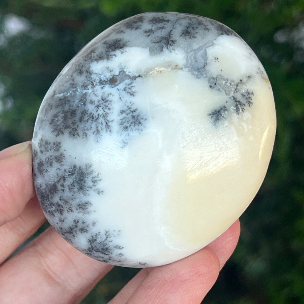 Acest palmstone din opal alb dendritic aduce o stare de pace și o ușoară expansiune a conștiinței. Ideal pentru meditație, pentru momente de reflecție sau pentru a fi păstrat ca piesă decorativă într-un spațiu sacru, el emană o frumusețe pură și organică, un echilibru între lumina albă și umbrele subtile ale naturii.