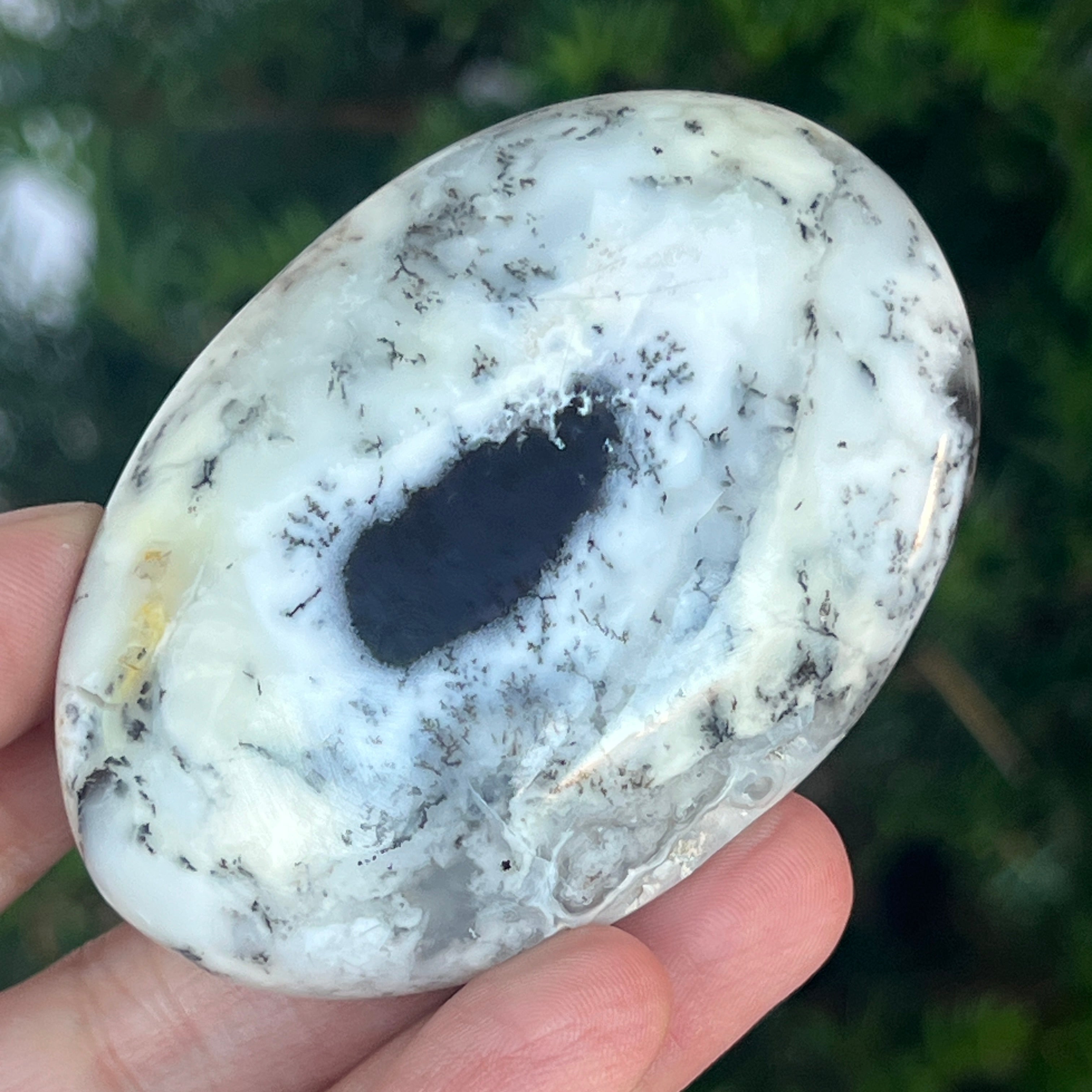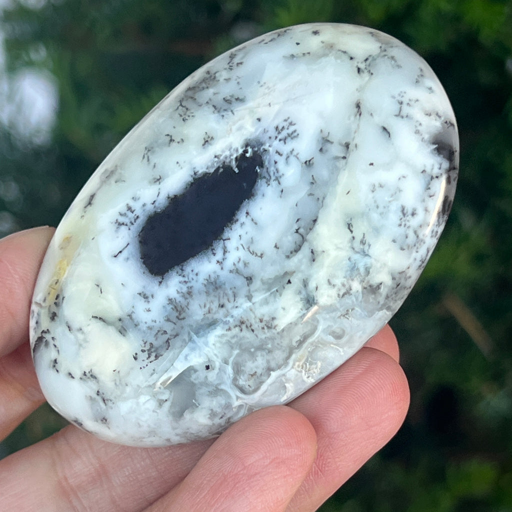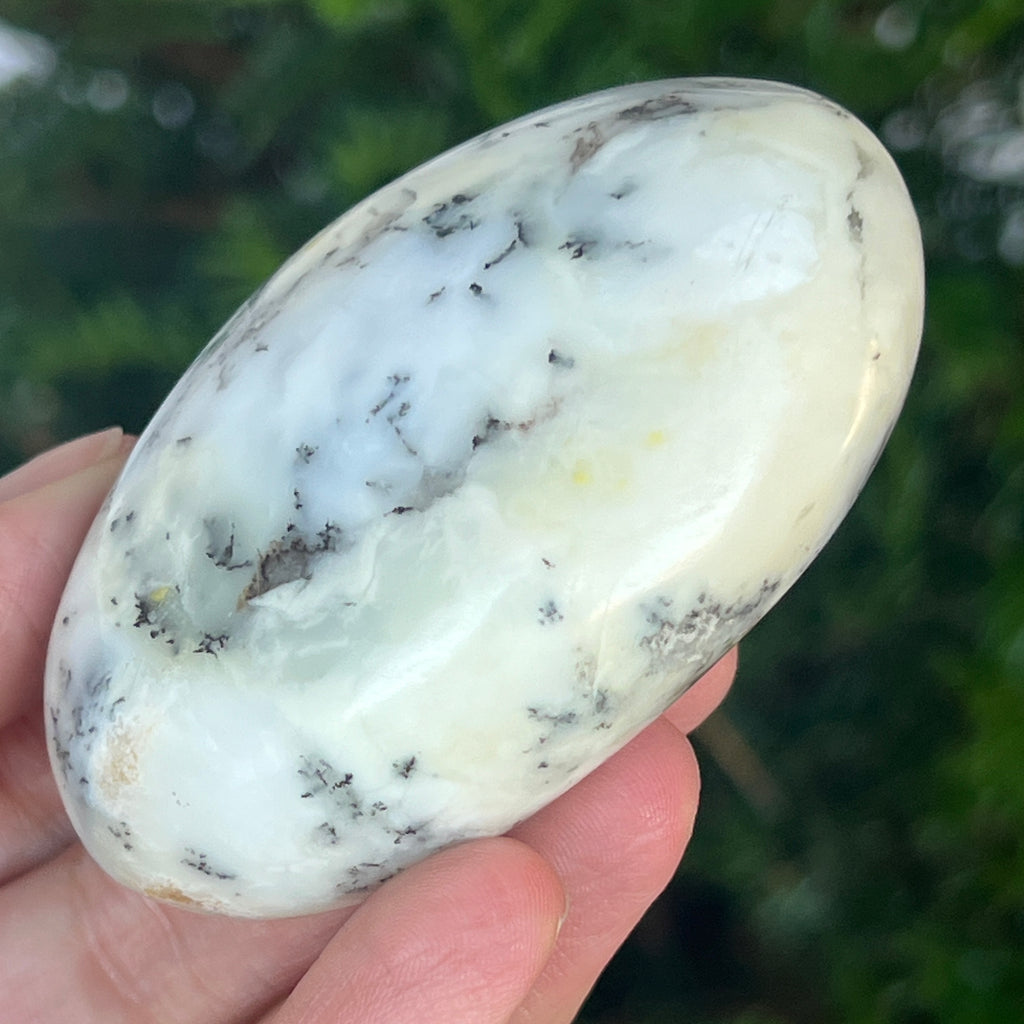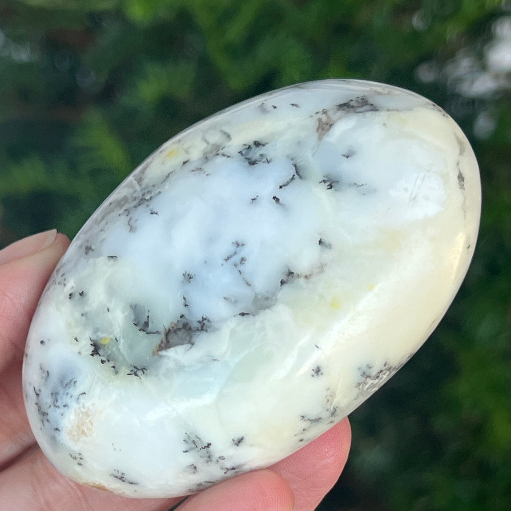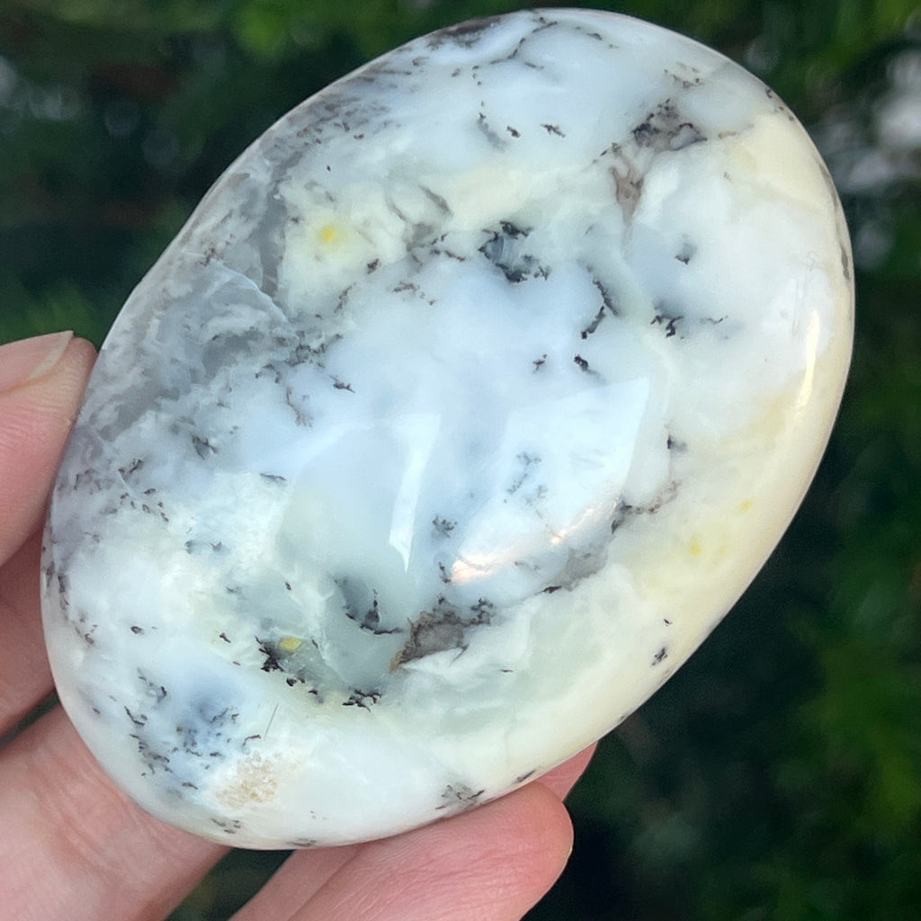 Acest palmstone din opal alb dendritic aduce o stare de pace și o ușoară expansiune a conștiinței. Ideal pentru meditație, pentru momente de reflecție sau pentru a fi păstrat ca piesă decorativă într-un spațiu sacru, el emană o frumusețe pură și organică, un echilibru între lumina albă și umbrele subtile ale naturii.