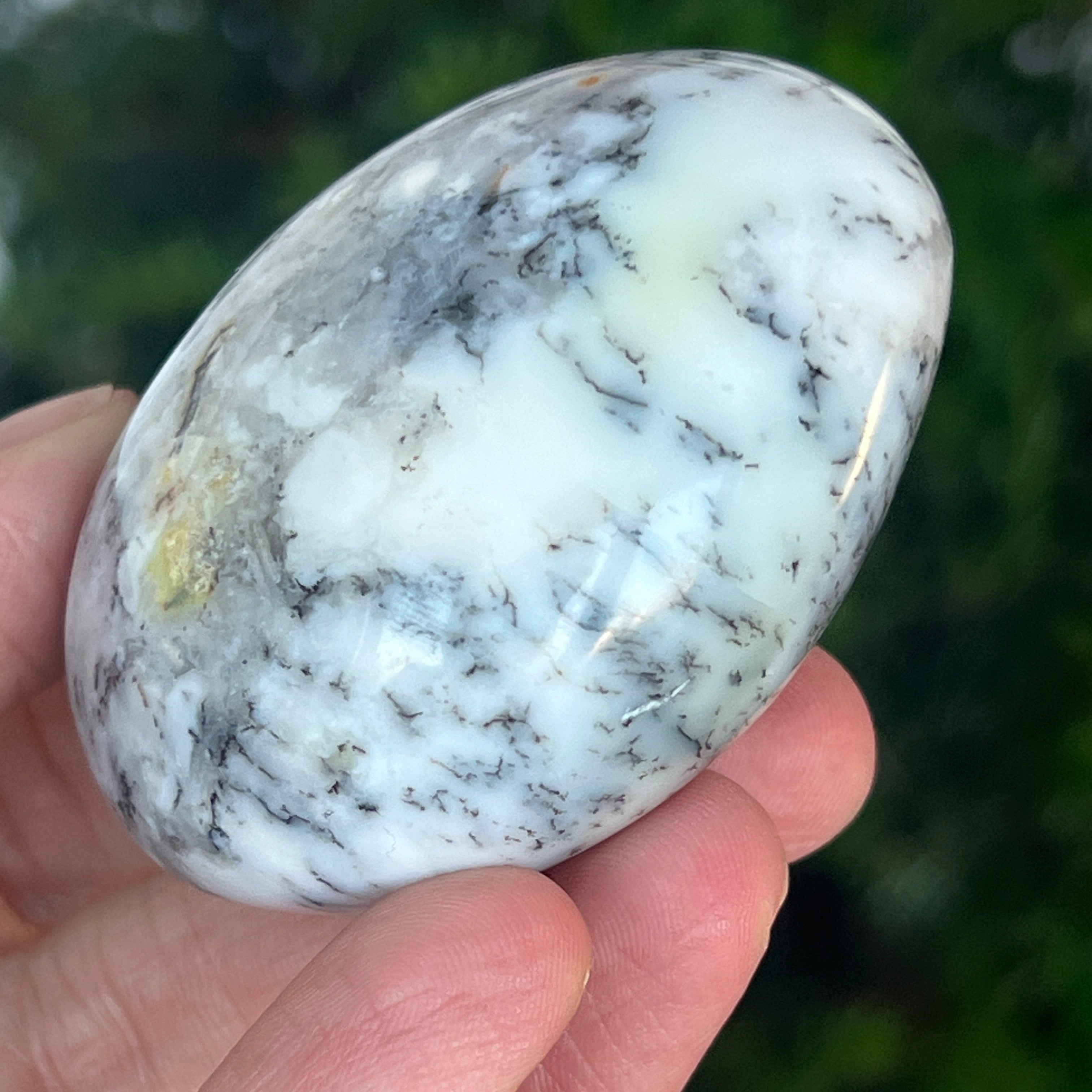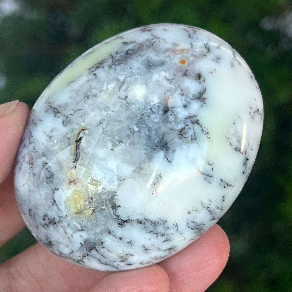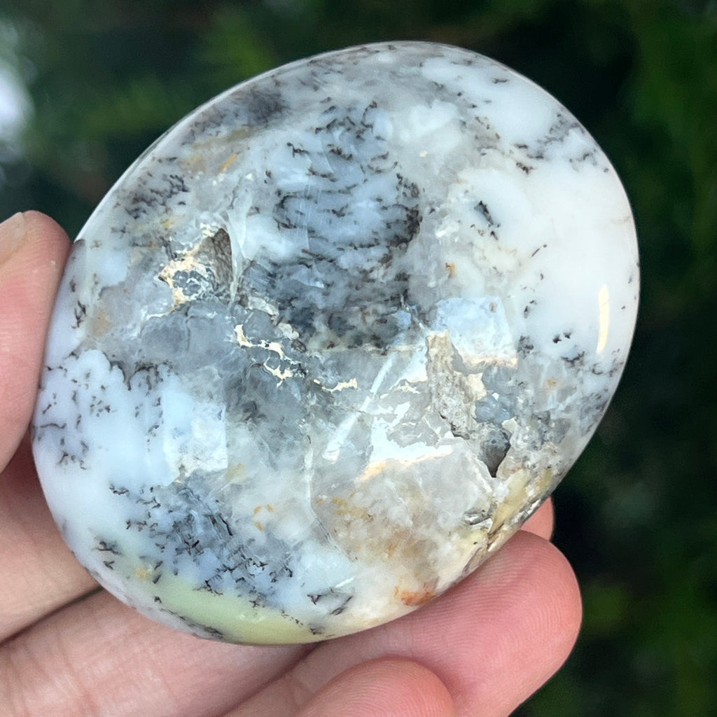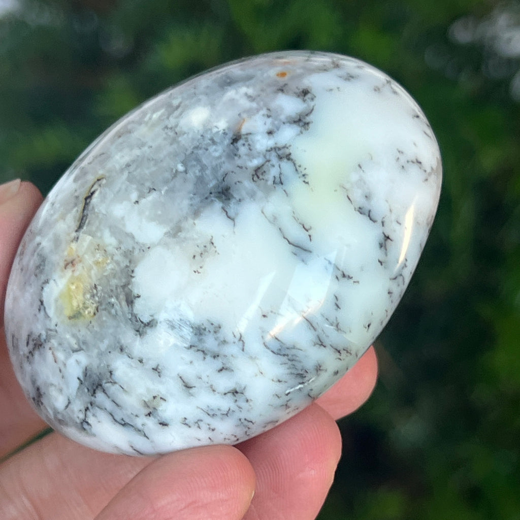 Acest palmstone din opal alb dendritic aduce o stare de pace și o ușoară expansiune a conștiinței. Ideal pentru meditație, pentru momente de reflecție sau pentru a fi păstrat ca piesă decorativă într-un spațiu sacru, el emană o frumusețe pură și organică, un echilibru între lumina albă și umbrele subtile ale naturii.