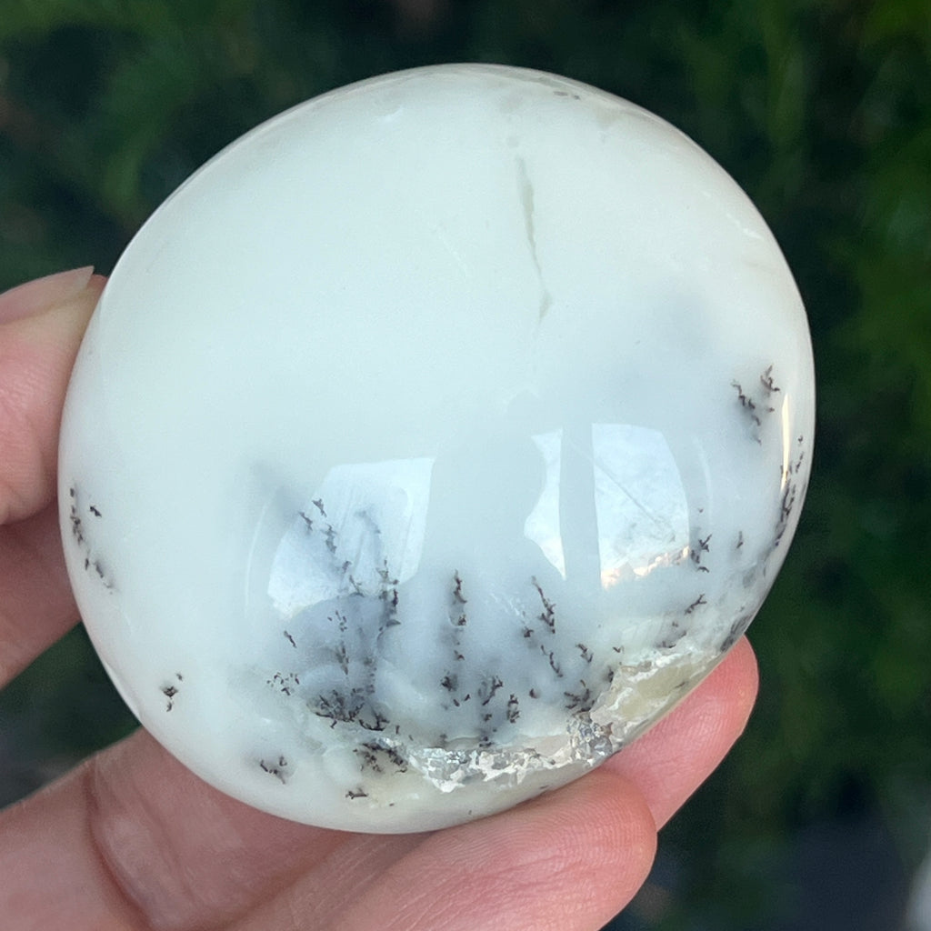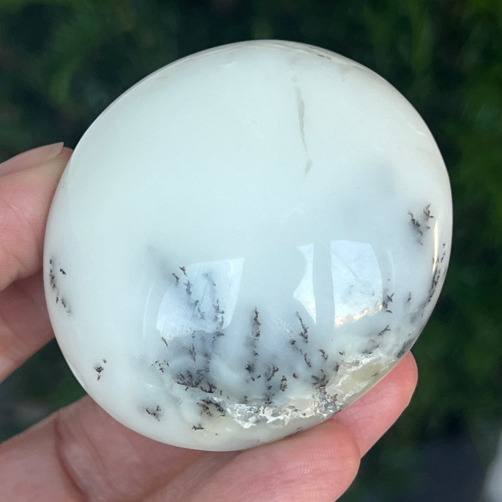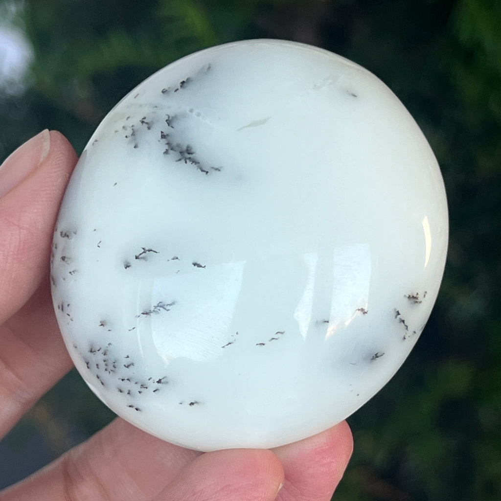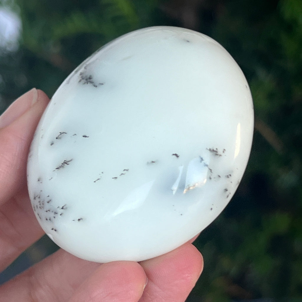 Acest palmstone din opal alb dendritic aduce o stare de pace și o ușoară expansiune a conștiinței. Ideal pentru meditație, pentru momente de reflecție sau pentru a fi păstrat ca piesă decorativă într-un spațiu sacru, el emană o frumusețe pură și organică, un echilibru între lumina albă și umbrele subtile ale naturii.