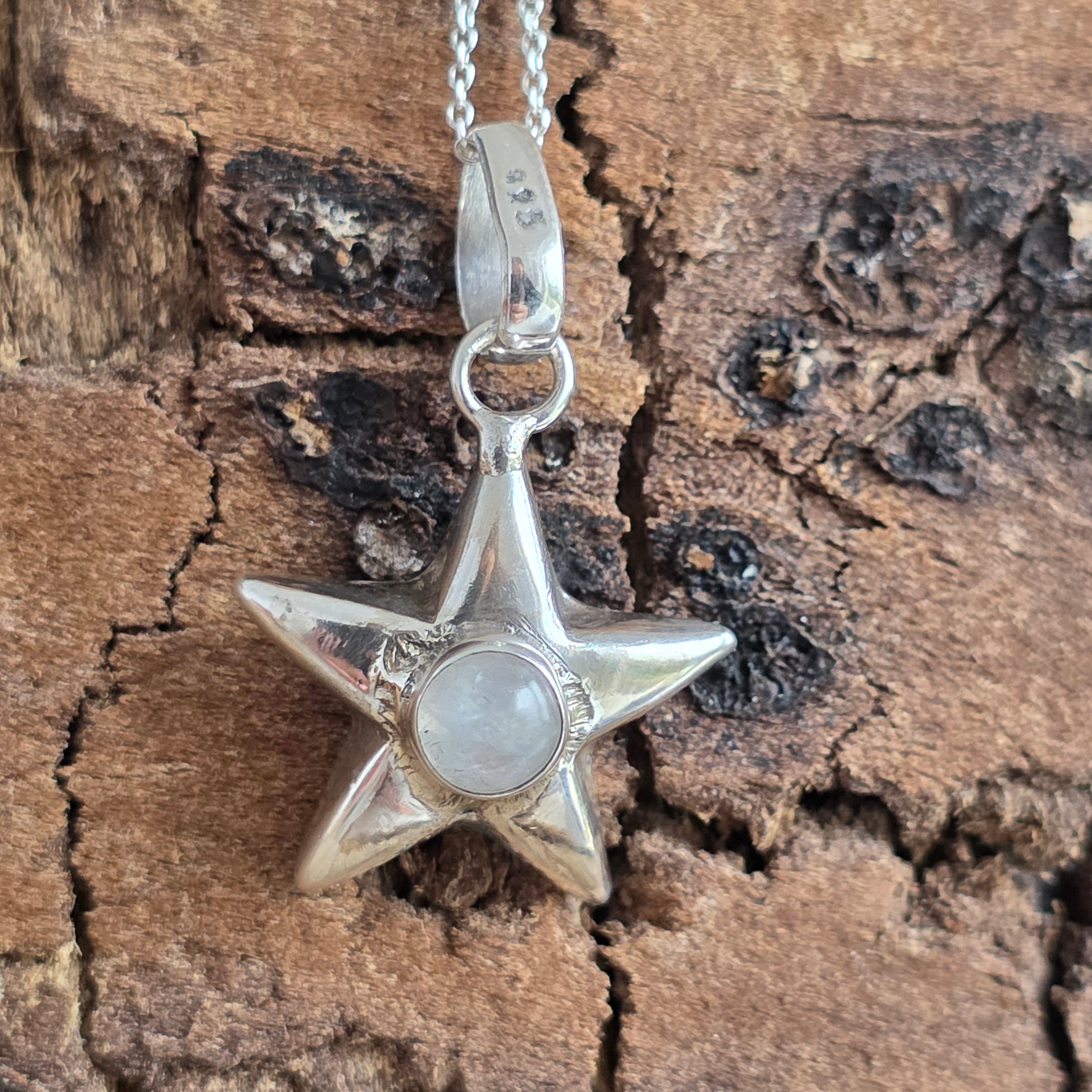 Un pandantiv delicat din argint 925, modelat sub forma unei stele lucioase, ce poartă în centrul său o piatră de piatra lunii naturala – roșu intens și plin de viață.