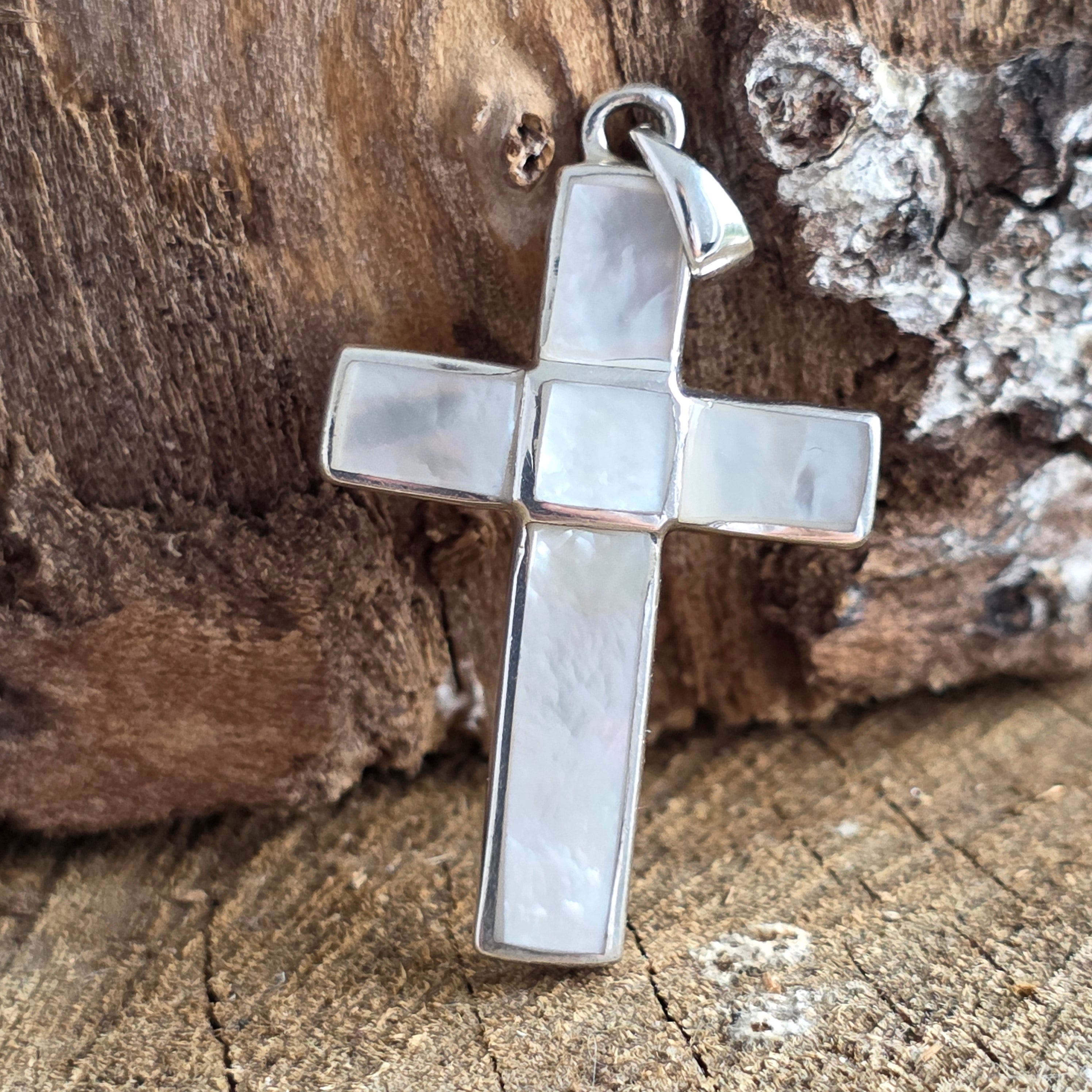 Forma clasică de cruce simbolizează protecția, credința și echilibrul interior, iar montura simplă, cu linii curate, pune în valoare luminozitatea organică a sidefului.