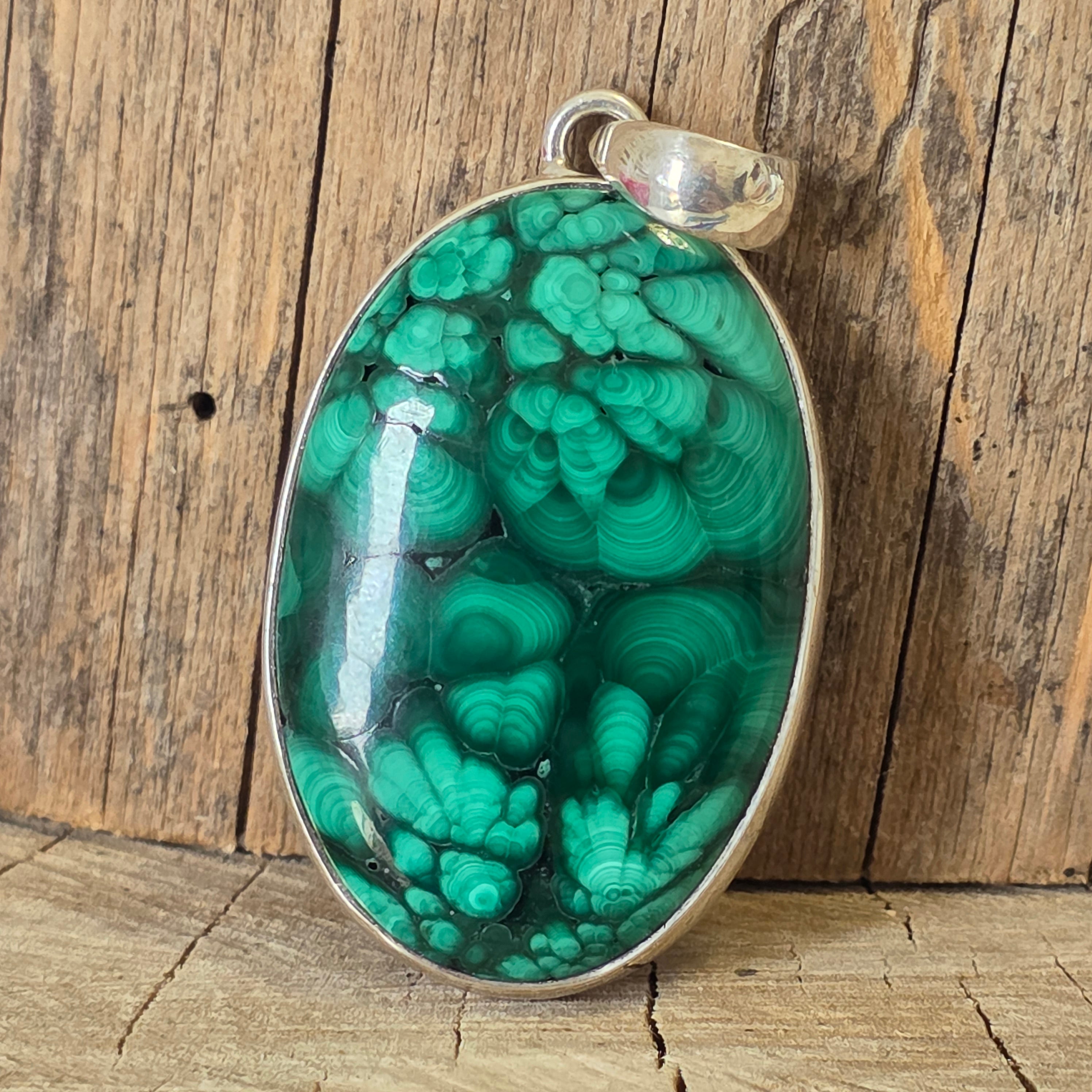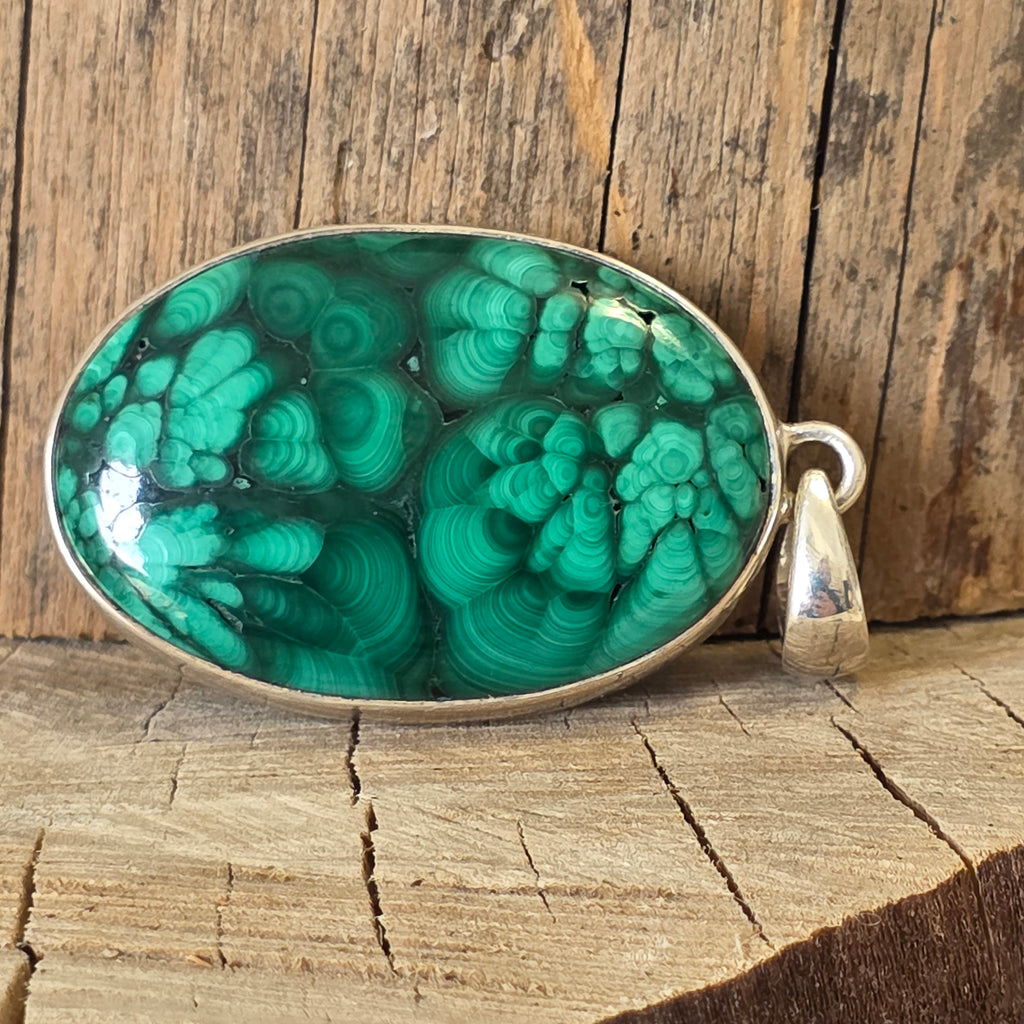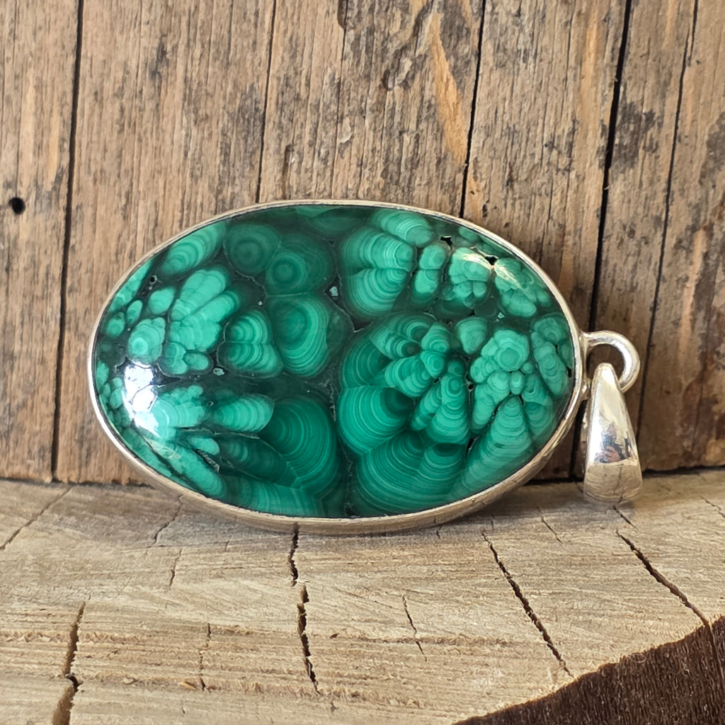 Ce pendentif massif de malachite naturelle et argent 925 se distingue par ses nuances intenses de vert et ses motifs circulaires spectaculaires, propres à ce minéral. La pierre de style cabochon de taille ovale est rehaussée par une simple monture en argent qui préserve sa beauté naturelle.