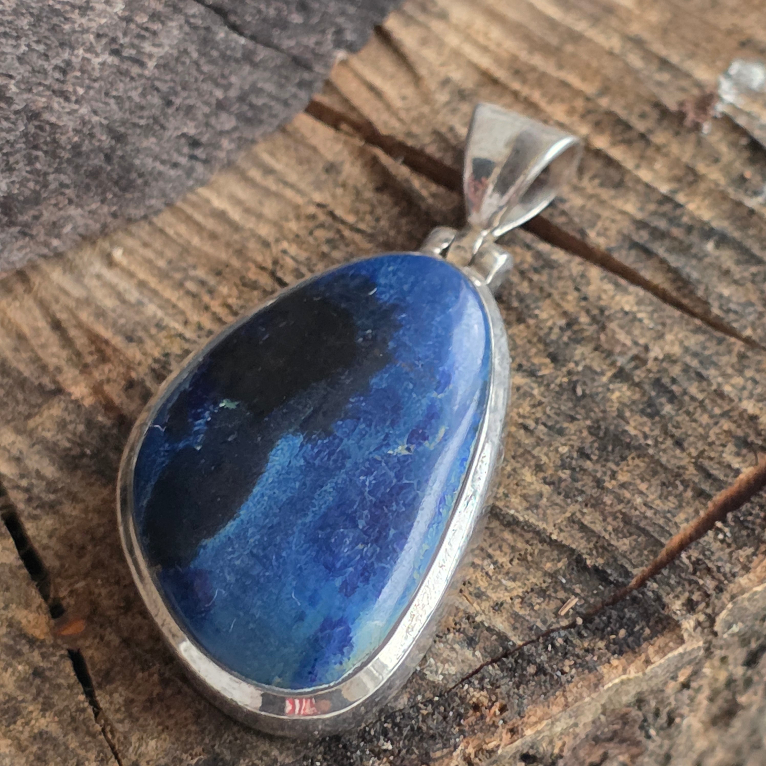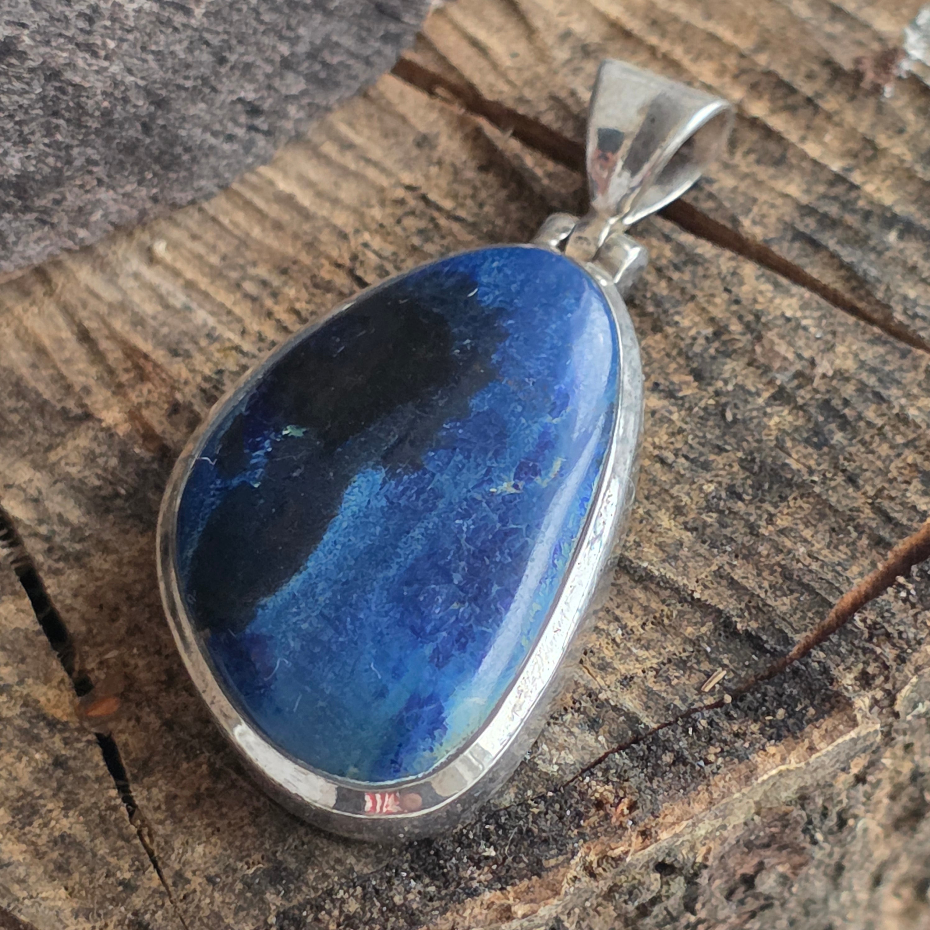 Ce pendentif en argent 925 avec azurite-malachite impressionne par sa combinaison naturelle de nuances intenses de bleu et de vert. Le motif unique de la pierre crée un effet visuel spectaculaire, chaque pièce étant différente.