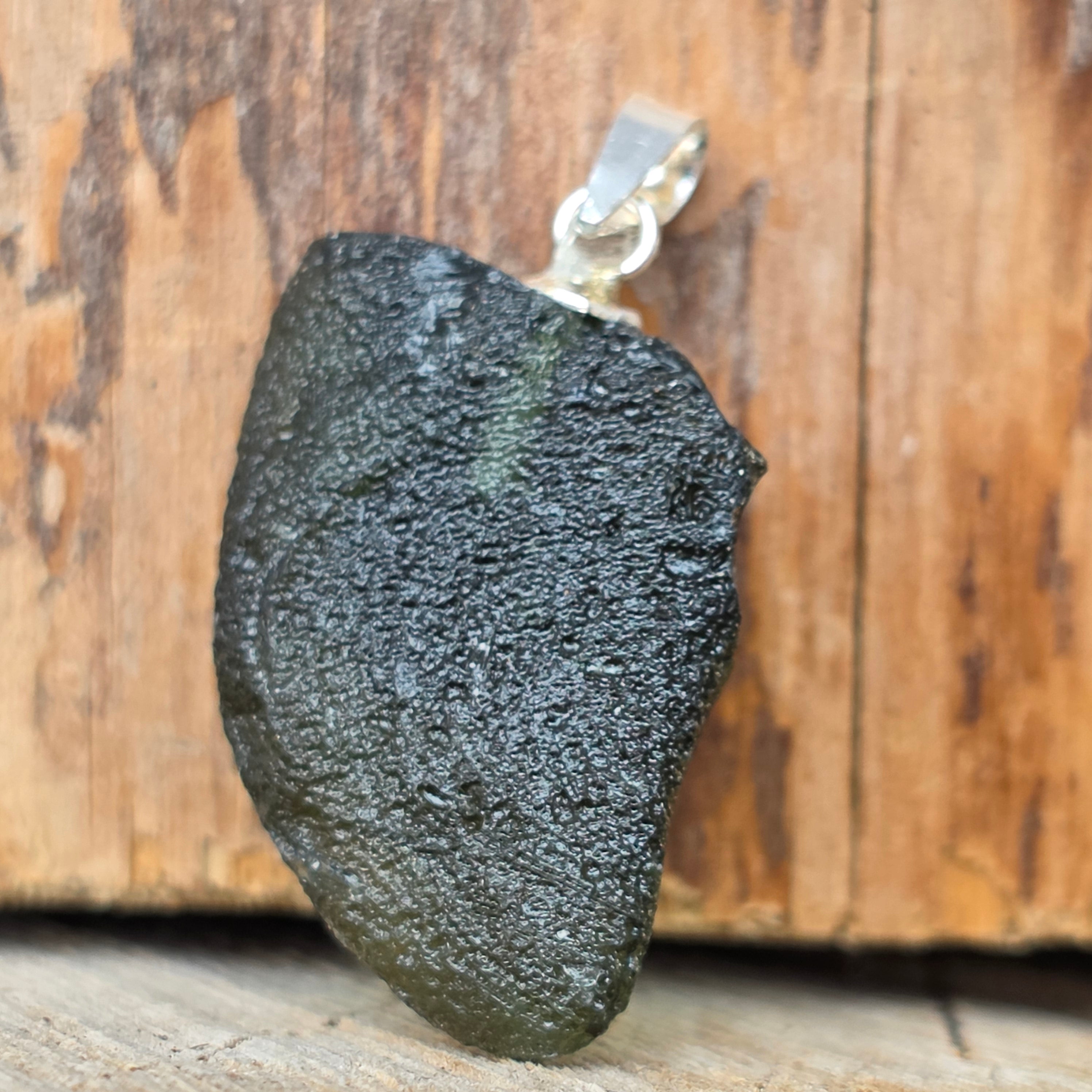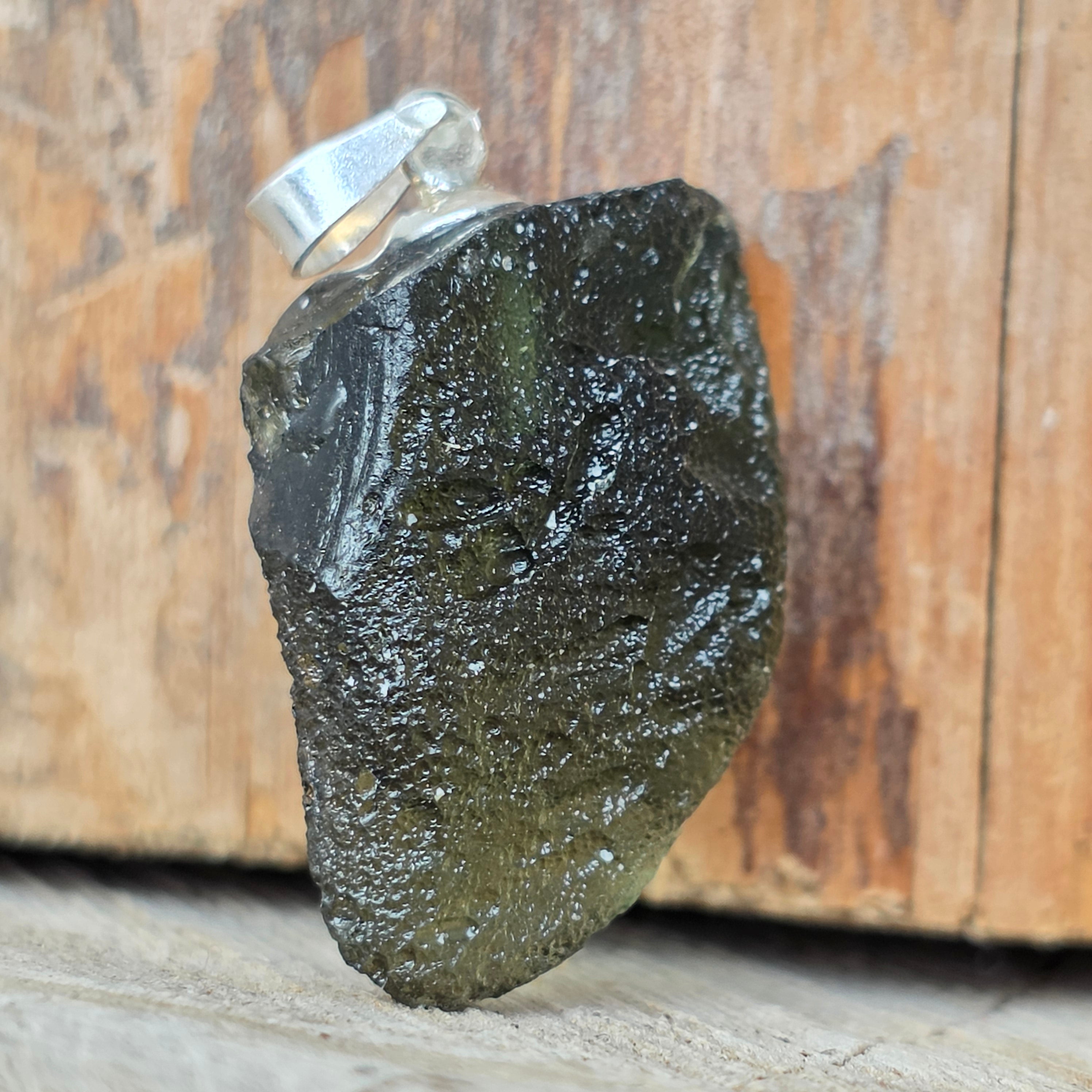 Un pendentif rare et authentique avec moldavite brute, minimaliste monté en argent 925 pour mettre en valeur sa forme naturelle.