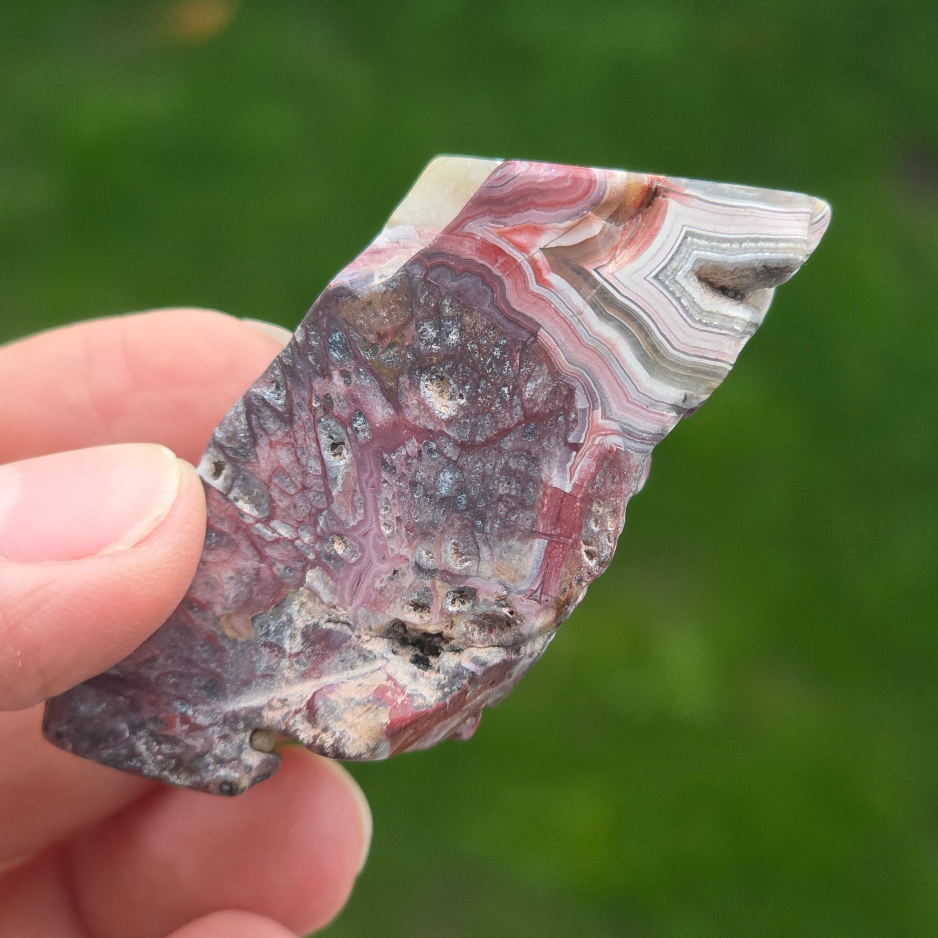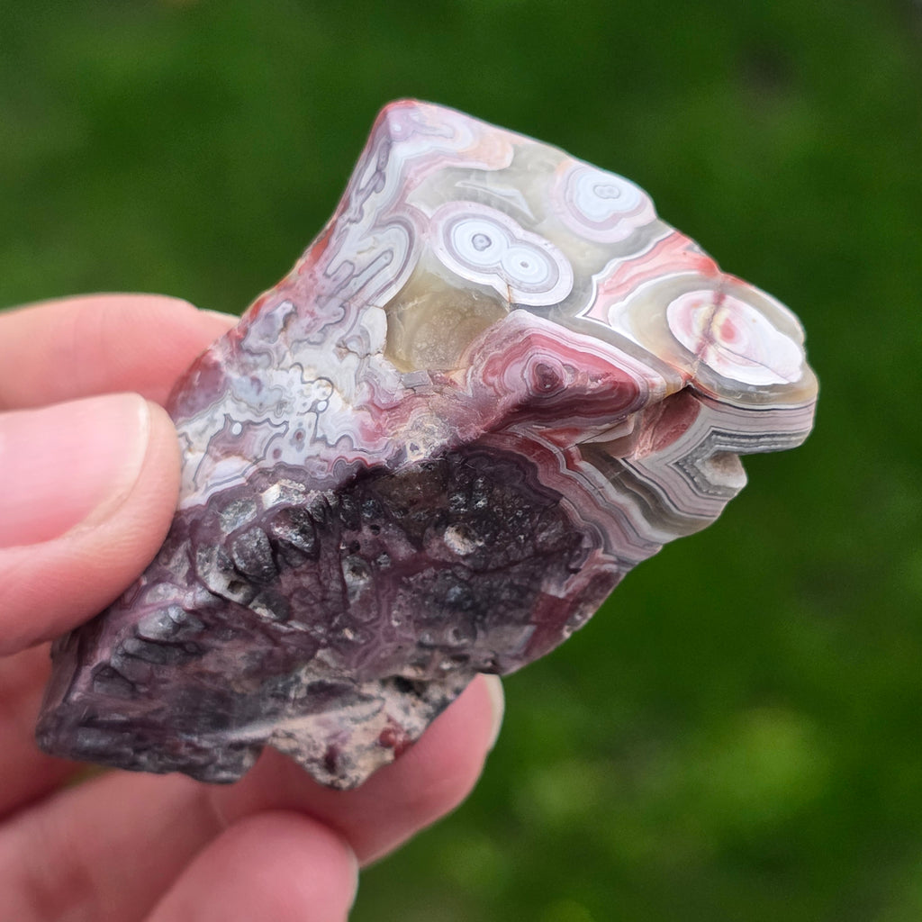 Agatul Crazy din Mexic este una dintre cele mai vibrante și spectaculoase varietăți de agat, celebru pentru liniile sale ondulate și jocurile nebunești de culori ce par desenate de o mână liberă, fără reguli. În această felie naturală, mică dar extrem de expresivă, se dezvăluie întreaga poveste a pietrei: straturi pământii, nuanțe calde de caramel, roșu aprins, portocaliu, gri și crem, amestecate în modele spiralate care par să pulseze cu viață.