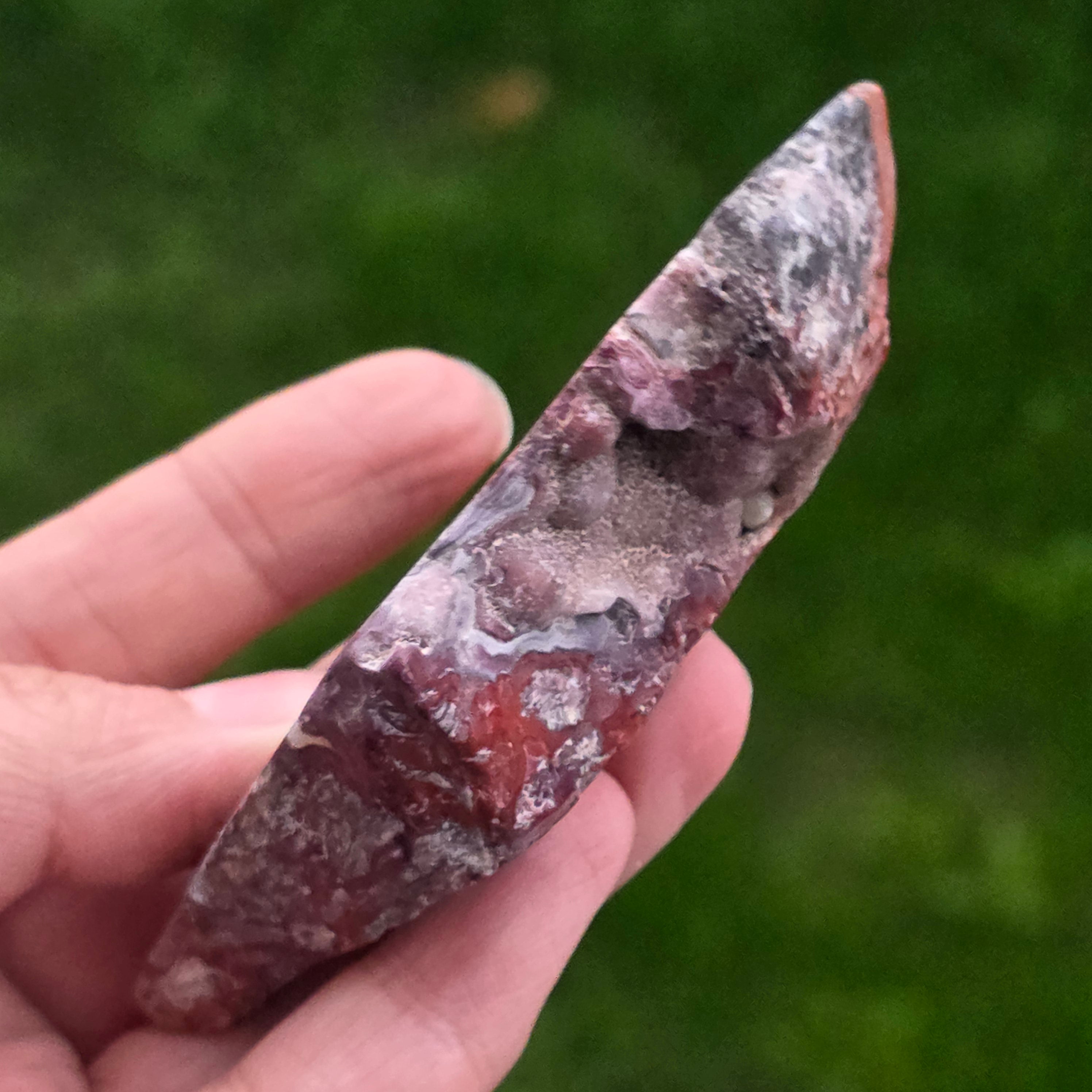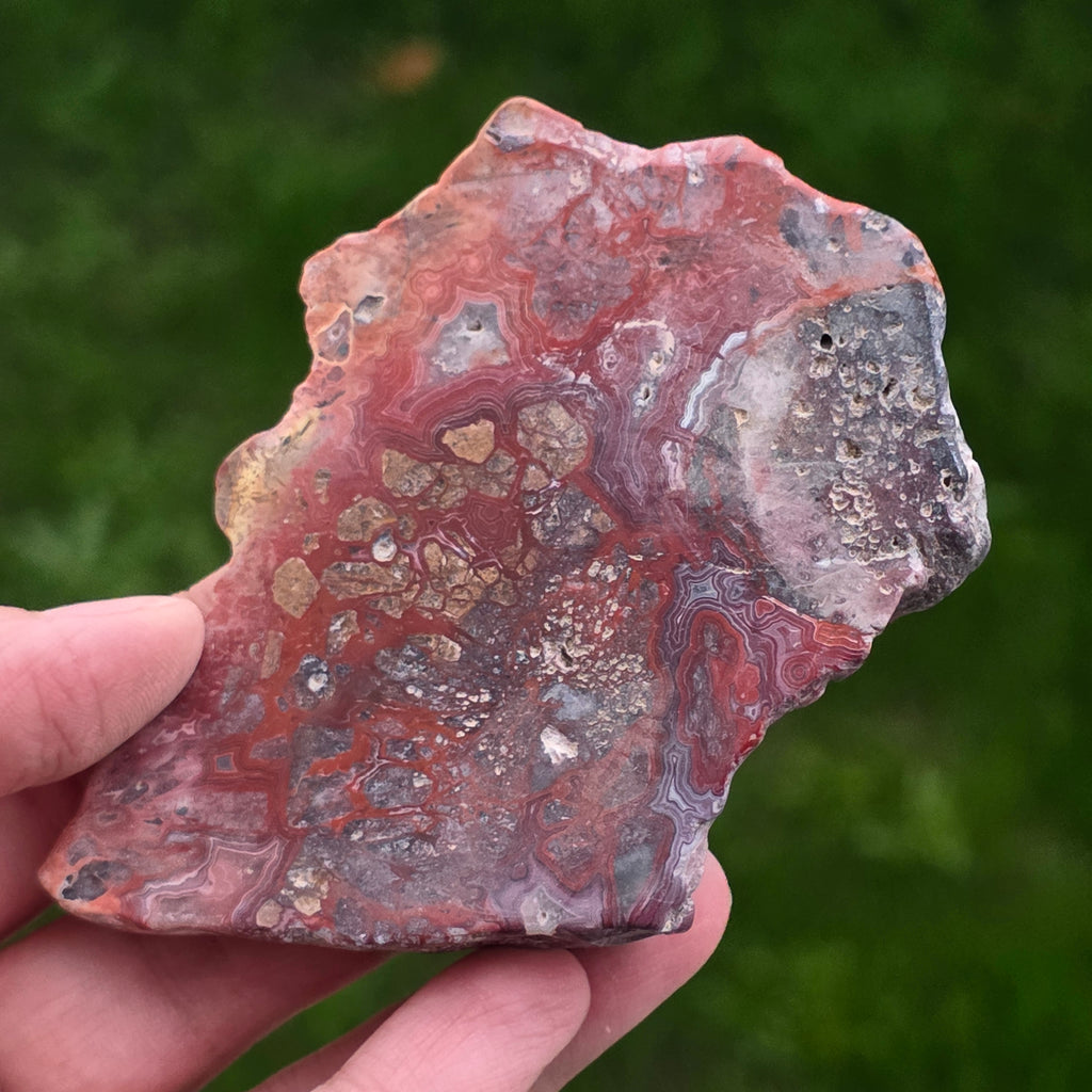 L'agate Crazy du Mexique est l'une des variétés d'agate les plus vibrantes et spectaculaires, célèbre pour ses lignes ondulées et ses jeux de couleurs fous qui semblent dessinés par une main libre, sans règles. Dans cette tranche naturelle, petite mais extrêmement expressive, toute l'histoire de la pierre se révèle : des strates terreuses, des nuances chaudes de caramel, rouge vif, orange, gris et crème, mélangées en motifs spiralés qui semblent pulser de vie.