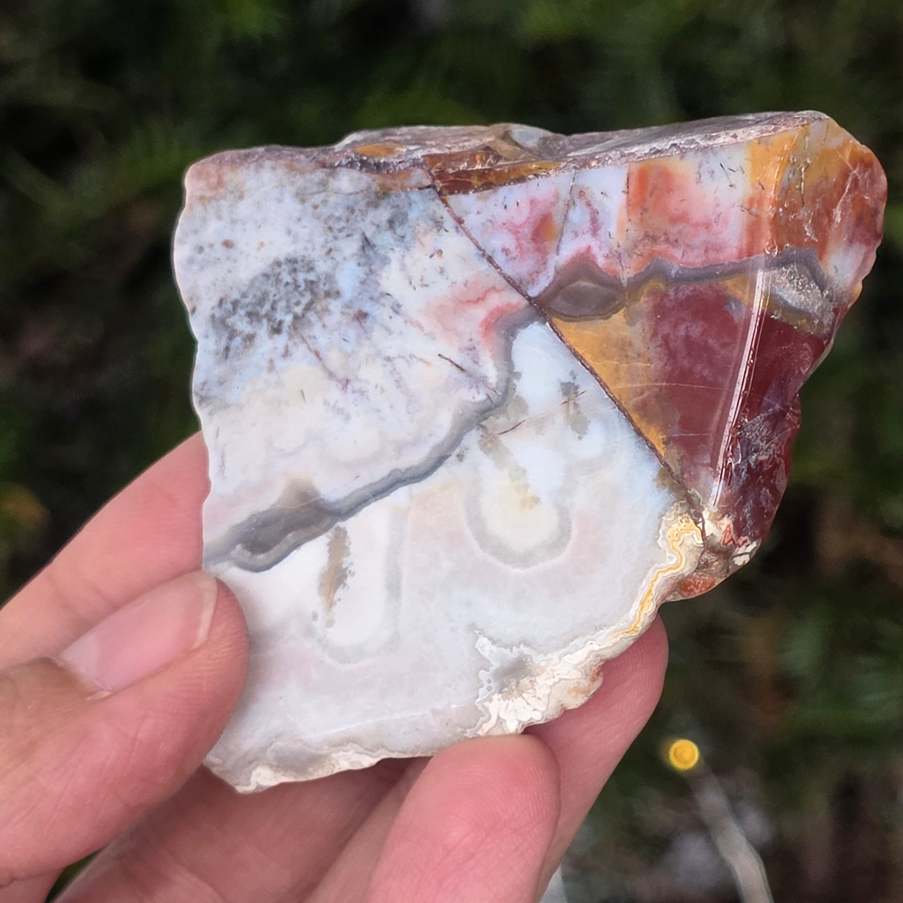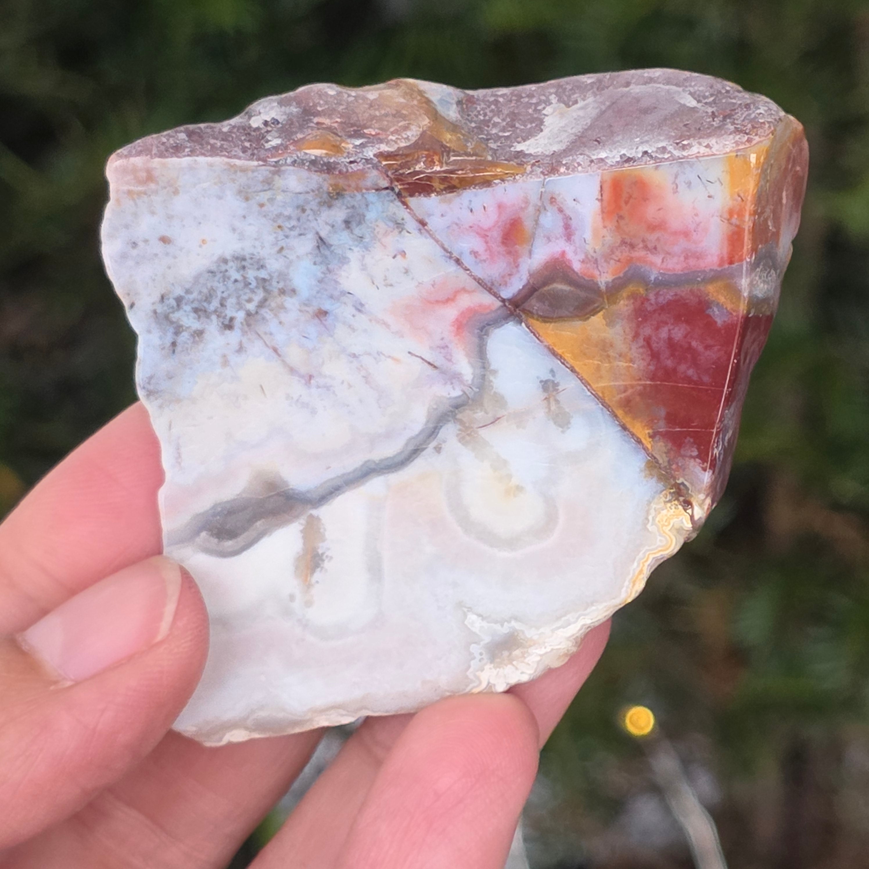 L'agate Crazy du Mexique est l'une des variétés d'agate les plus vibrantes et spectaculaires, célèbre pour ses lignes ondulées et ses jeux de couleurs fous qui semblent dessinés d'une main libre, sans règles. Dans cette tranche naturelle, petite mais extrêmement expressive, toute l'histoire de la pierre se révèle : des couches terreuses, des nuances chaudes de caramel, rouge vif, orange, gris et crème, mélangées en motifs spirales qui semblent pulser de vie.
