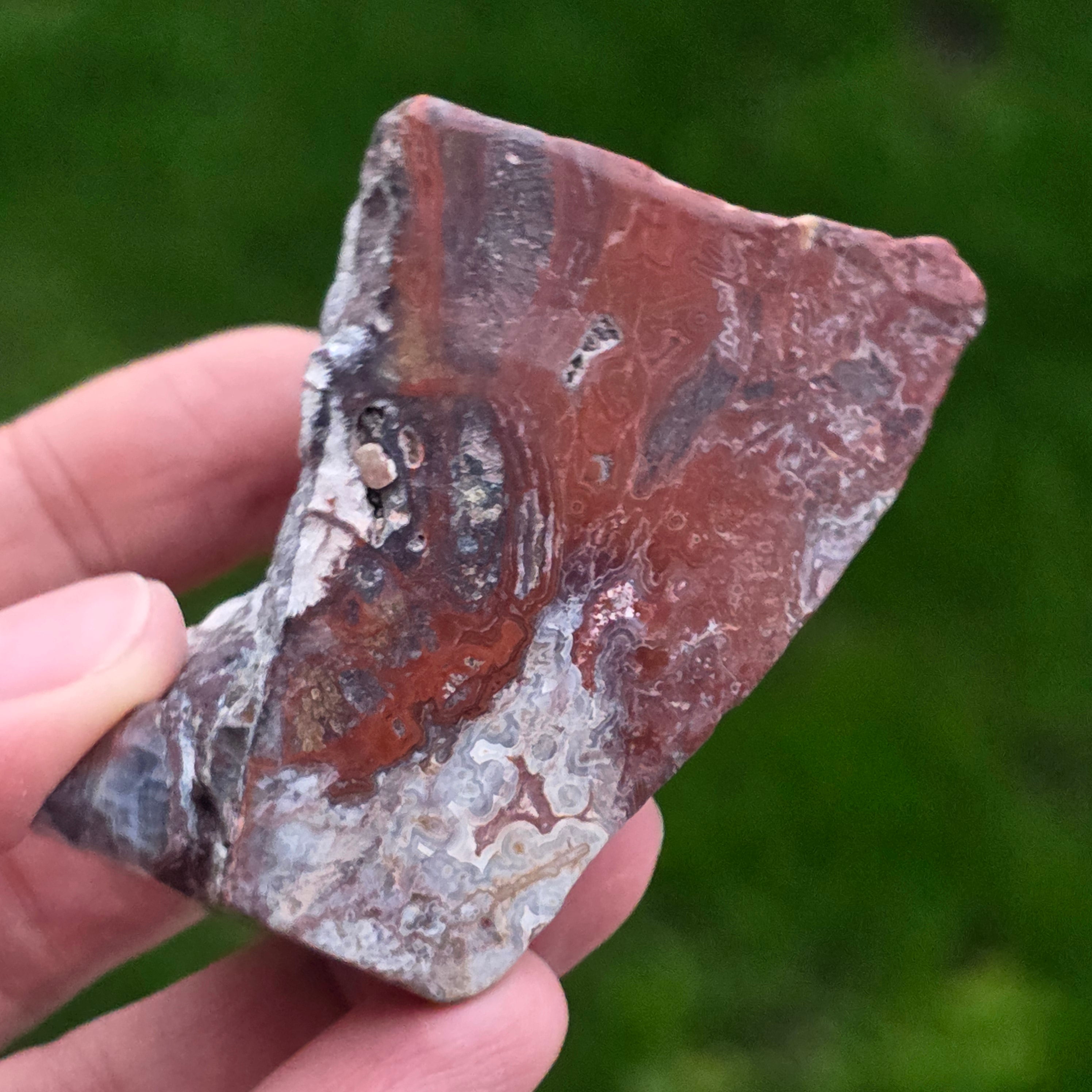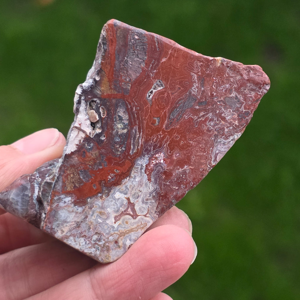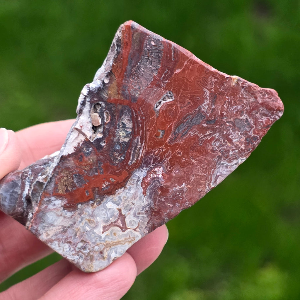 L'agate Crazy du Mexique est l'une des variétés d'agate les plus vibrantes et spectaculaires, célèbre pour ses lignes ondulées et ses jeux de couleurs fous qui semblent dessinés par une main libre, sans règles. Dans cette tranche naturelle, petite mais extrêmement expressive, toute l'histoire de la pierre se révèle : des strates terreuses, des nuances chaudes de caramel, rouge vif, orange, gris et crème, mélangées en motifs spiralés qui semblent pulser de vie.