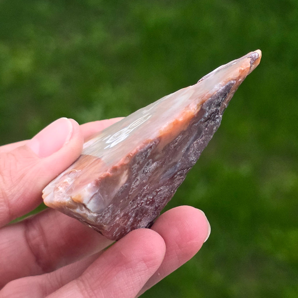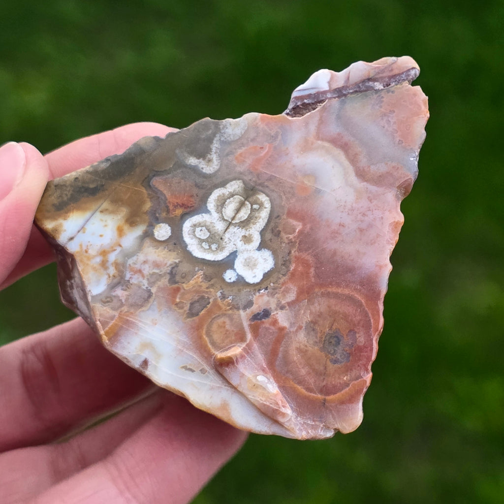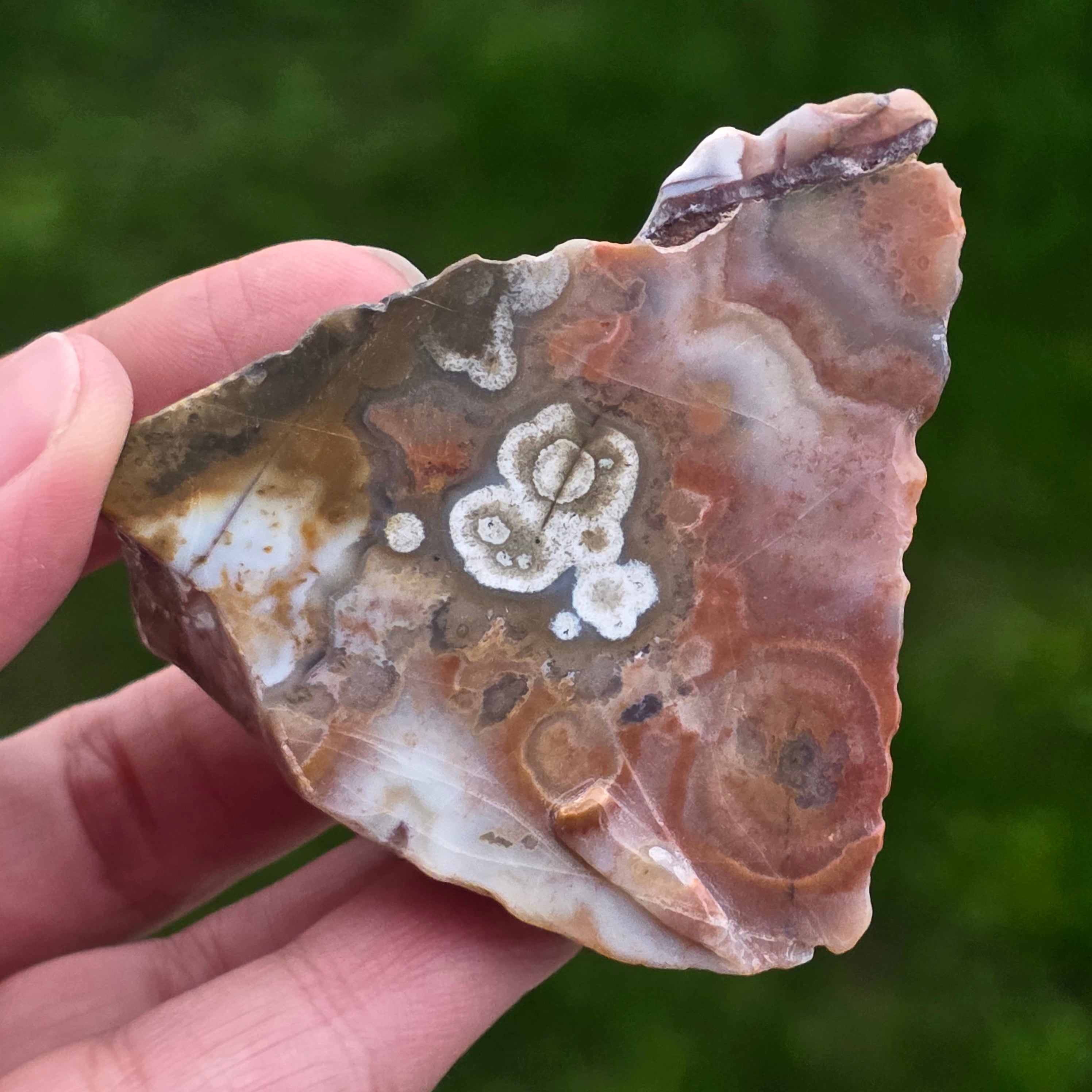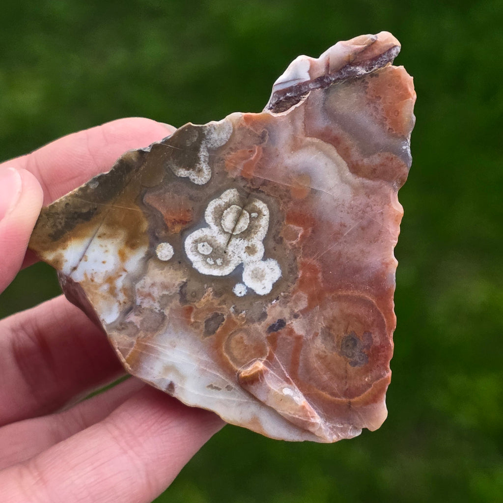 L'agate Crazy du Mexique est l'une des variétés d'agate les plus vibrantes et spectaculaires, célèbre pour ses lignes ondulées et ses jeux de couleurs fous qui semblent dessinés par une main libre, sans règles. Dans cette tranche naturelle, petite mais extrêmement expressive, toute l'histoire de la pierre se révèle : des strates terreuses, des nuances chaudes de caramel, rouge vif, orange, gris et crème, mélangées en motifs spiralés qui semblent pulser de vie.