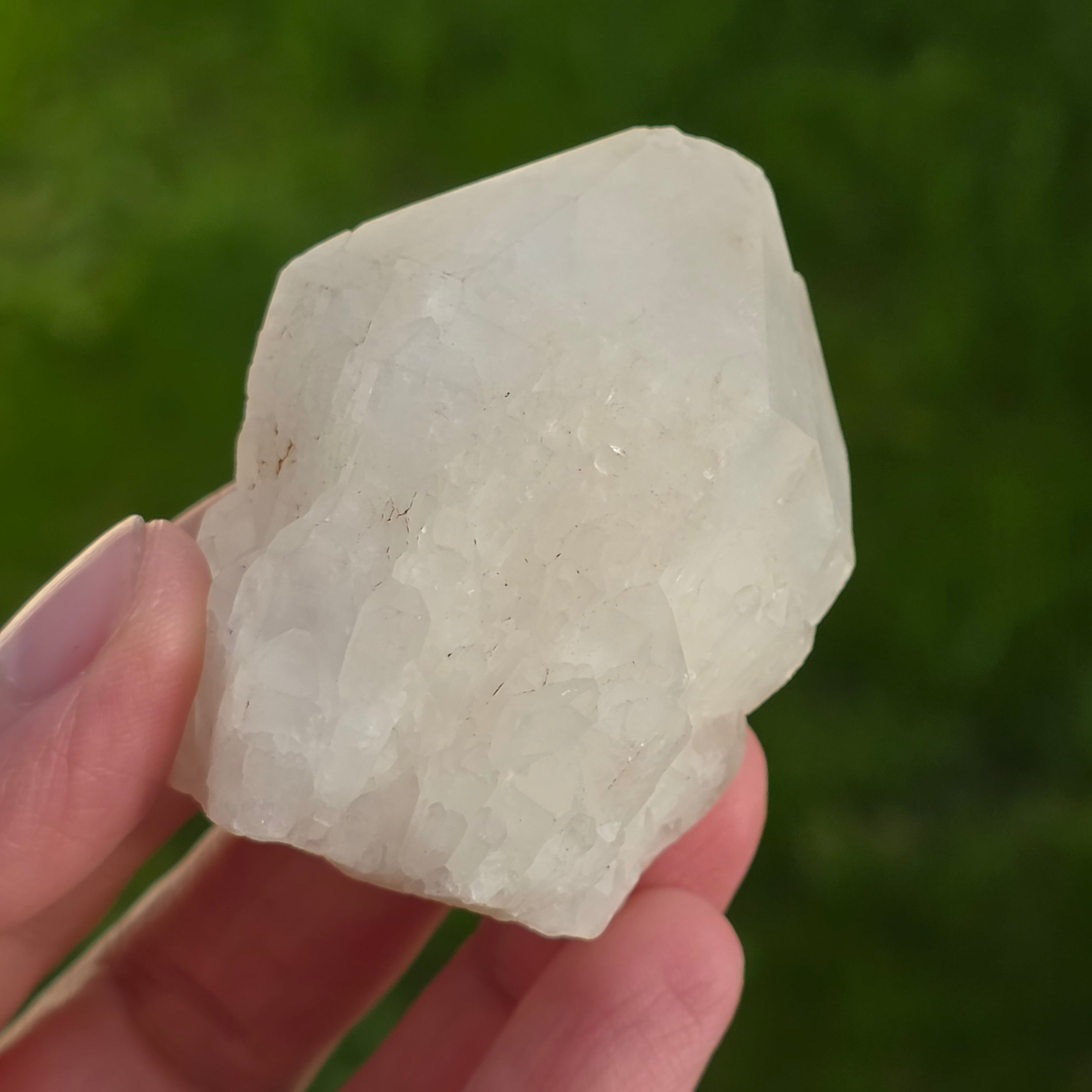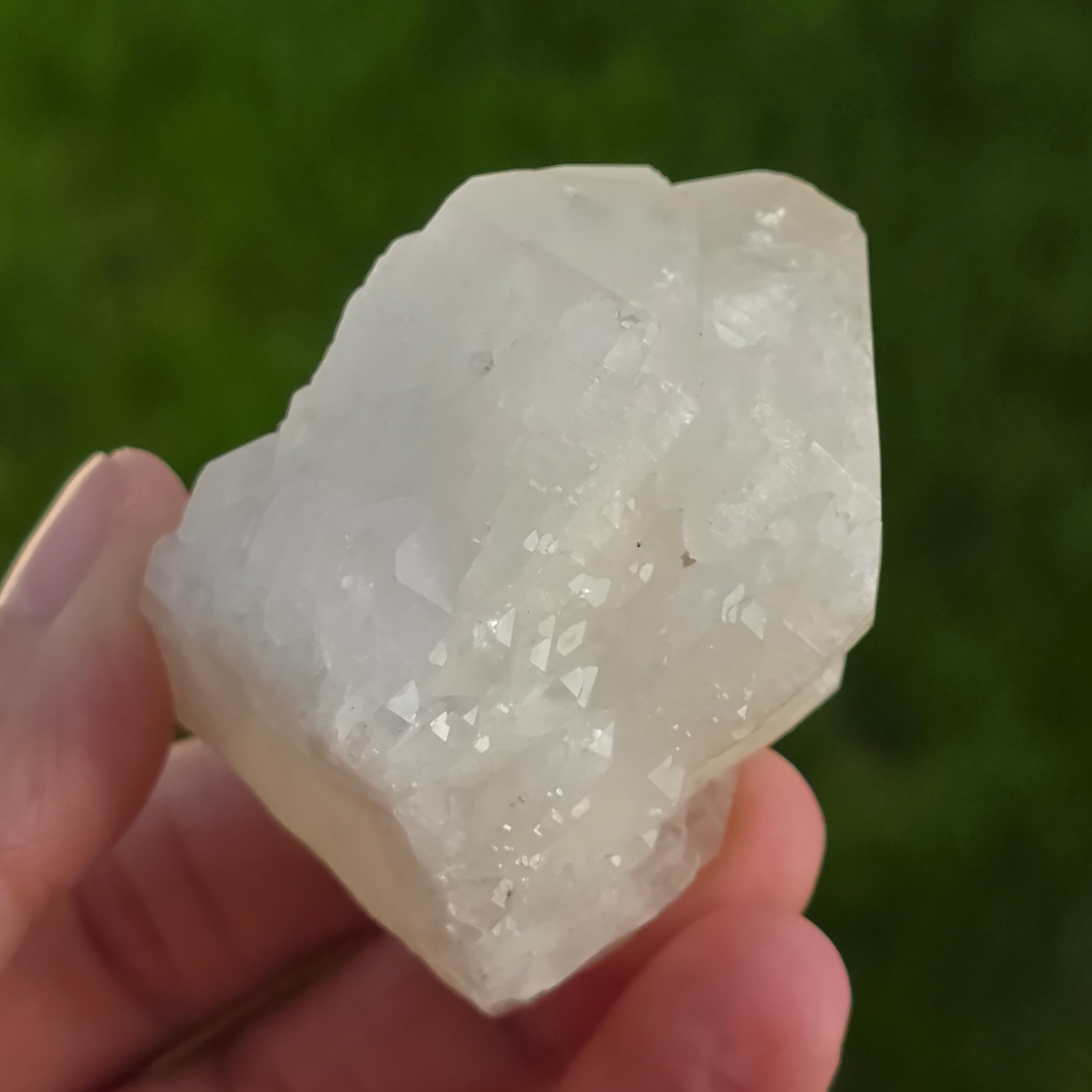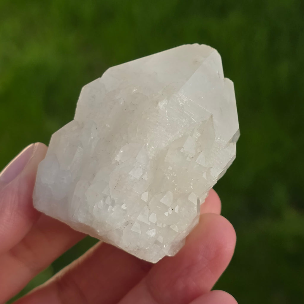Le quartz de bougie a une forme caractéristique rappelant une bougie ou un ananas, avec des pointes pointues et des bords lumineux. Sa couleur varie du translucide à transparent, et parfois il a des nuances légèrement opalescentes.