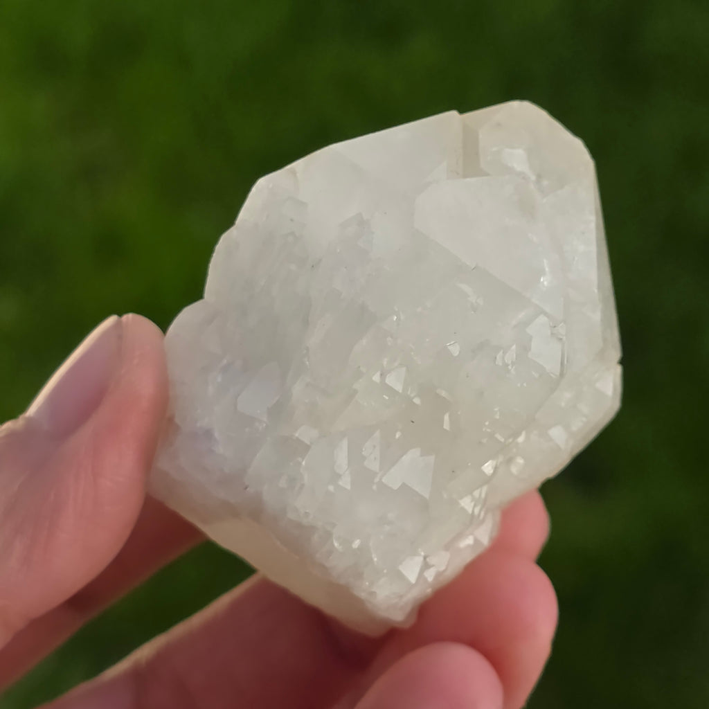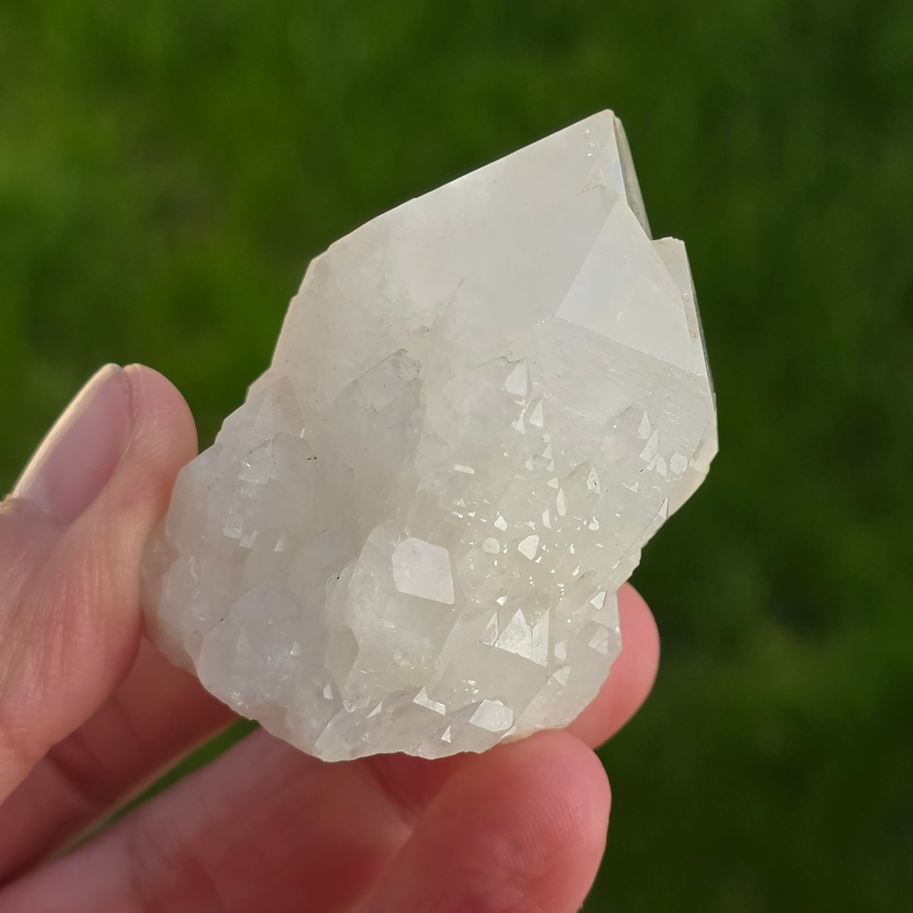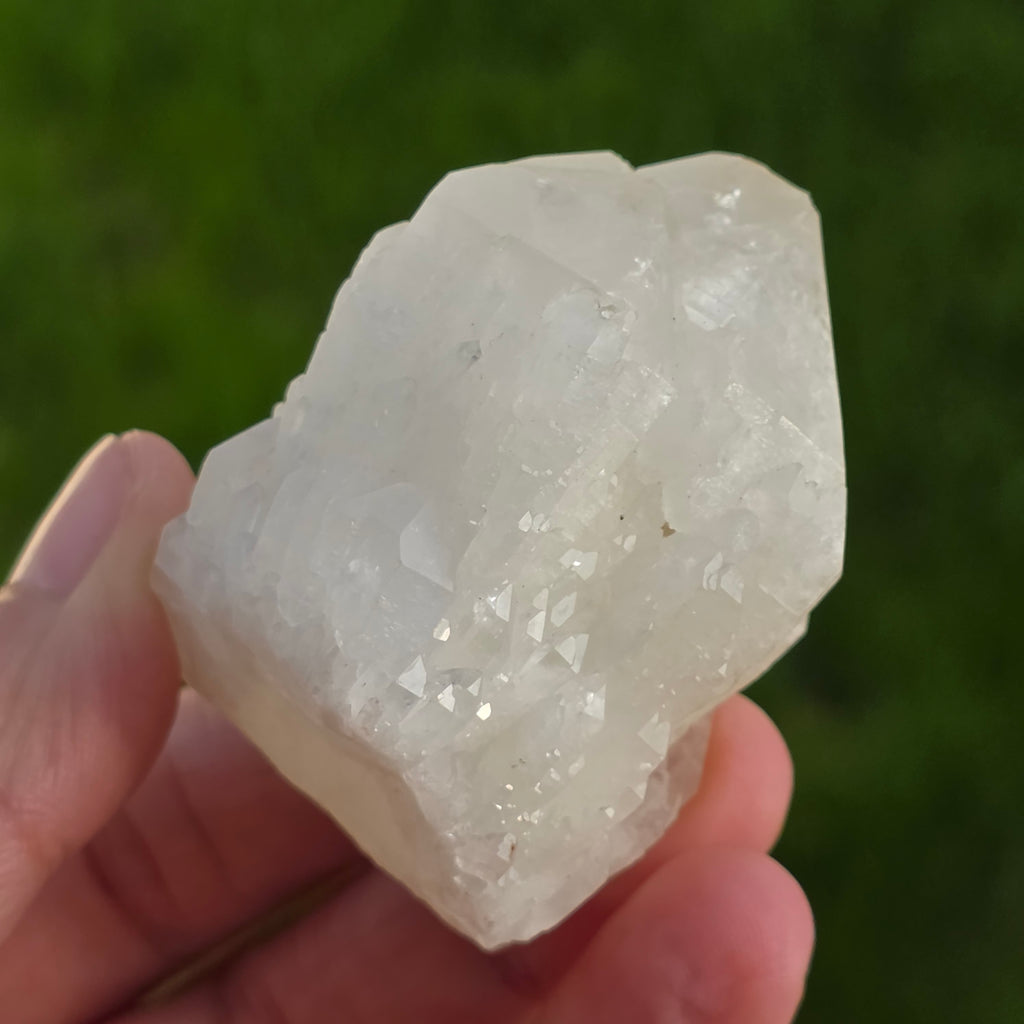Le quartz de bougie a une forme caractéristique rappelant une bougie ou un ananas, avec des pointes pointues et des bords lumineux. Sa couleur varie du translucide à transparent, et parfois il a des nuances légèrement opalescentes.