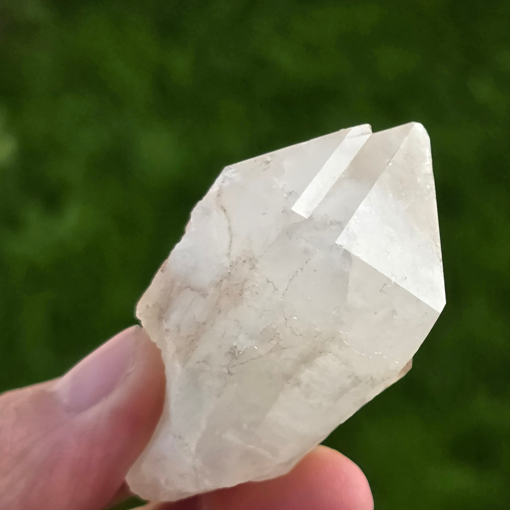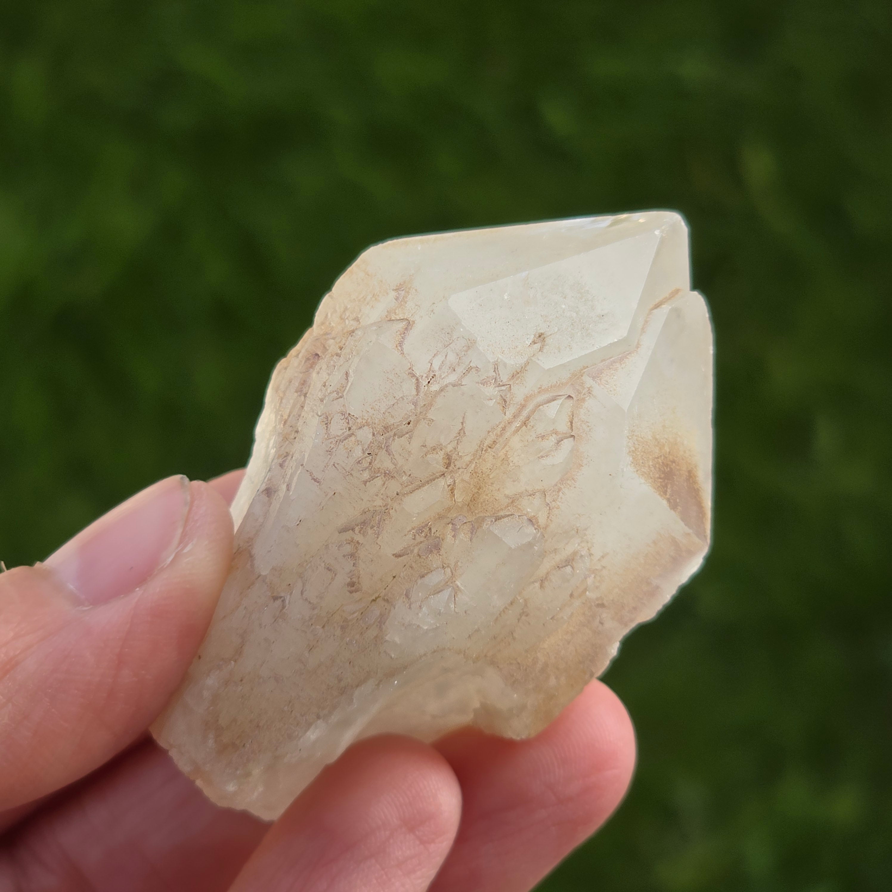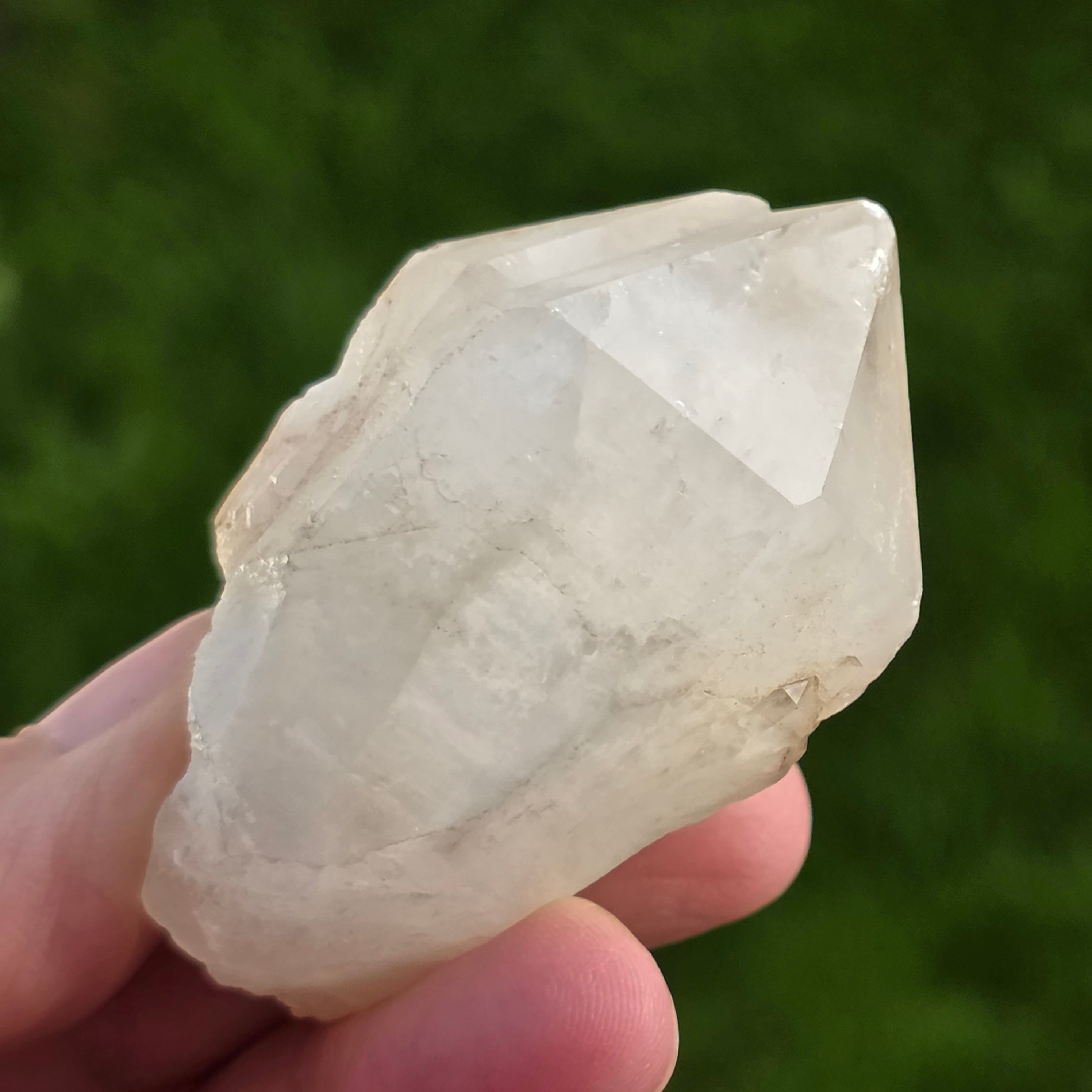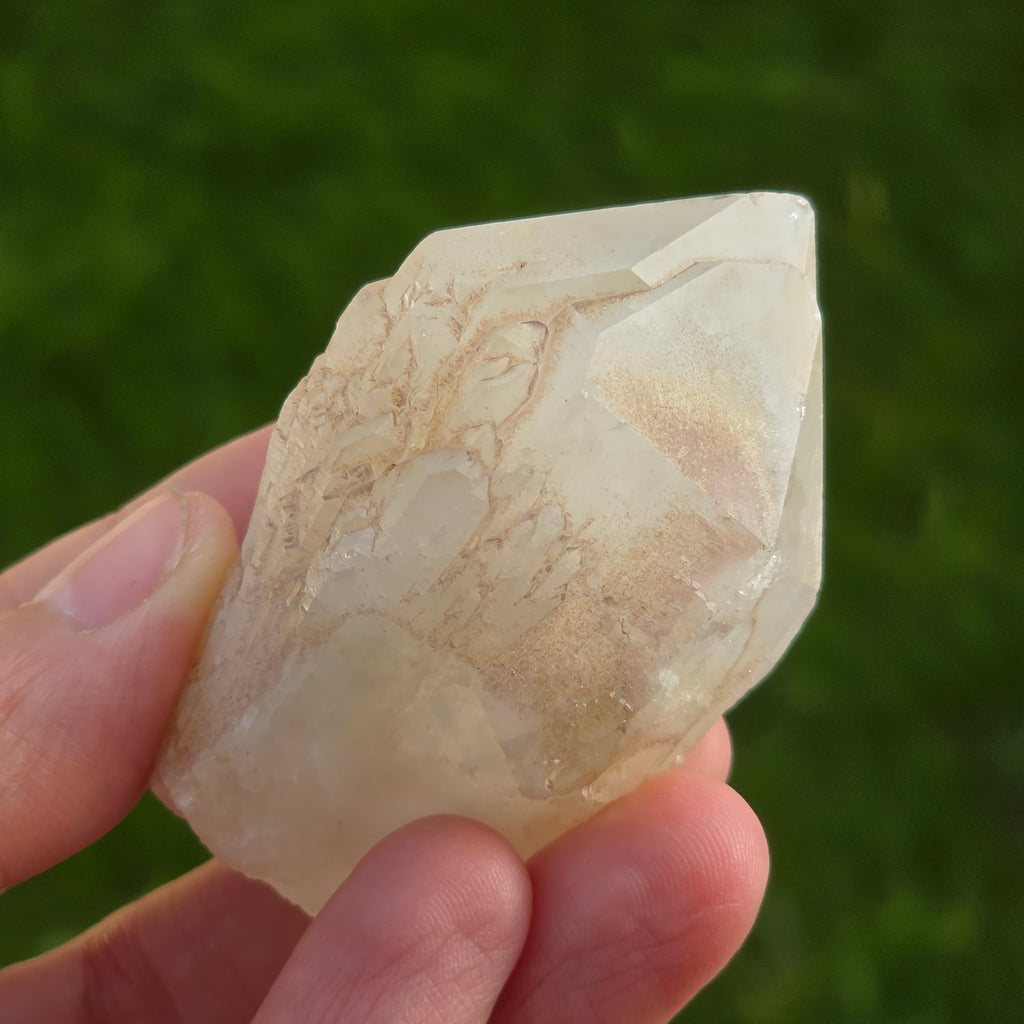 Le quartz de bougie a une forme caractéristique rappelant une bougie ou un ananas, avec des pointes pointues et des bords lumineux. Sa couleur varie du translucide à transparent, et parfois il a des nuances légèrement opalescentes.