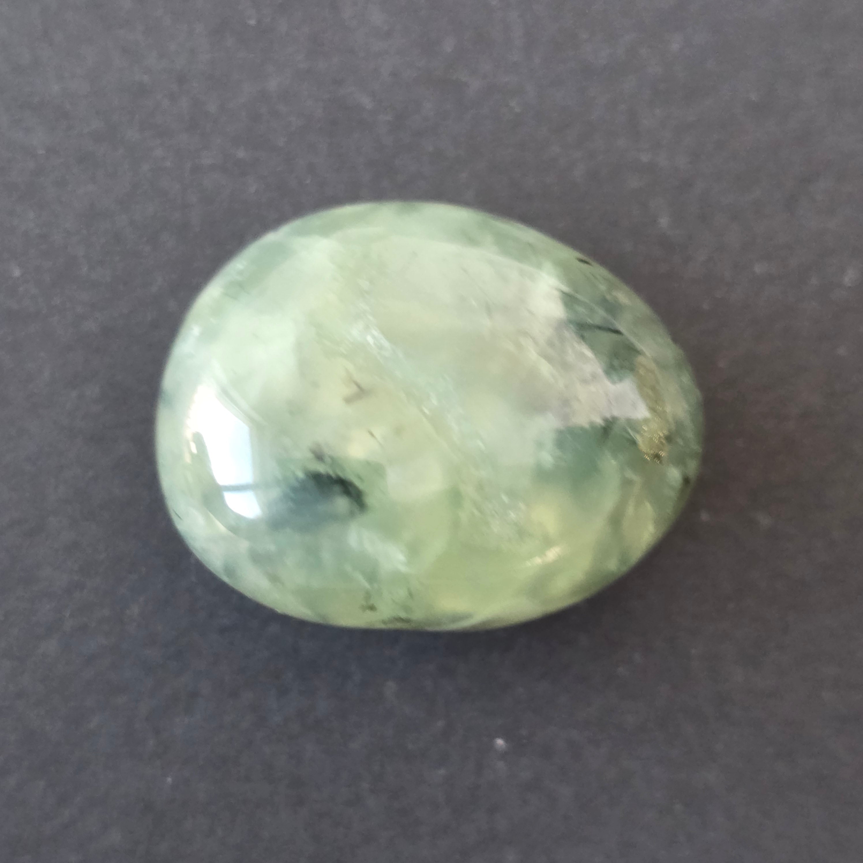 La préhnite est une pierre semi-précieuse de couleur vert pâle ou vert clair, composée de silicate d'aluminium et de calcium, avec de petites inclusions d'autres minéraux. Elle a été nommée d'après le colonel Hendrik Von Prehn, un minéralogiste néerlandais qui a découvert cette pierre pour la première fois en Afrique du Sud au XVIIIe siècle.