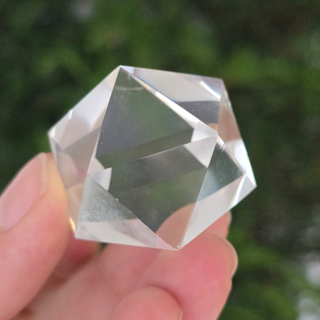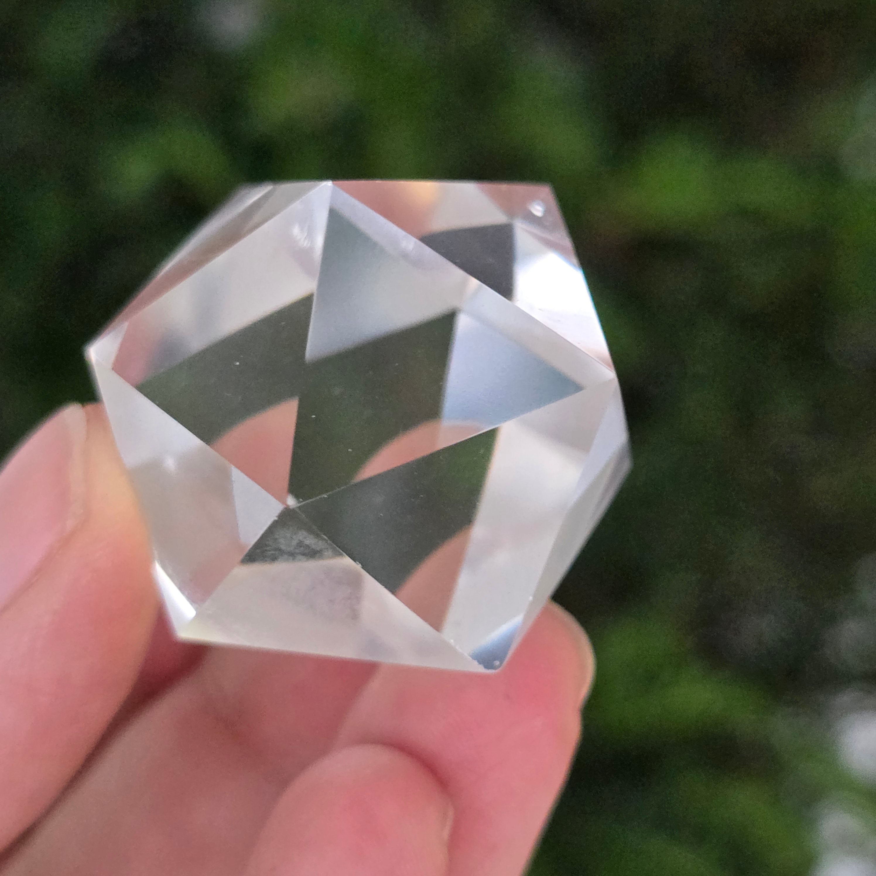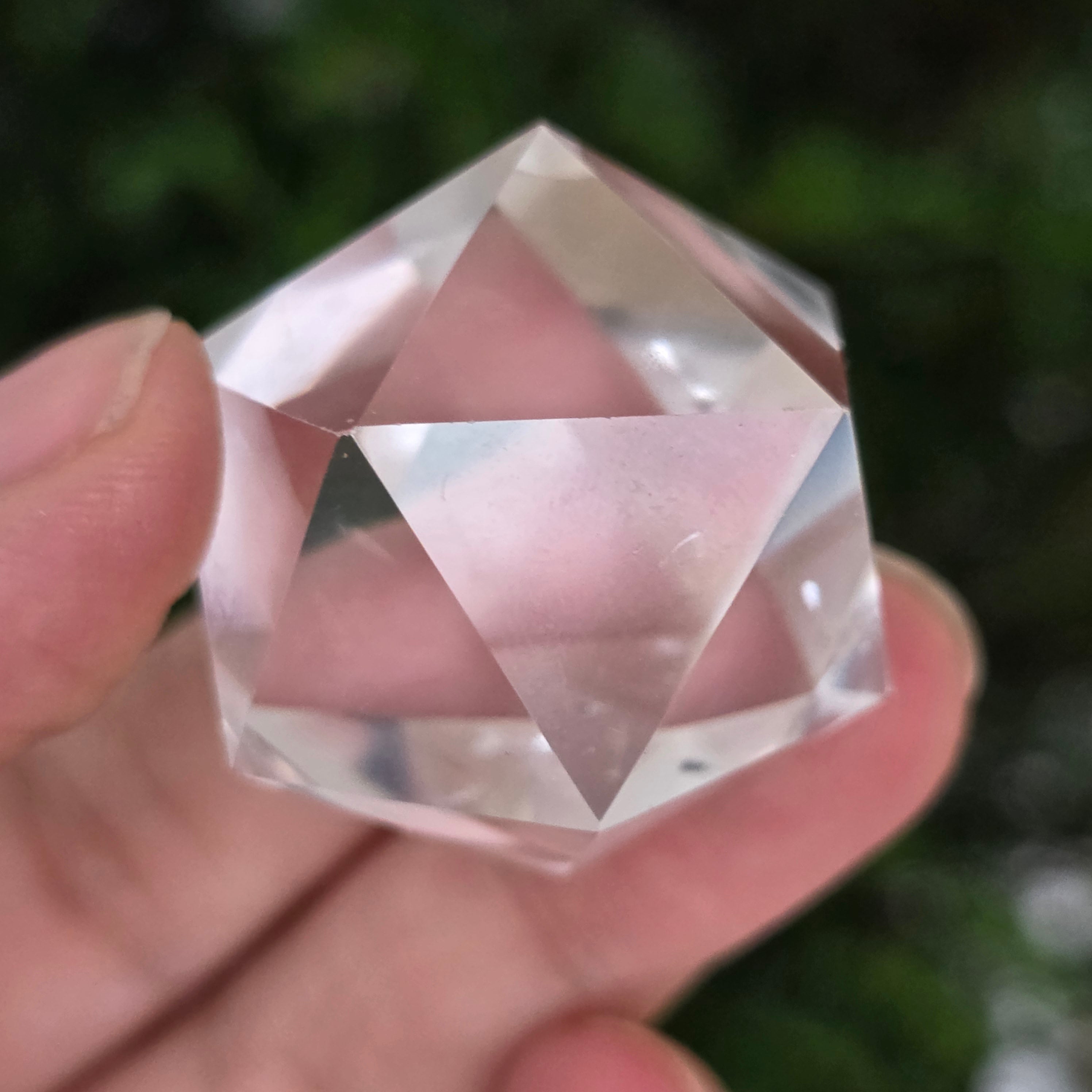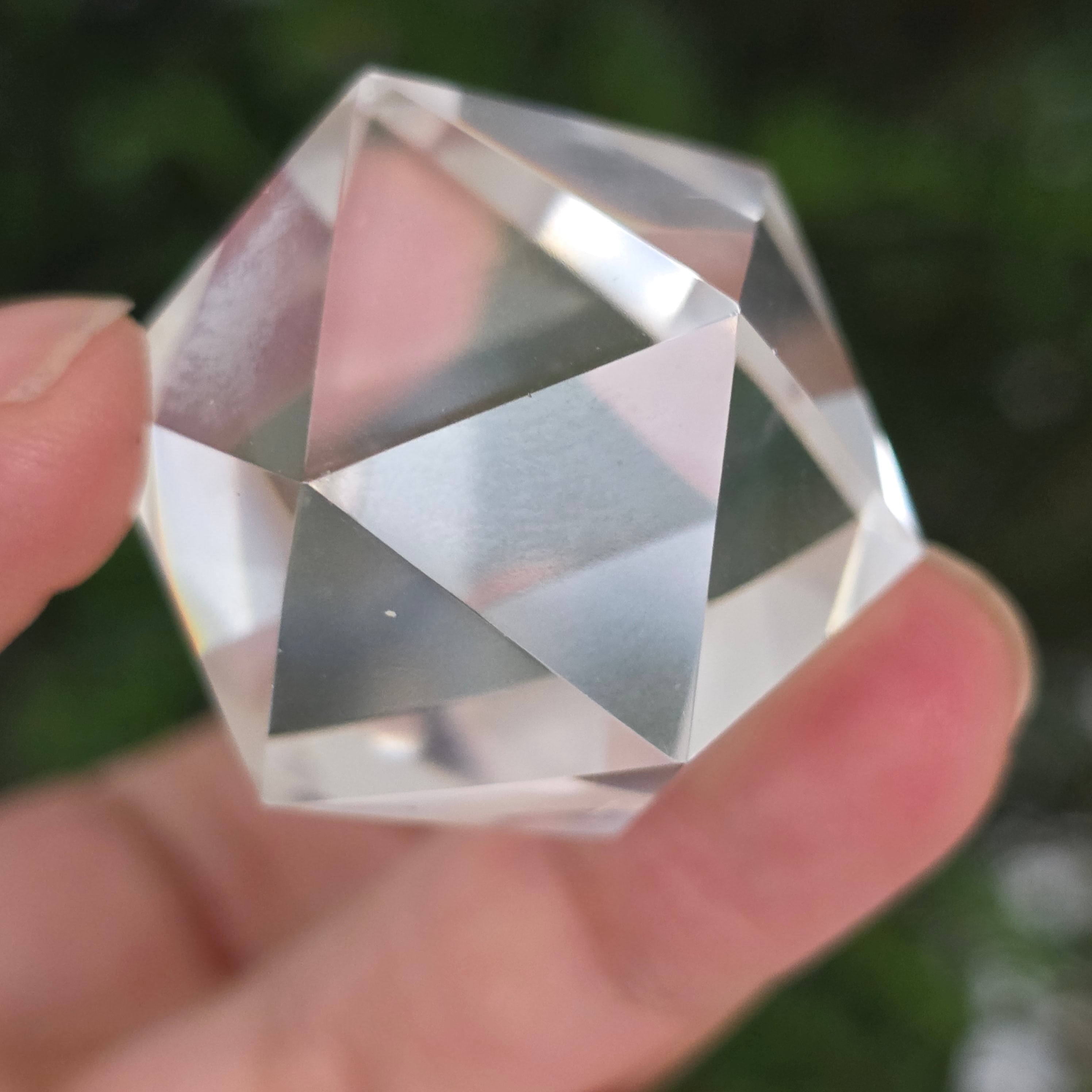 Icosaèdre en quartz incolore (cristal de roche), taillé à la main avec précision en forme de corps platonicien à 20 faces triangulaires équilatérales.