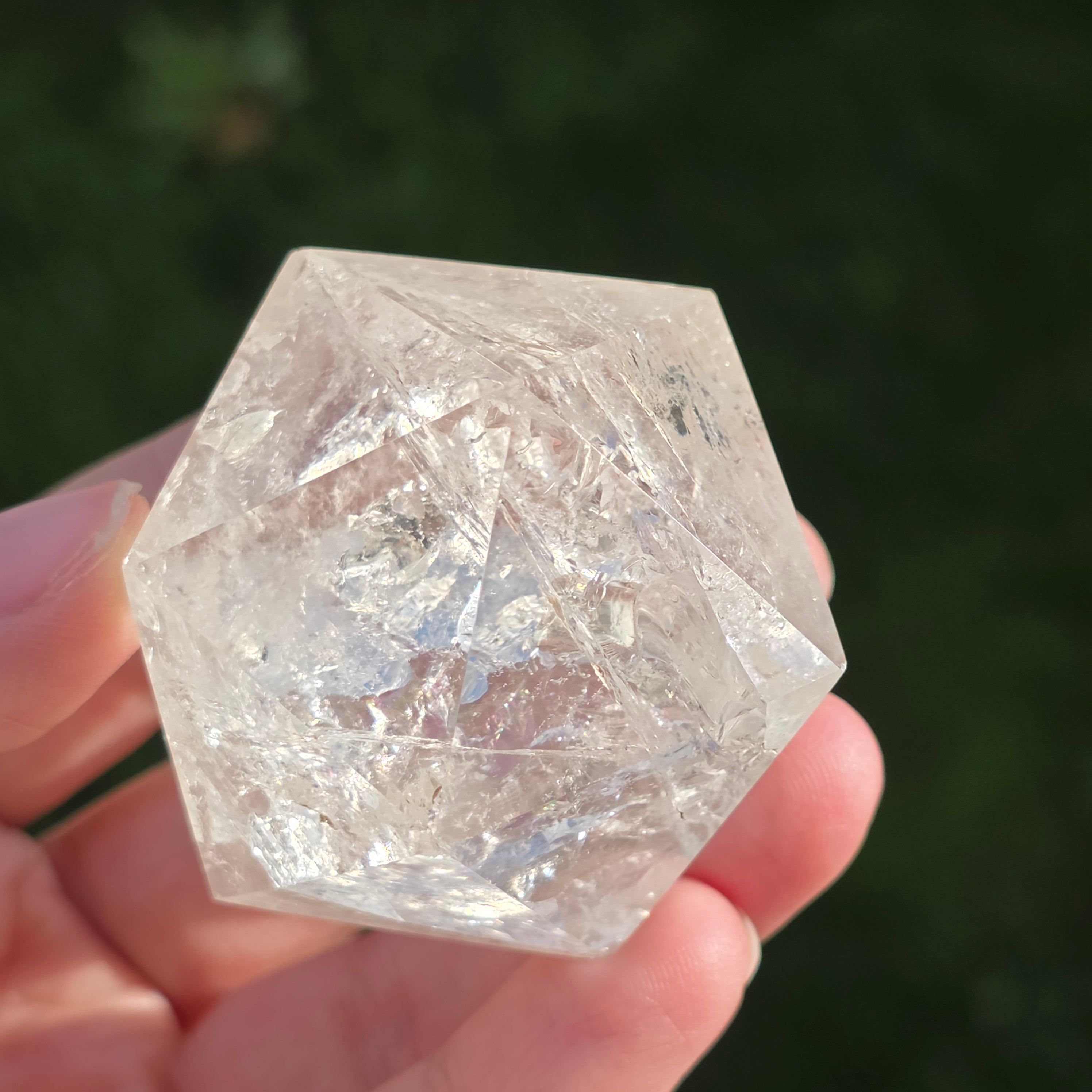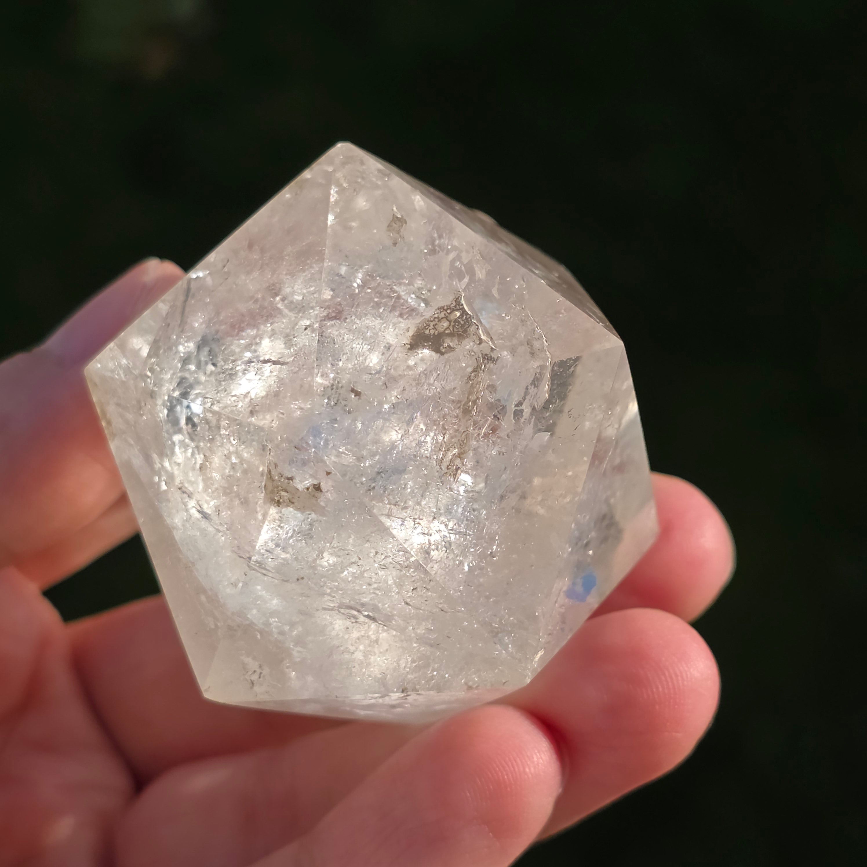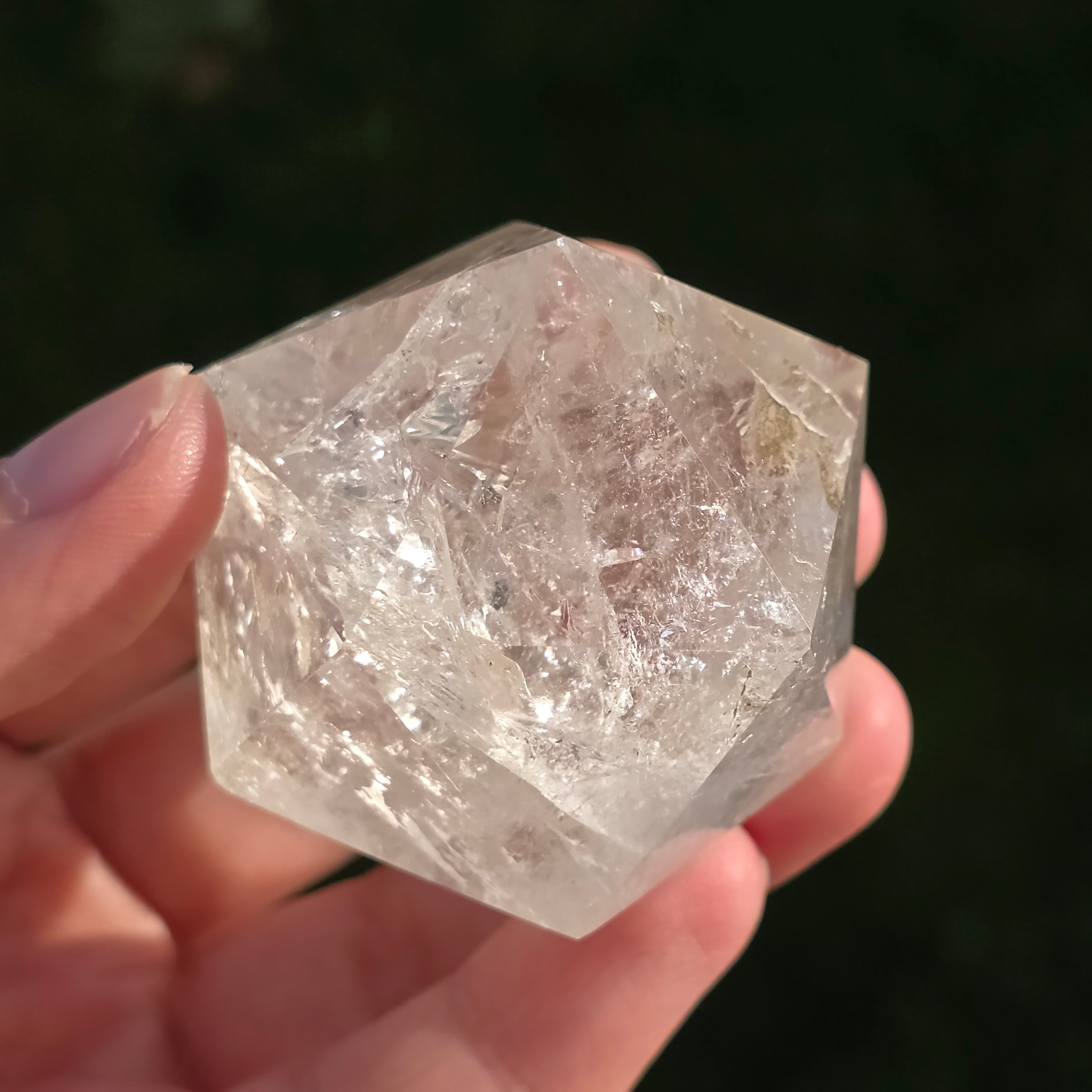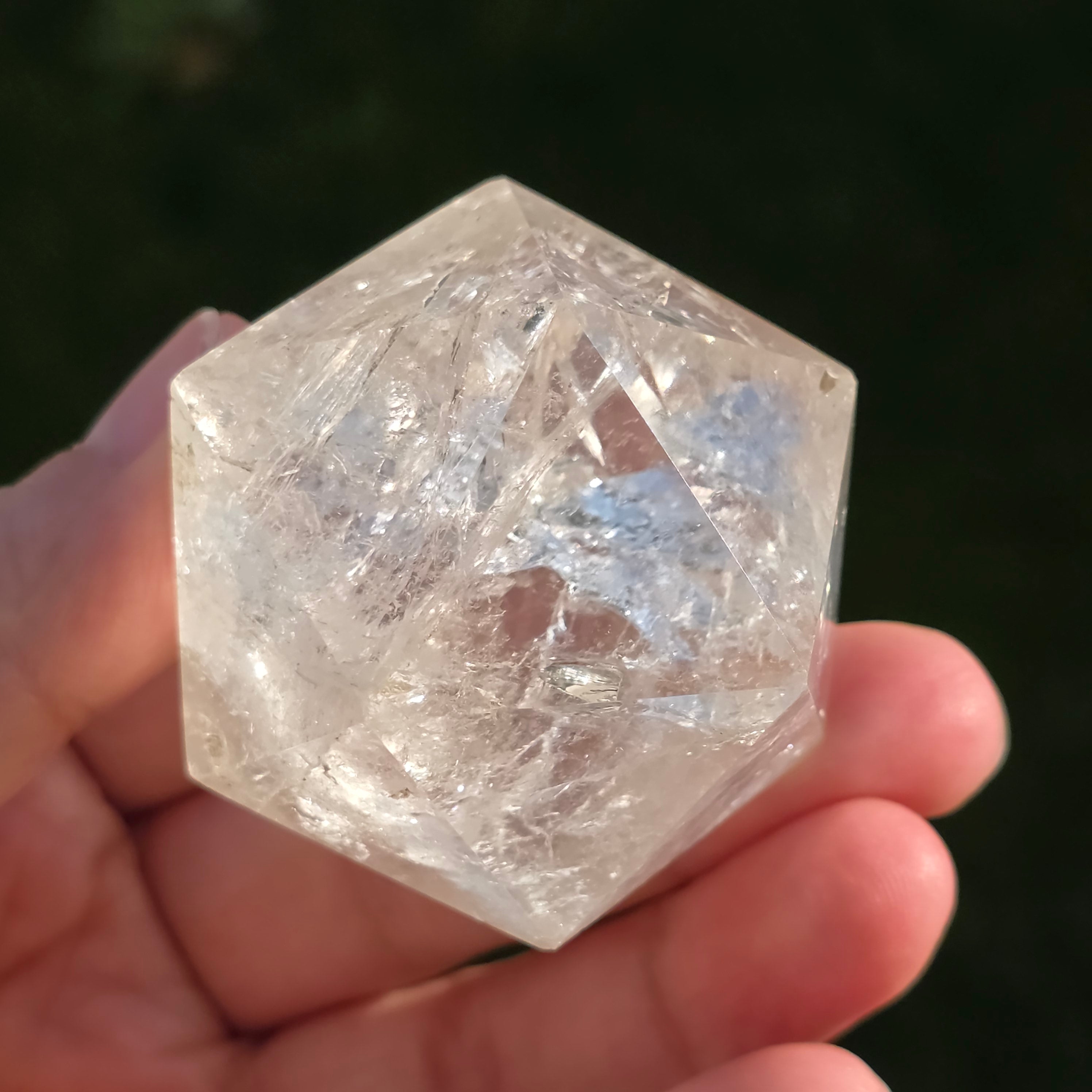 Icosaèdre de quartz incolore (cristal de roche), poli avec précision en forme de corps platonicien à 20 faces triangulaires équilatérales.