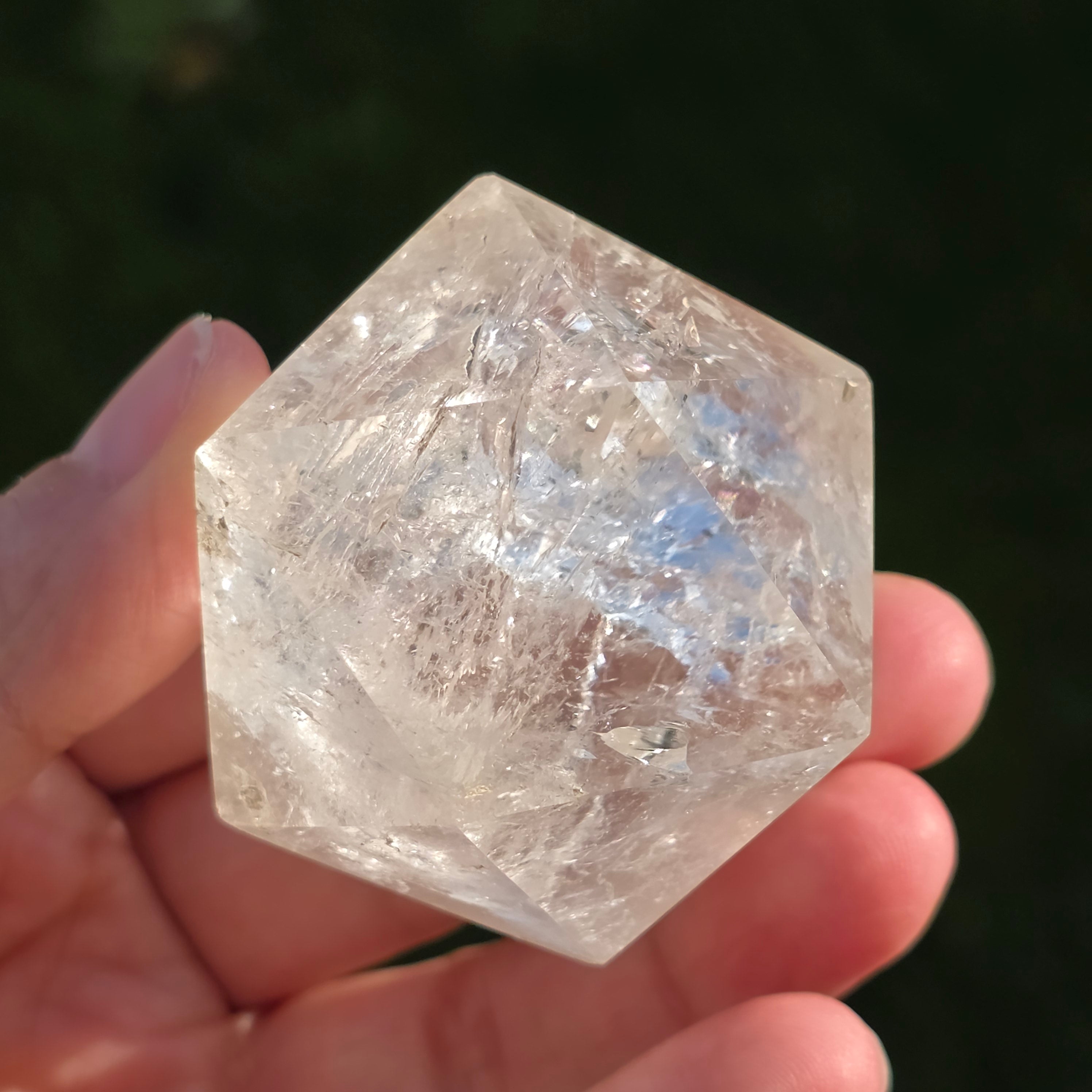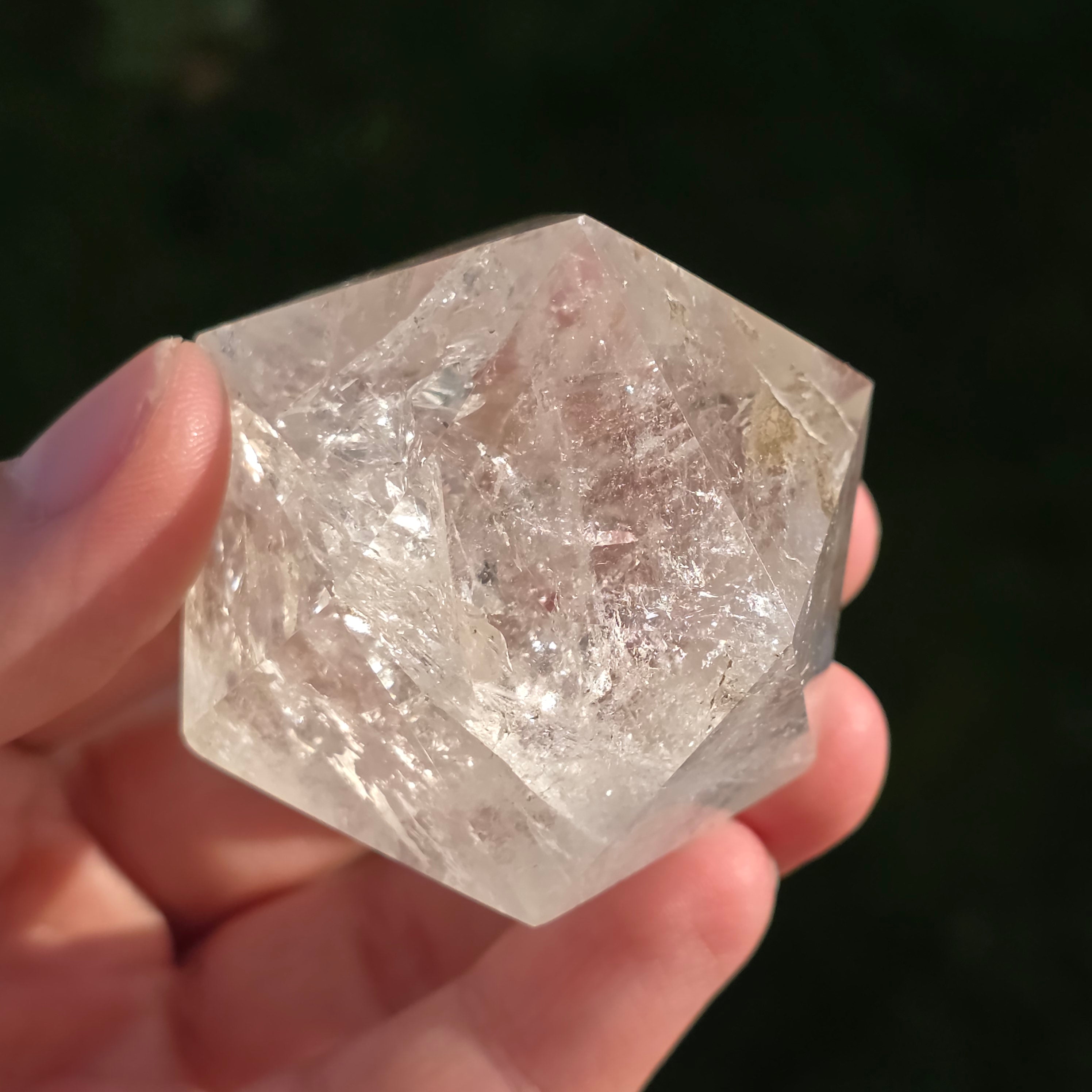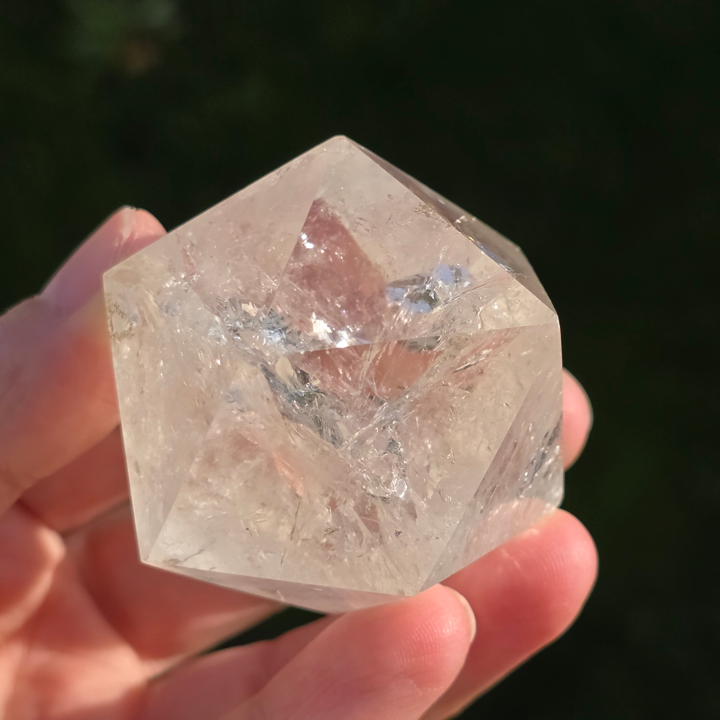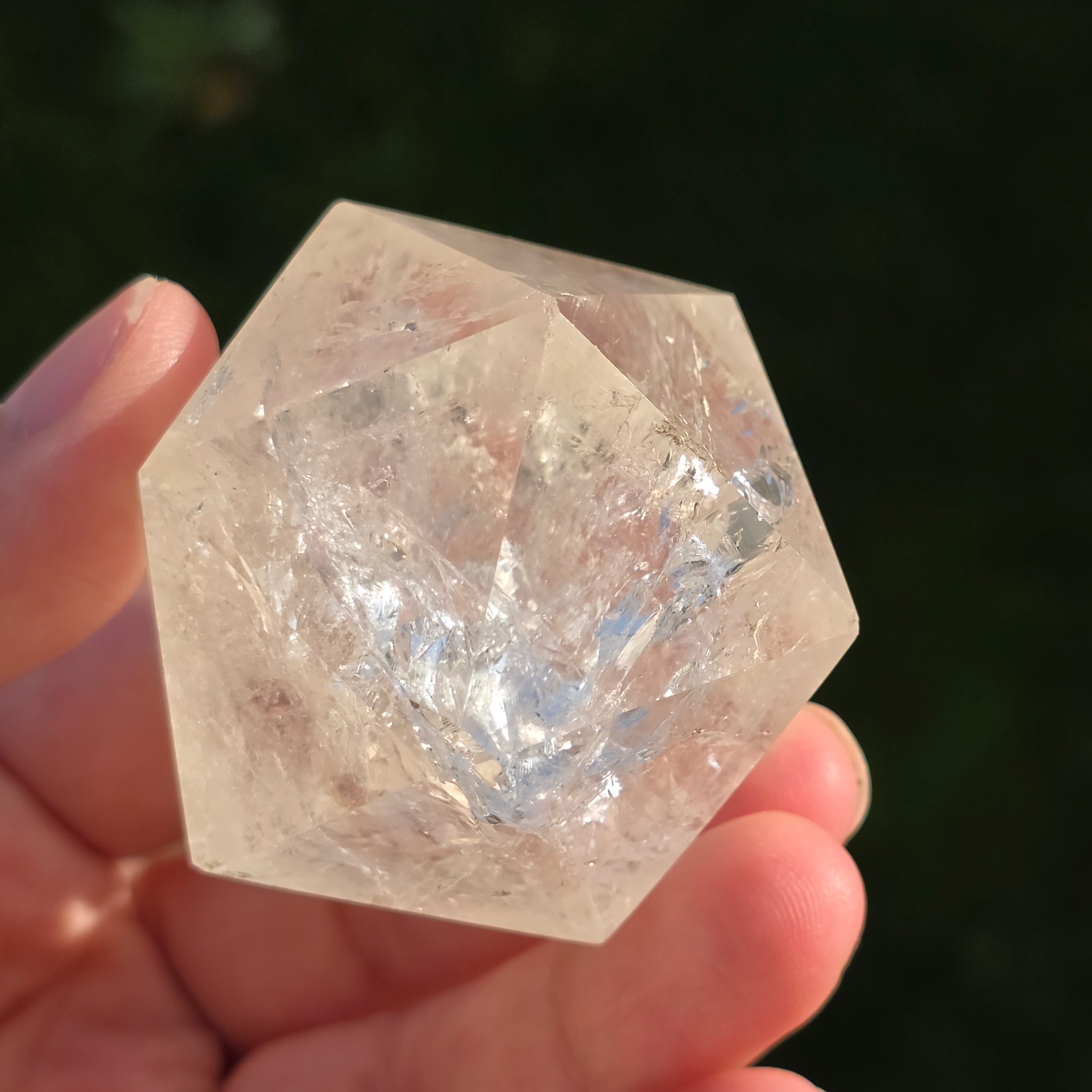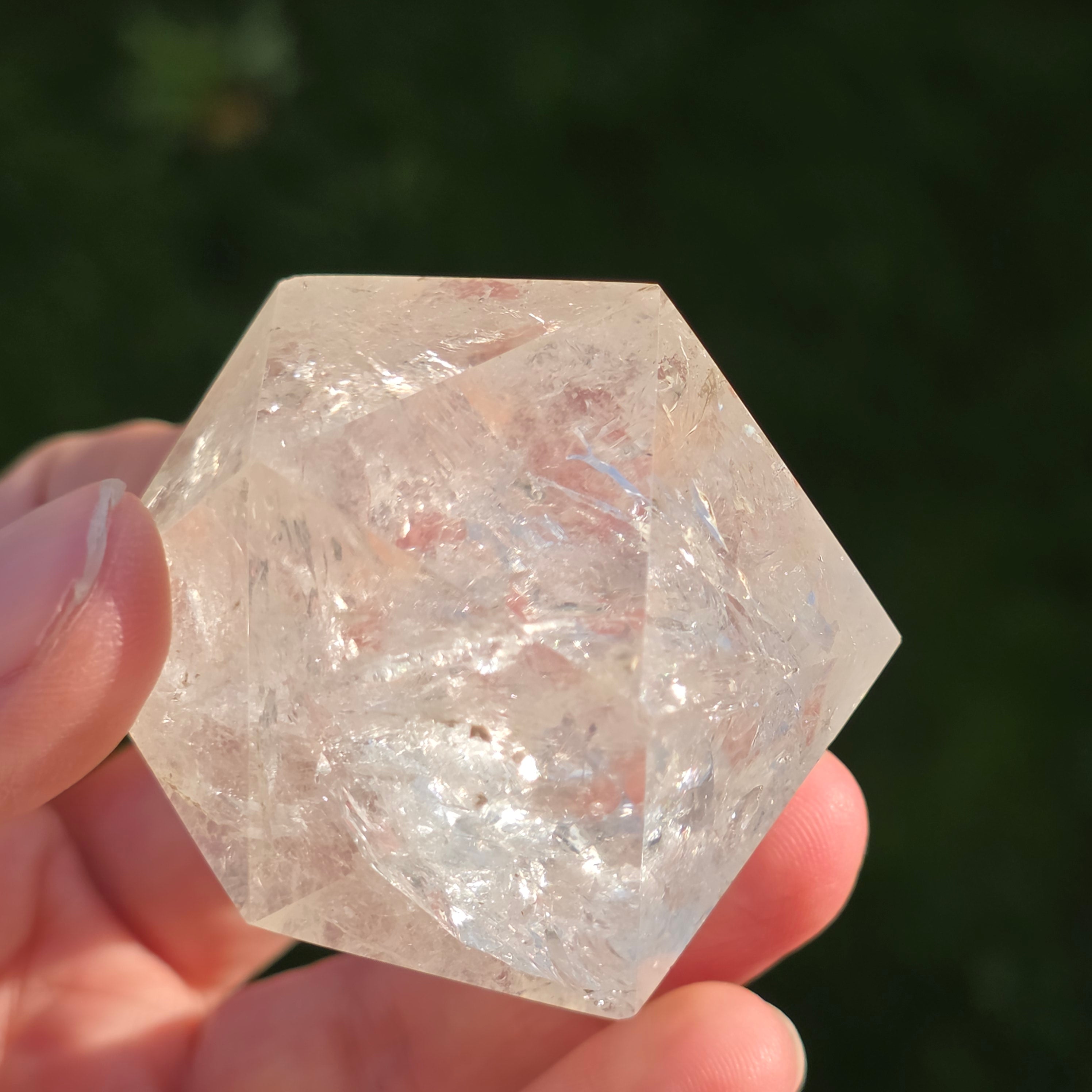 Icosaèdre de quartz incolore (cristal de roche), poli avec précision en forme de corps platonicien à 20 faces triangulaires équilatérales.
