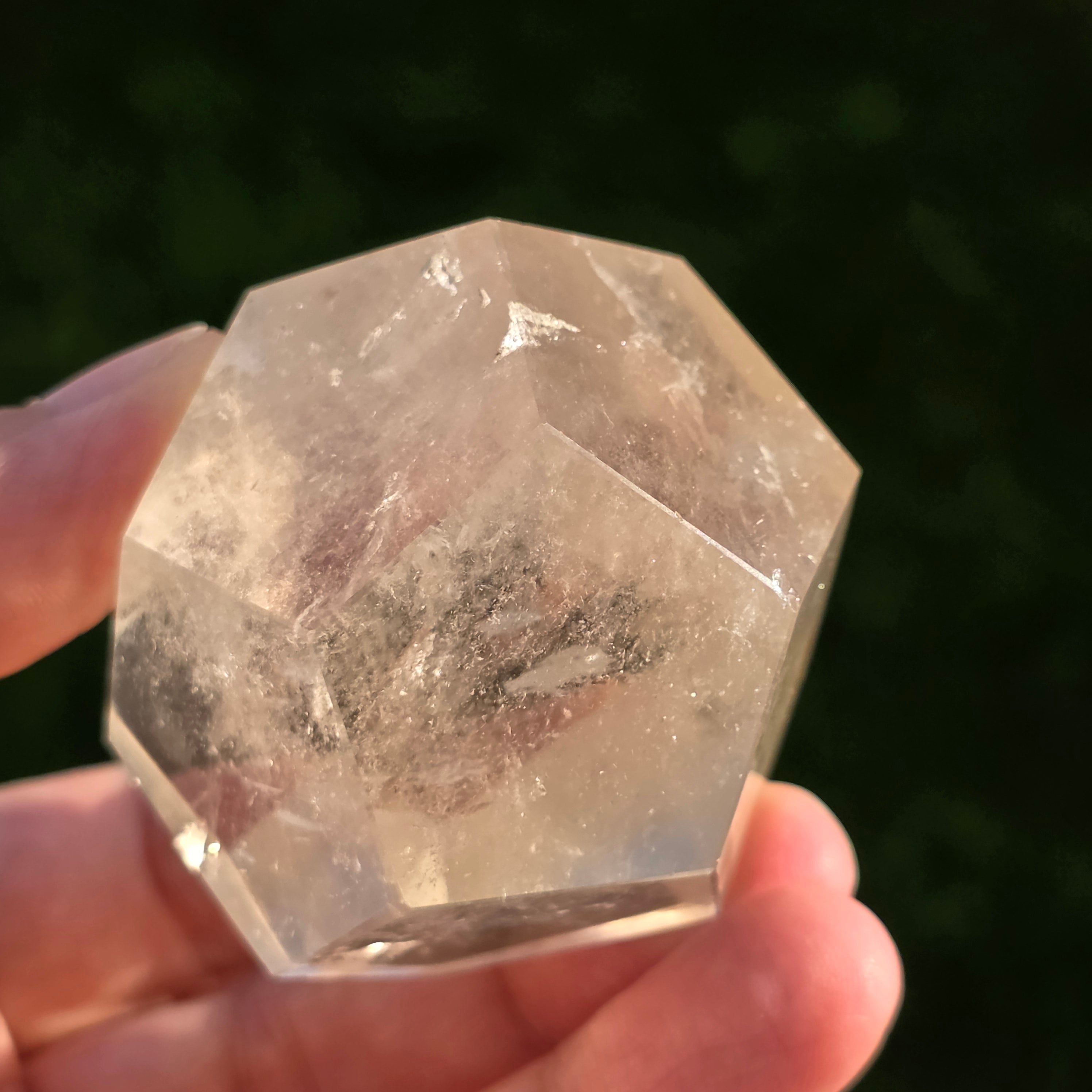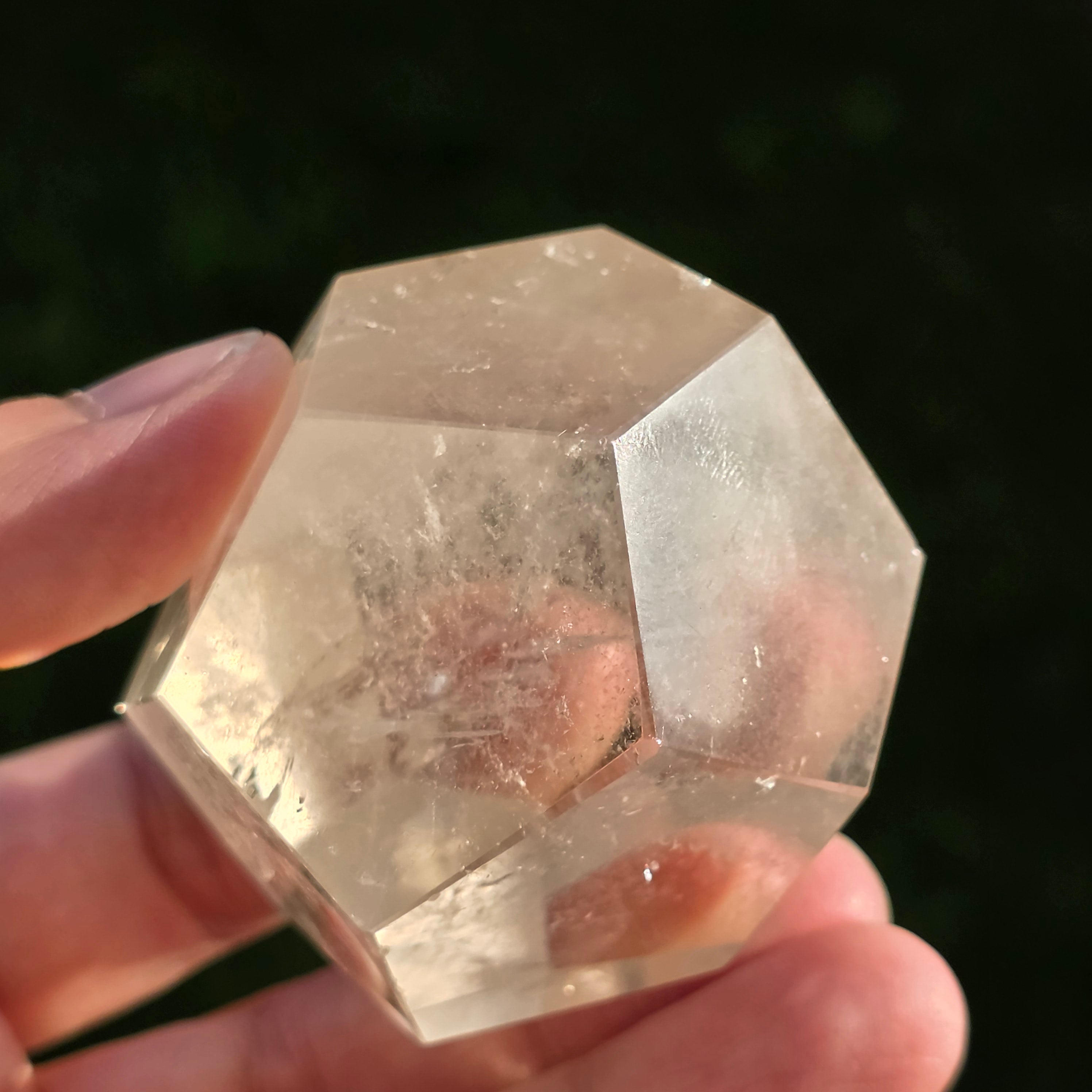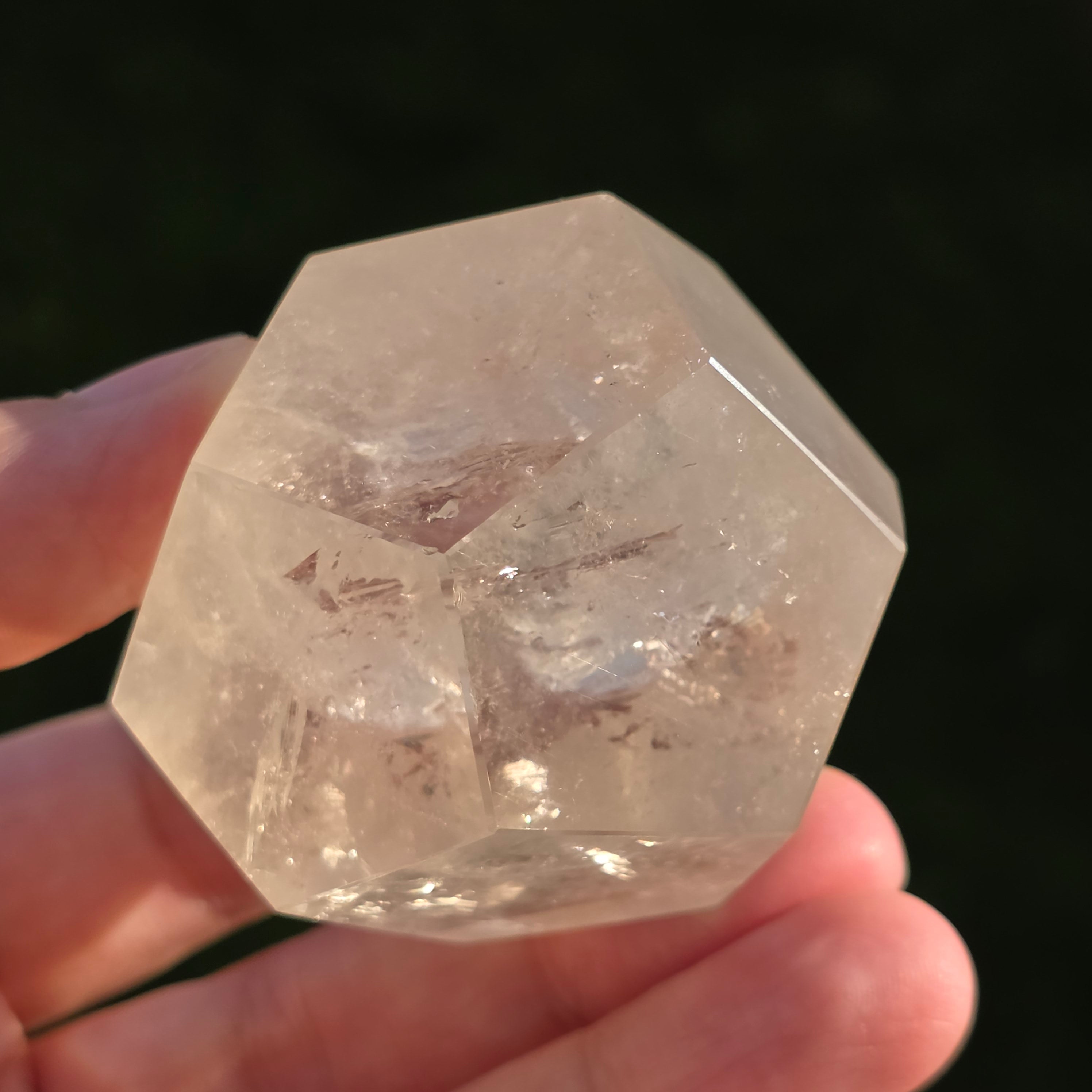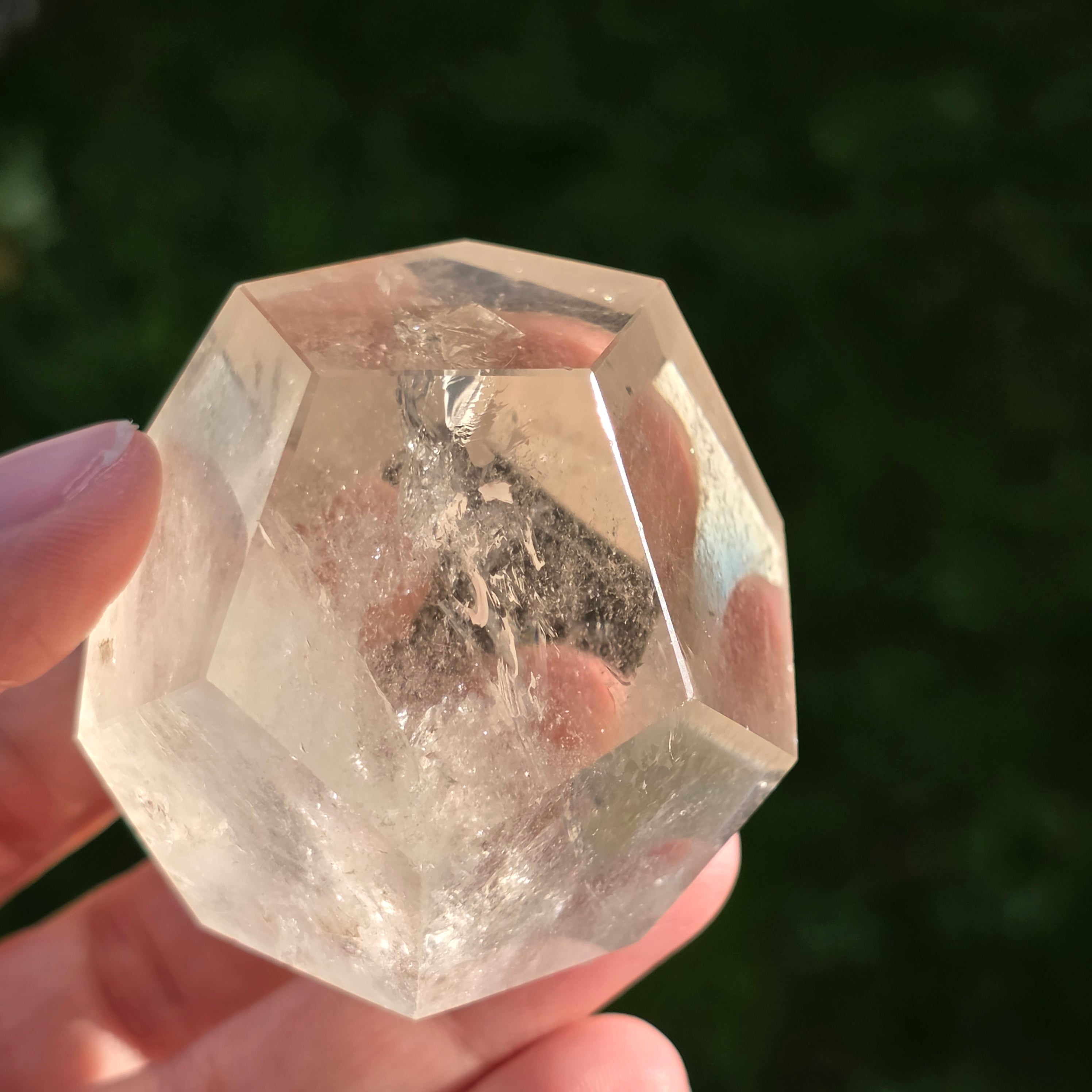 Icosaèdre de quartz incolore (cristal de roche), poli avec précision en forme de corps platonicien à 20 faces triangulaires équilatérales.