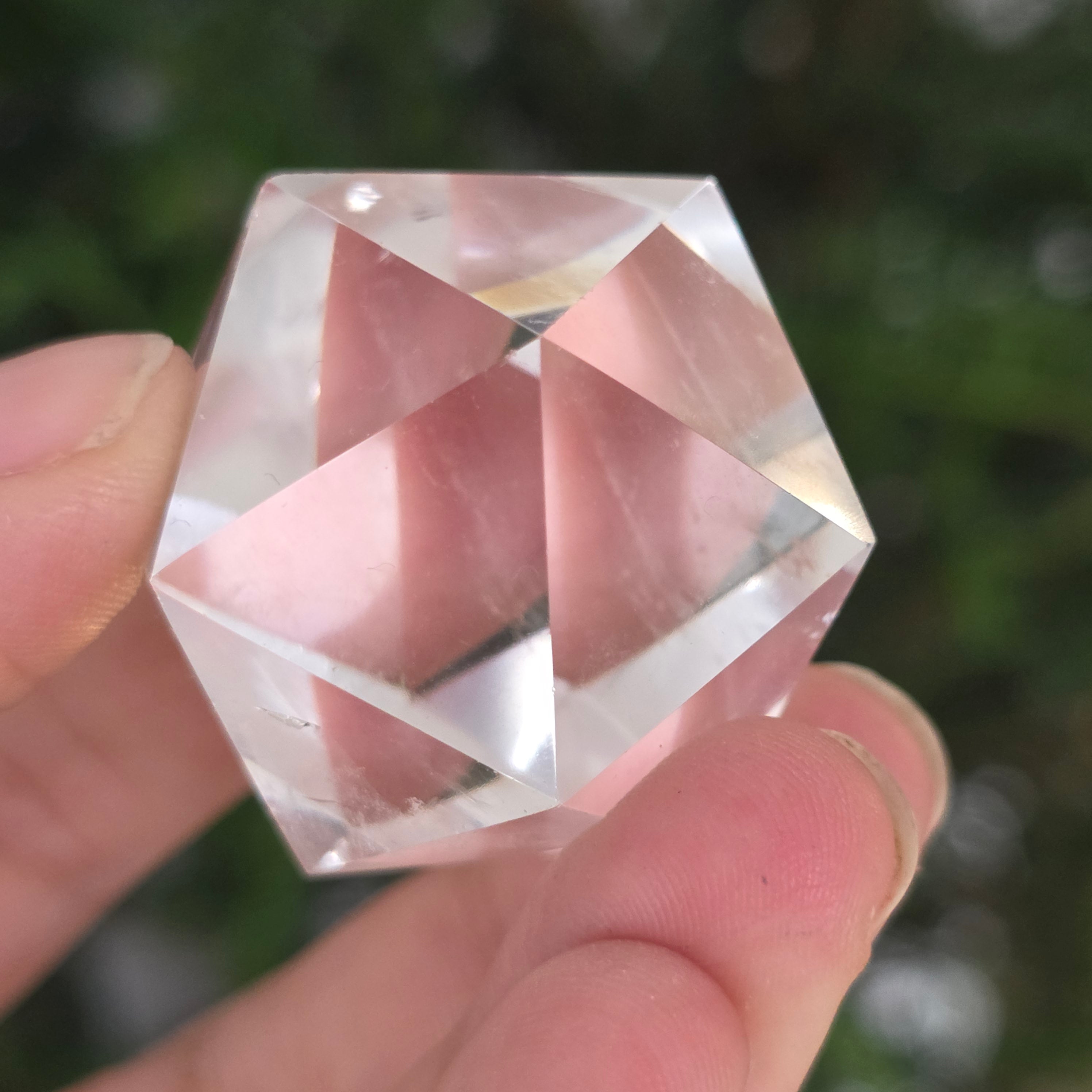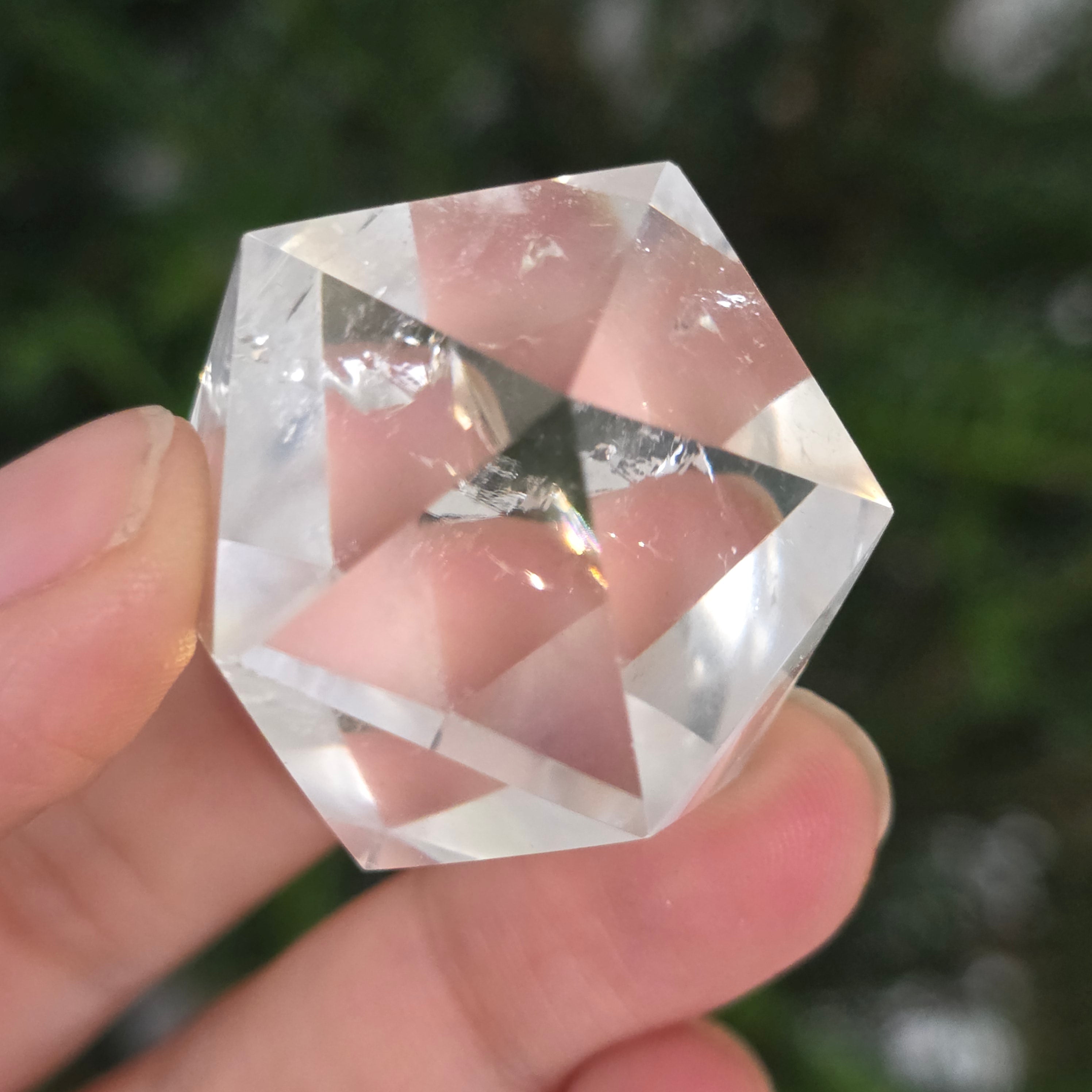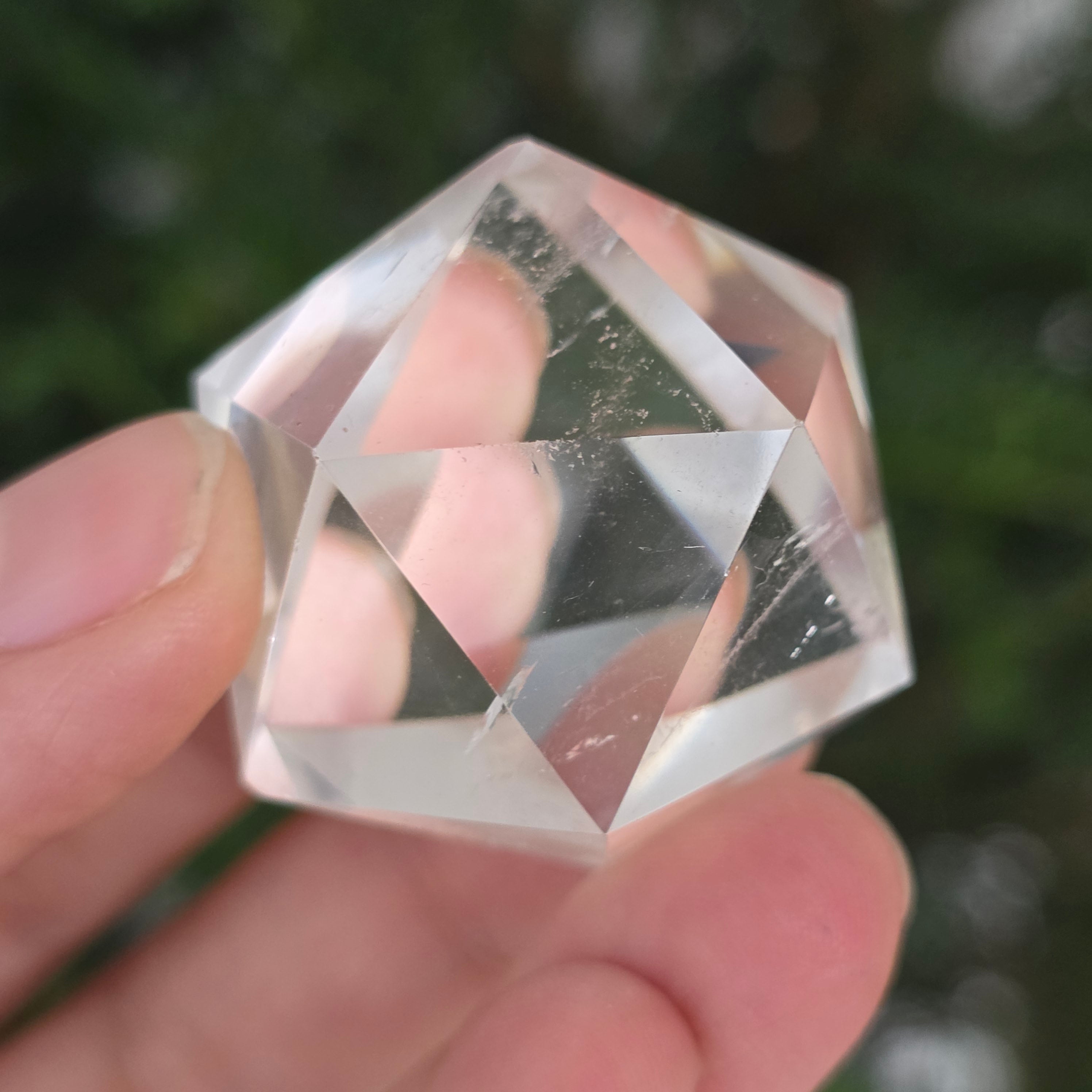 Icosaèdre de quartz incolore (cristal de roche), poli avec précision en forme de corps platonicien à 20 faces triangulaires équilatérales.