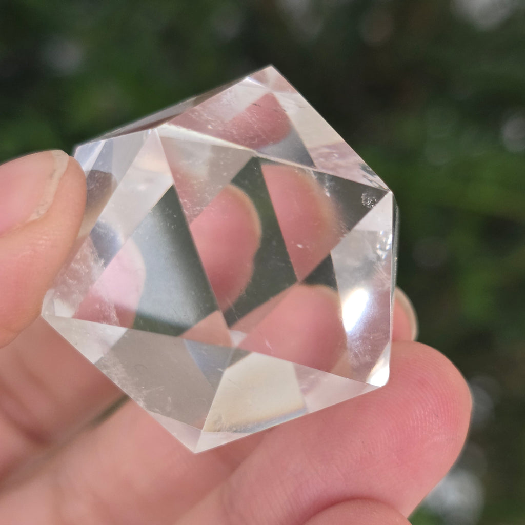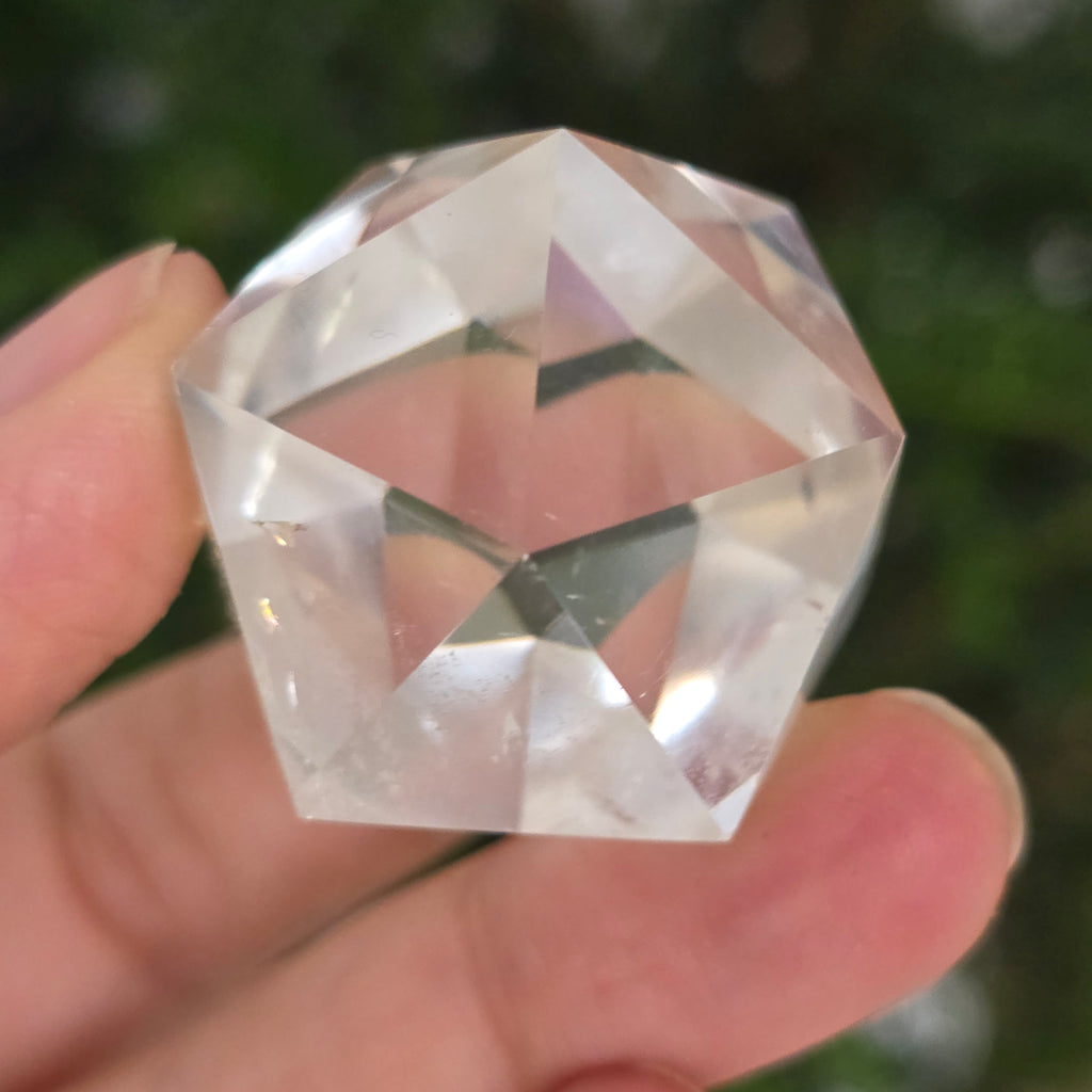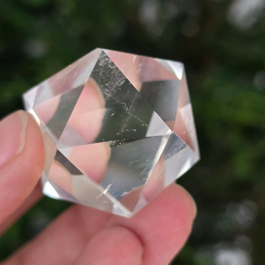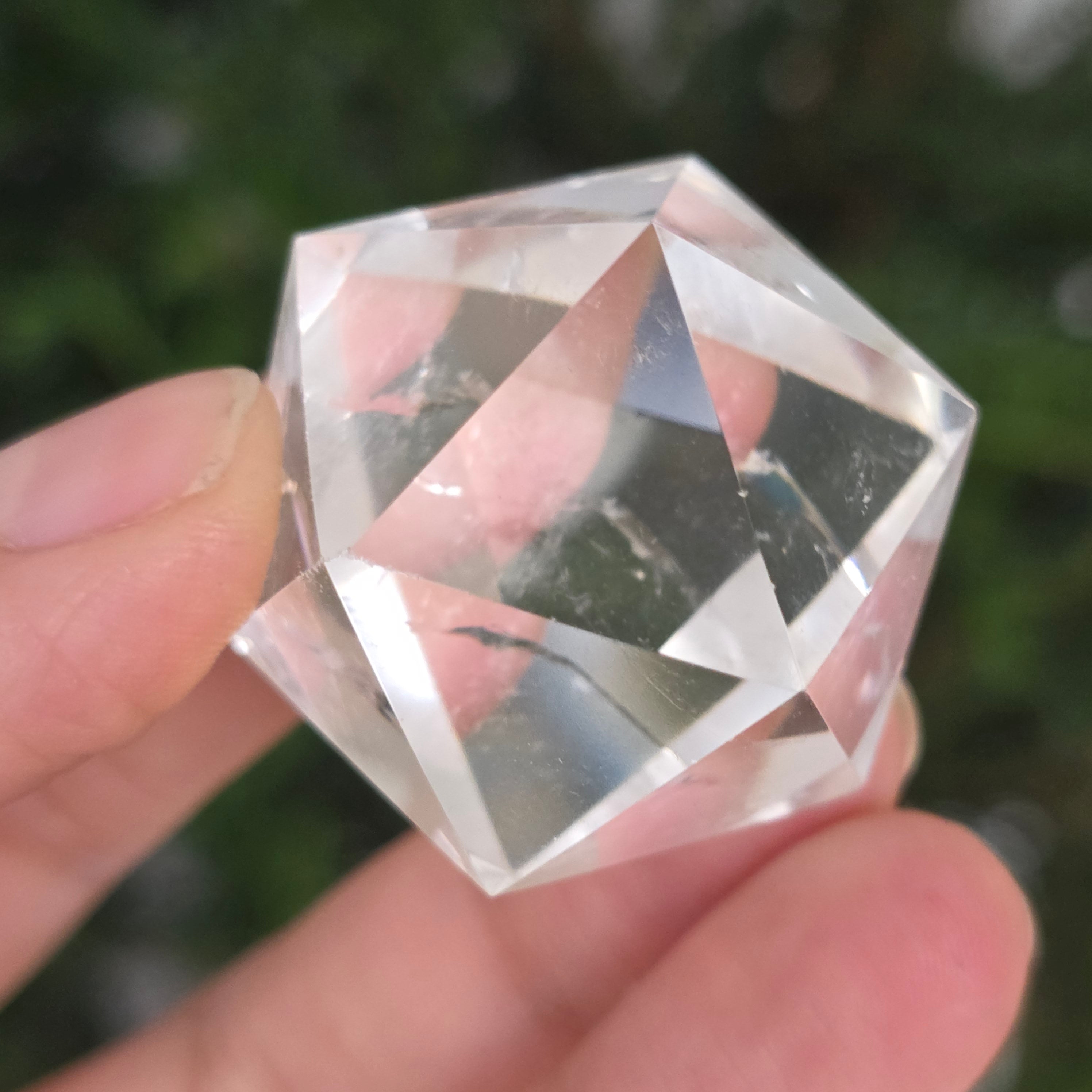 Icosaèdre de quartz incolore (cristal de roche), poli avec précision en forme de corps platonicien à 20 faces triangulaires équilatérales.