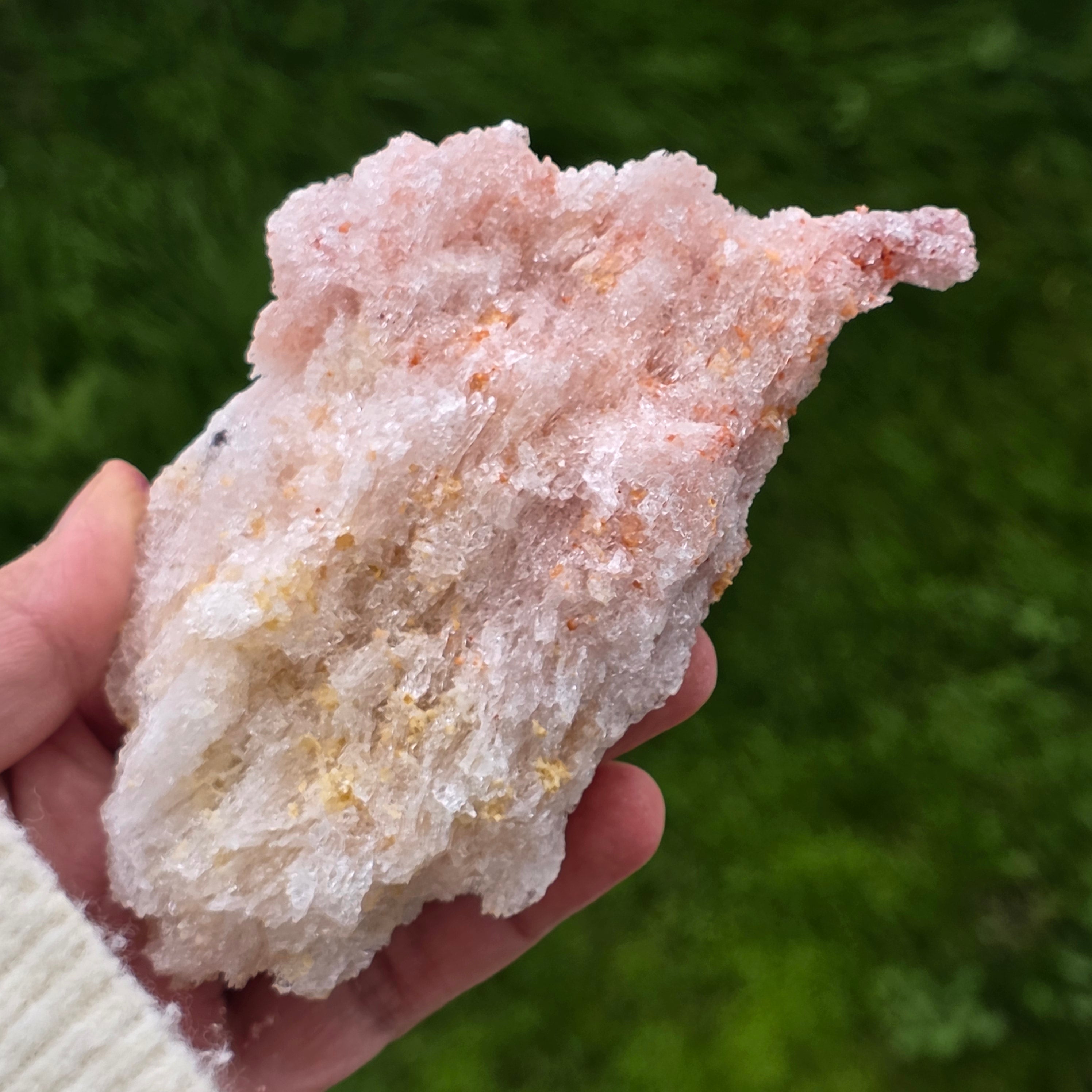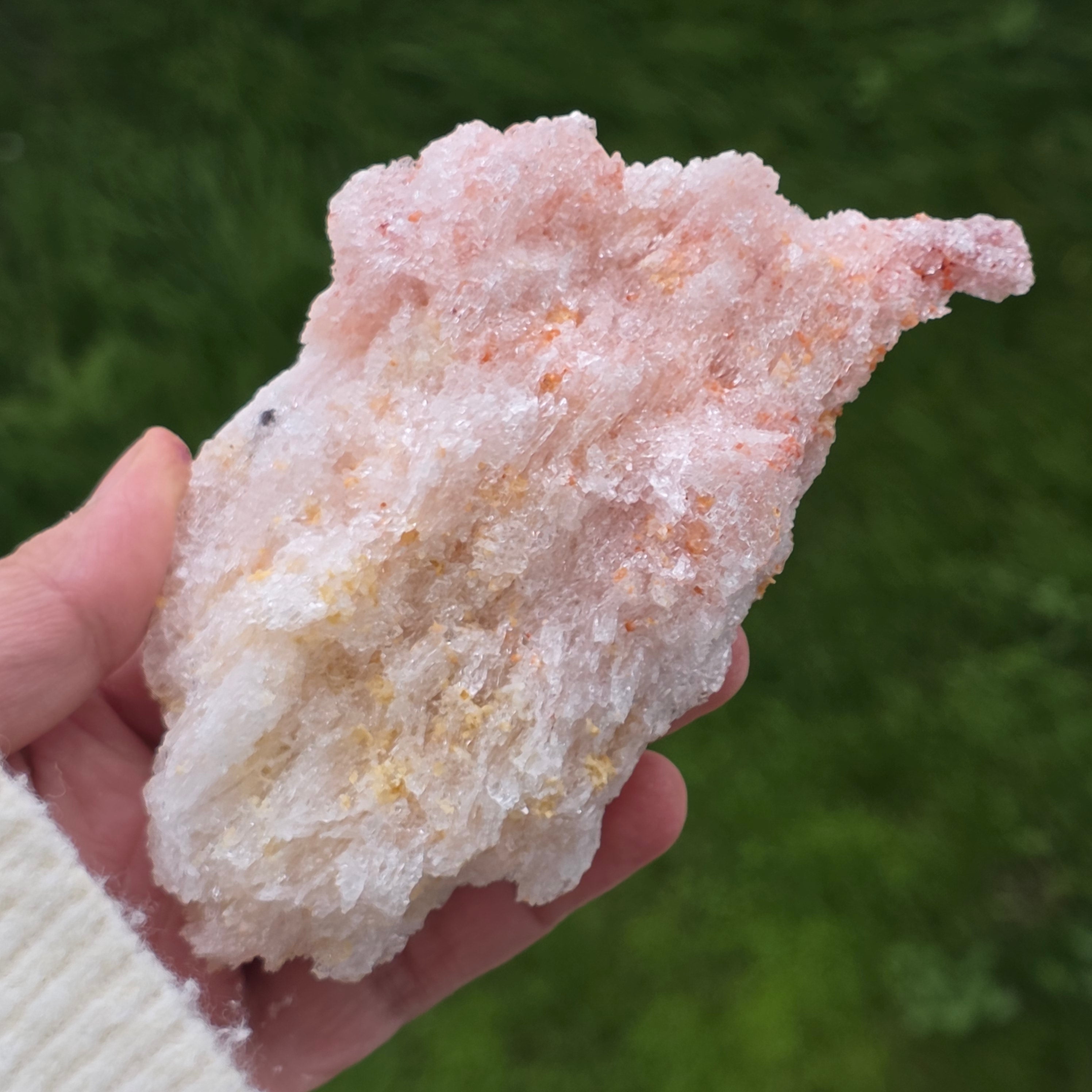 Rezultatul este o asociere mineralogică coerentă, în care matricea alb-translucidă de selenit este traversată sau punctată de incluziuni roșii de cinabar, fără delimitări artificiale. Cele două minerale sunt intim legate structural și vizual, cinabarul accentuând forma și transparența selenitului, iar selenitul punând în evidență culoarea intensă a cinabarului.