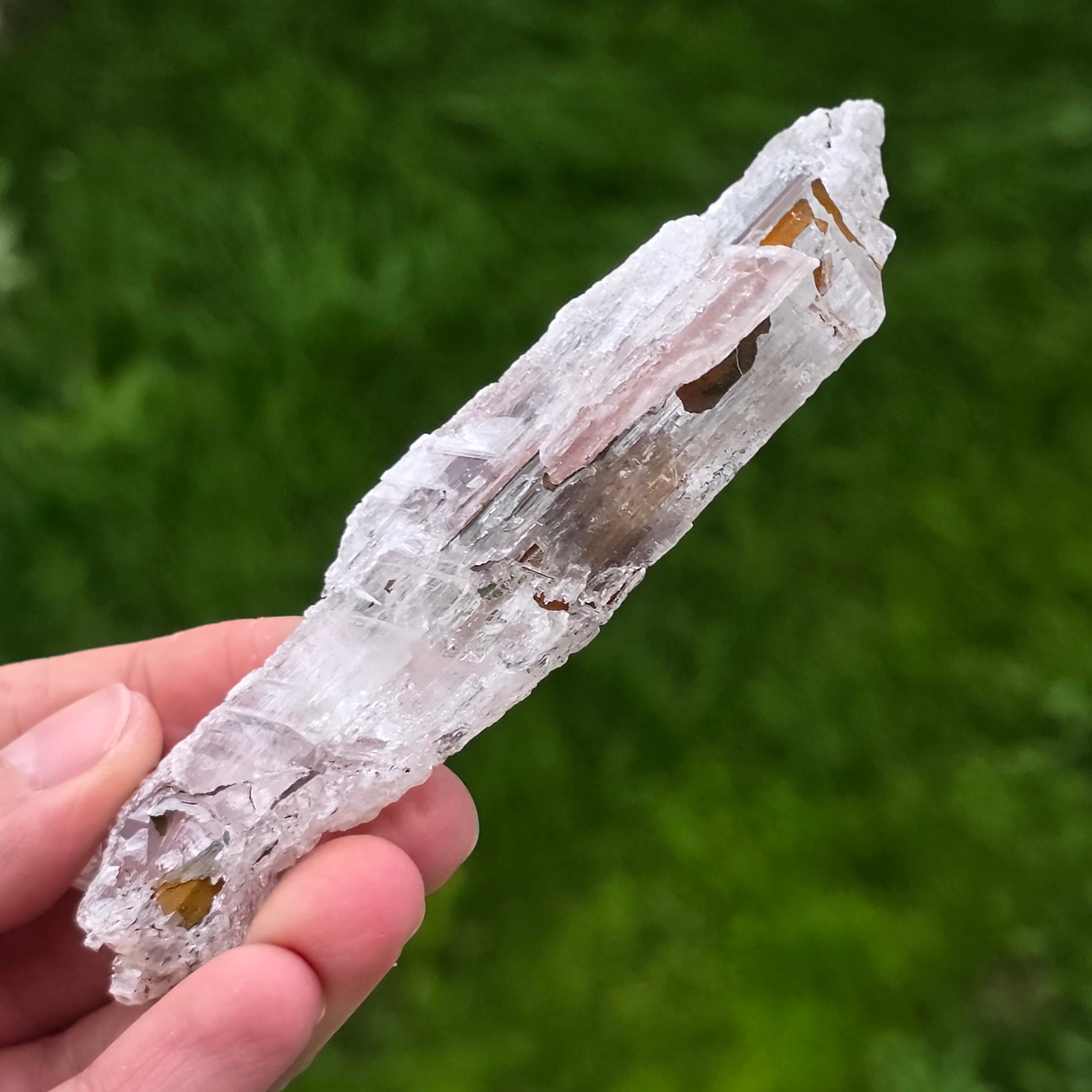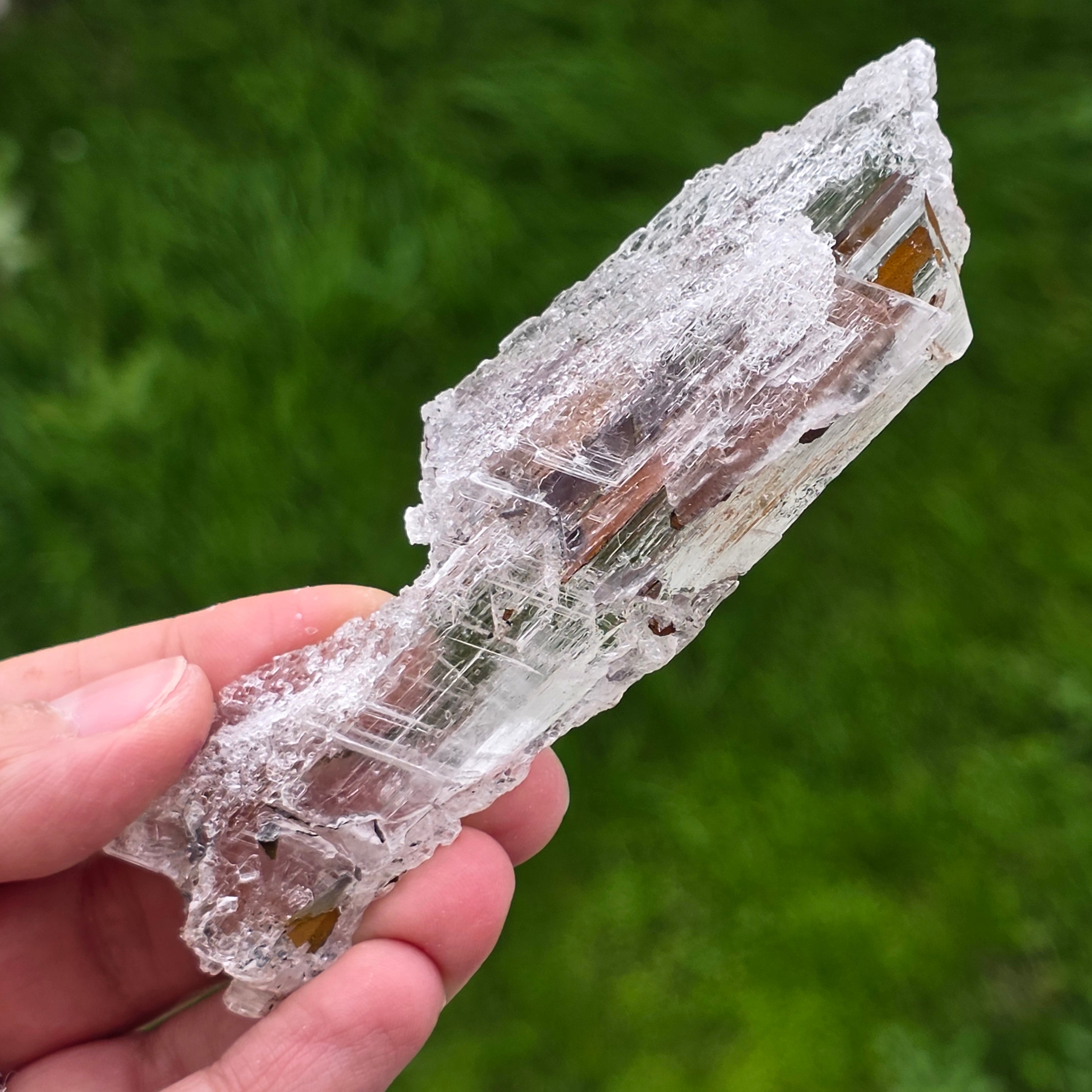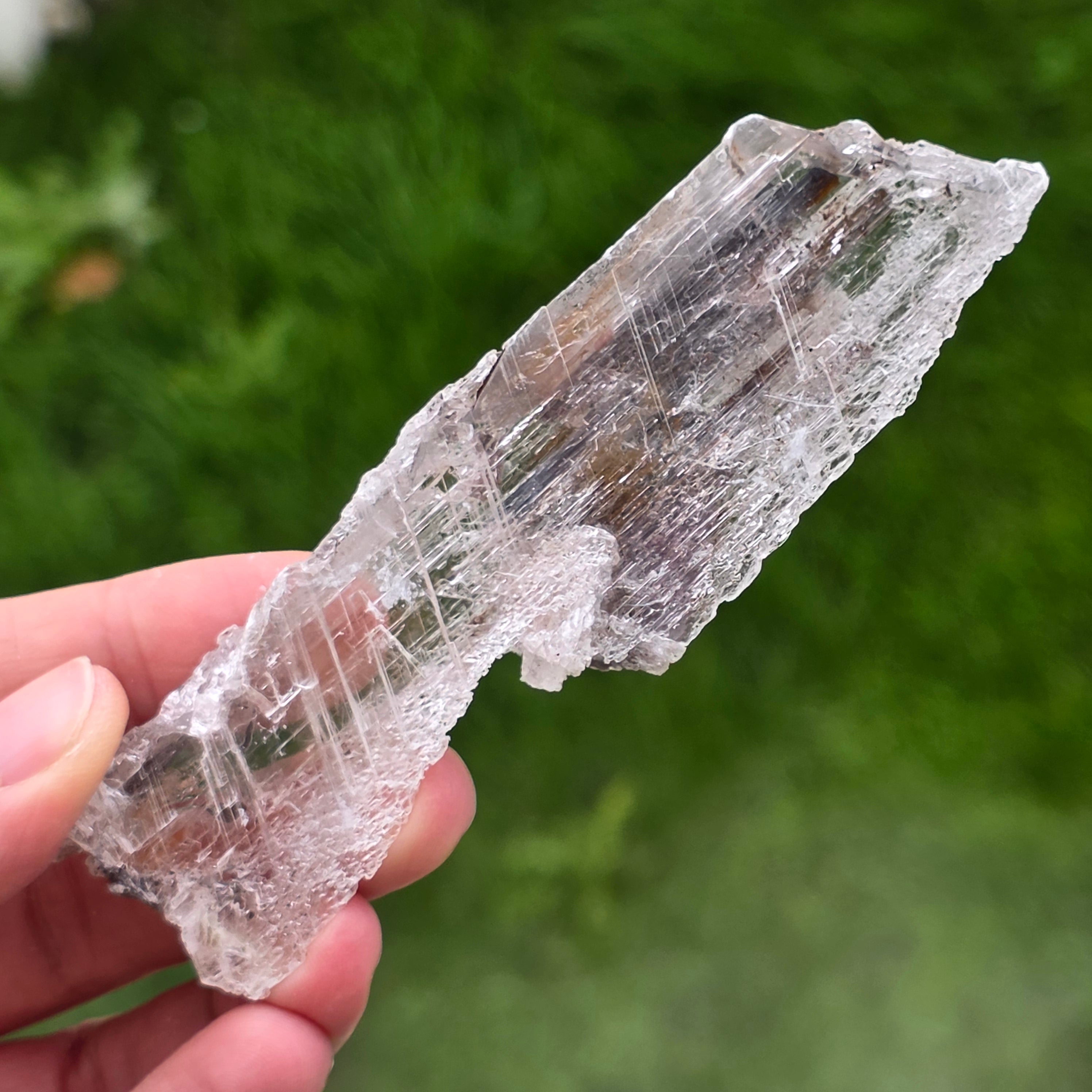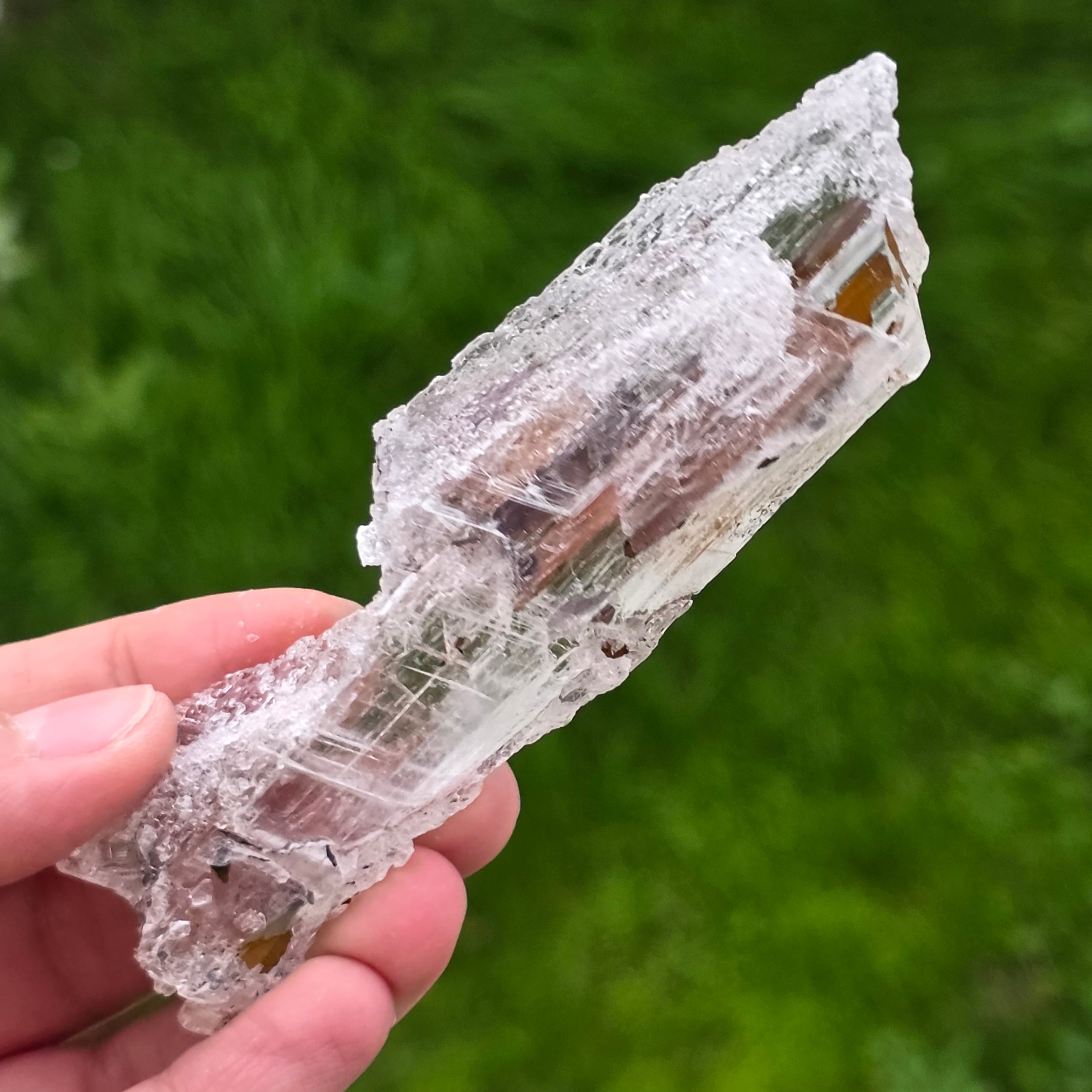 Selenitul apare sub formă de cristale alungite sau plăci translucide, cu luciu mătăsos și textură fină, în timp ce hematitul este prezent sub formă de incluziuni, pelicule sau depuneri naturale, care accentuează structura cristalului și îi conferă profunzime vizuală.