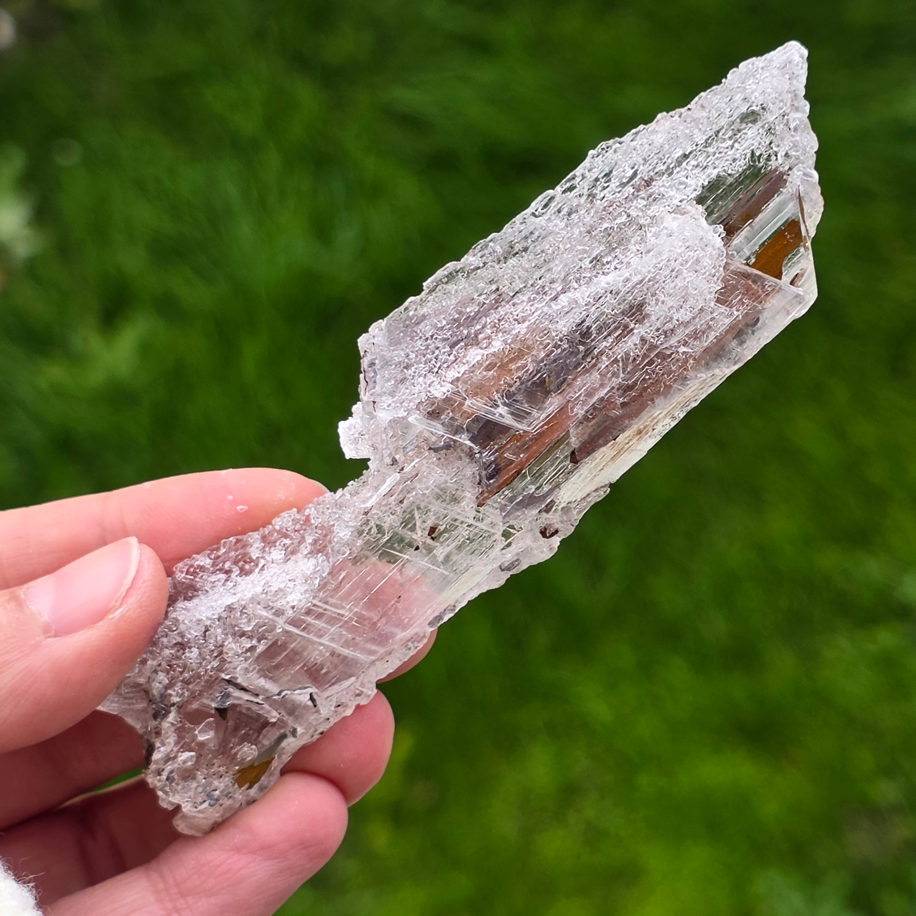 Acest specimen de selenit cu hematit din Mexic este o piesă mineralogică autentică, apreciată pentru contrastul natural dintre transparența lăptoasă a selenitului și nuanțele metalice, brun-roșiatice ale hematitului. Asocierea dintre aceste două minerale creează un aspect vizual puternic.