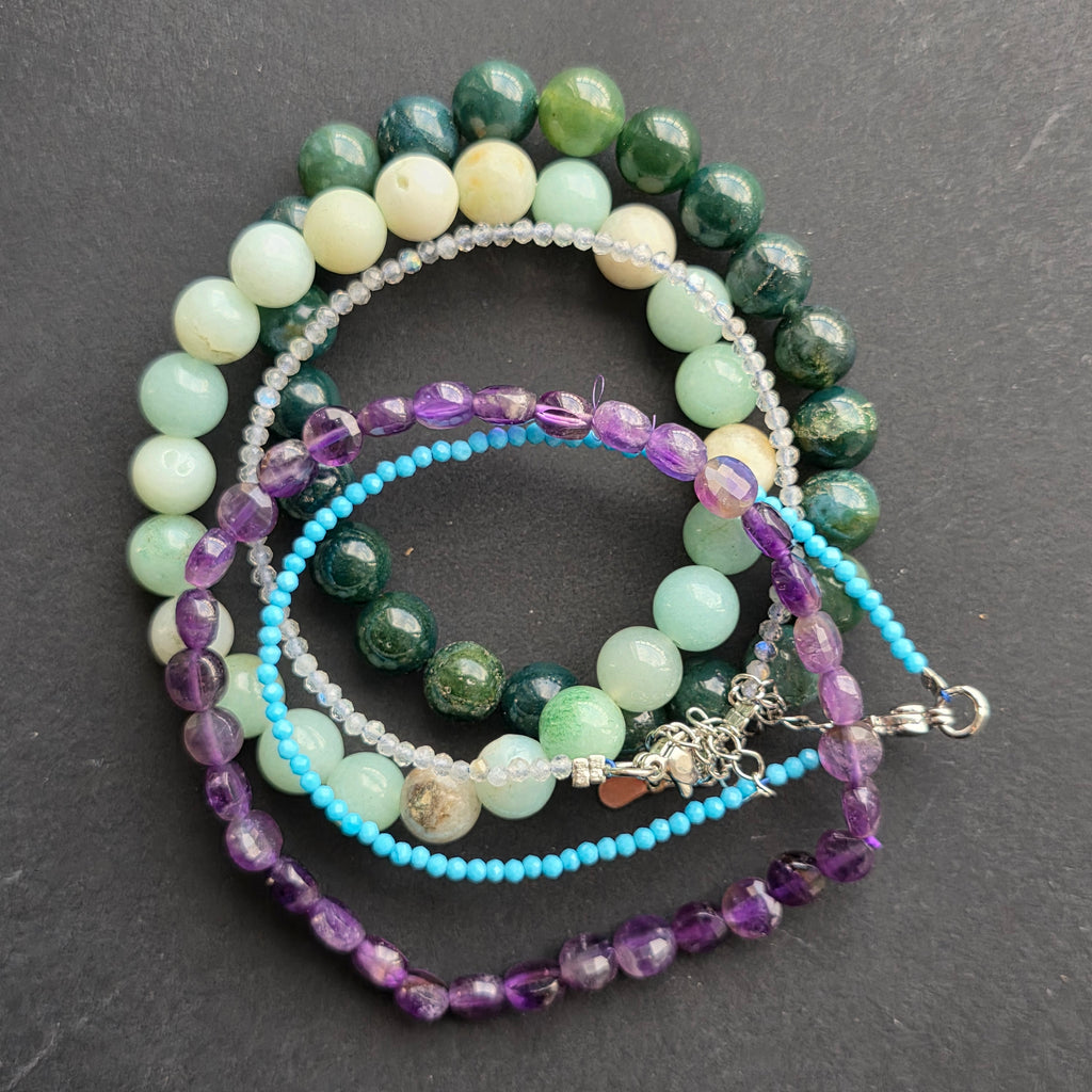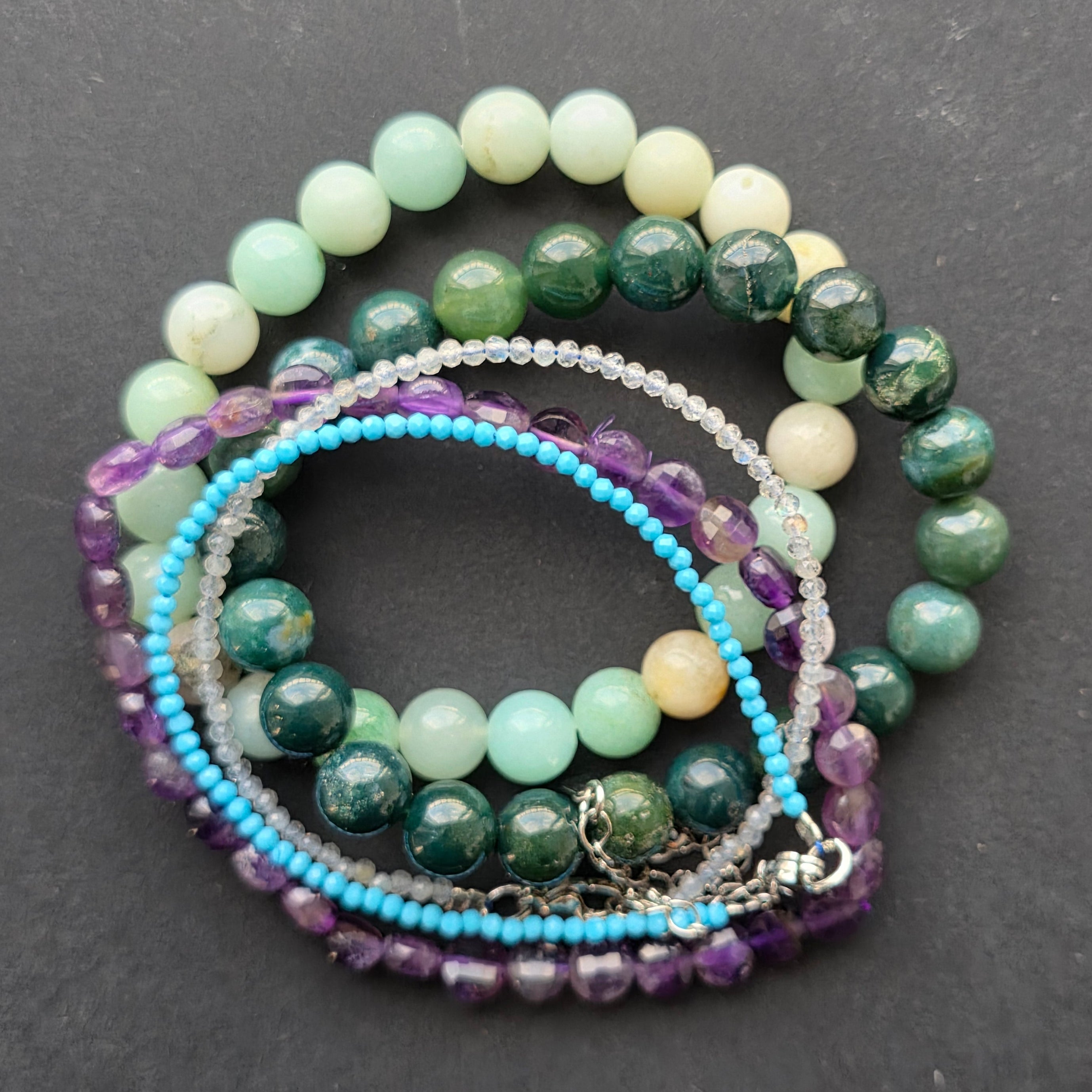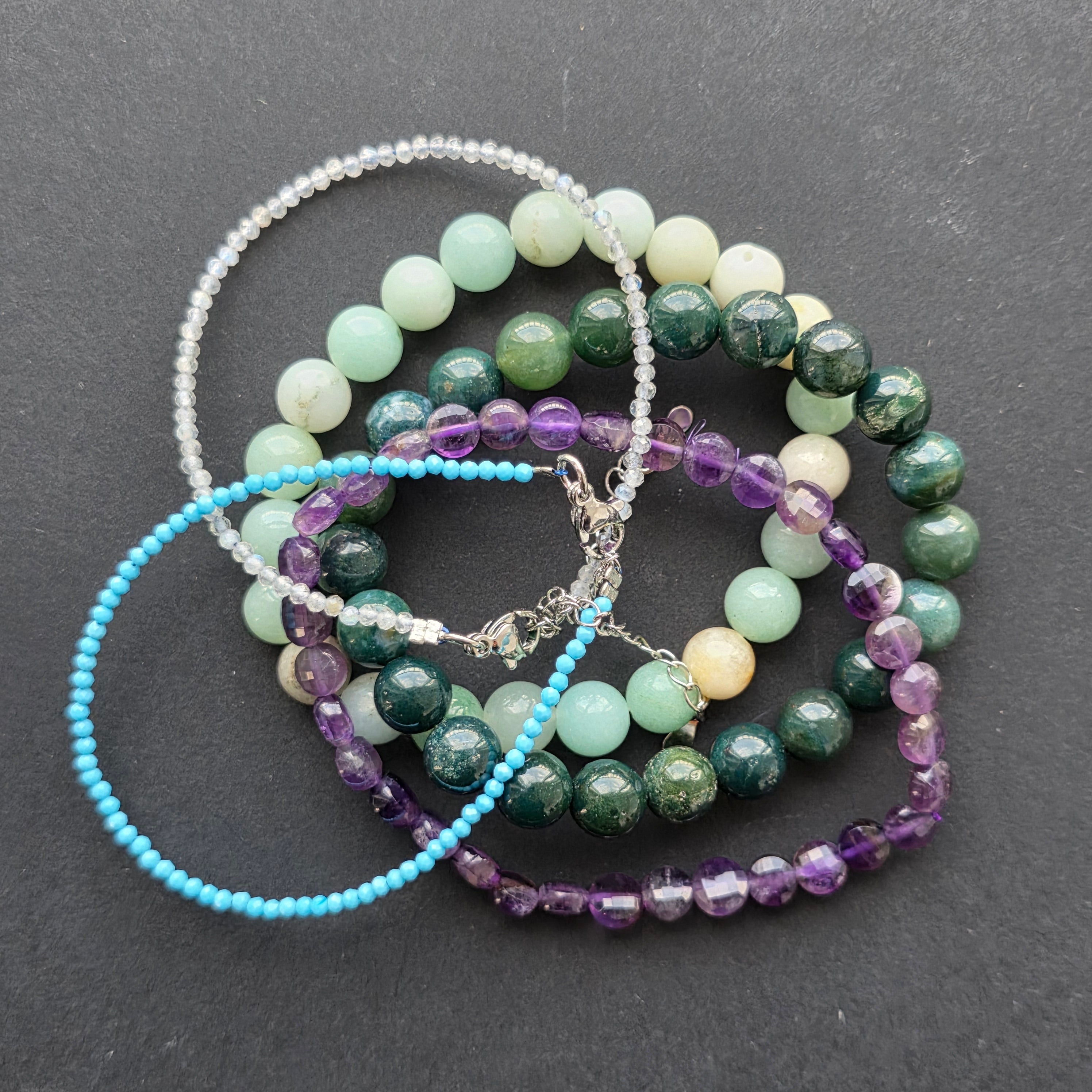 L’améthyste de 4 mm offre calme, intuition et équilibre, tempérant les impulsions et ouvrant un espace pour la clarté.
