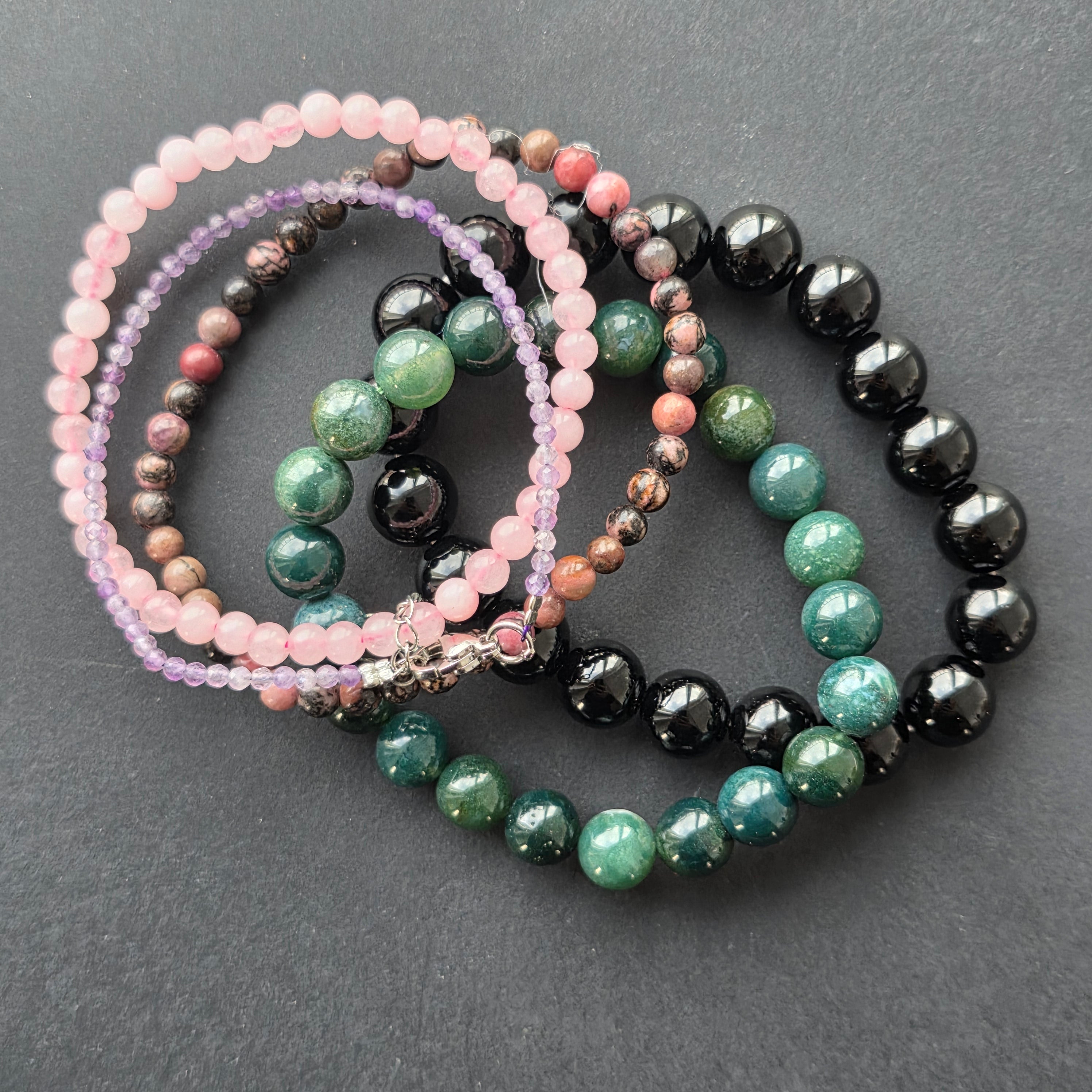 L’améthyste de 4 mm offre calme, intuition et équilibre, tempérant les impulsions et ouvrant l’espace à la clarté.